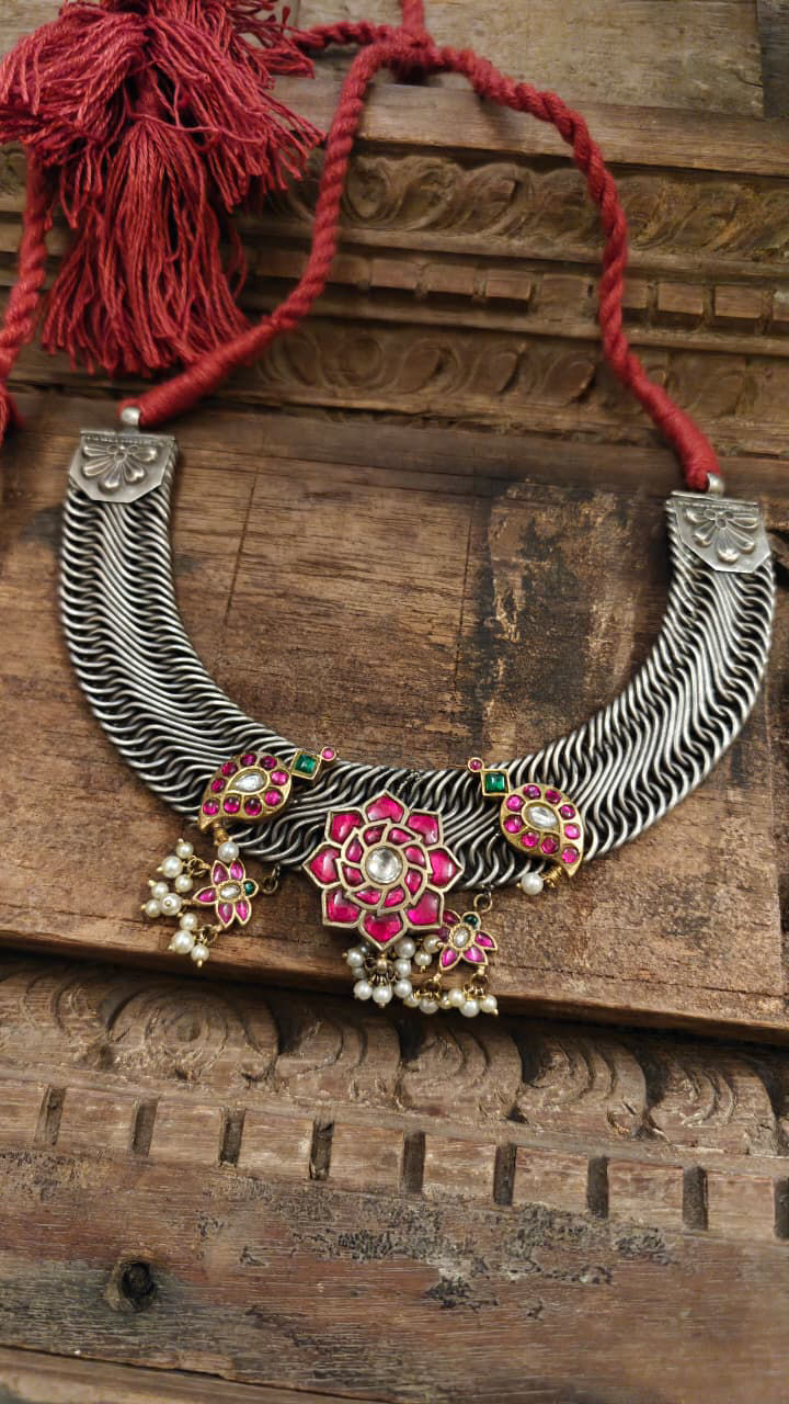 Vintage silver, adorned with pendants in kemp stone and a whisper of pearls. A timeless piece that carries the charm of heritage with the finesse of handcraft. Handcrafted in 92.5 silver at Svasa. 📦 Ships within India. Please Note: ✨ As each jewellery piece is crafted with care, we’re unable to offer exchanges or returns. ✨ If your order reaches you with any damage, please record an unboxing video and share it with us. We’ll be happy to make things right for you.