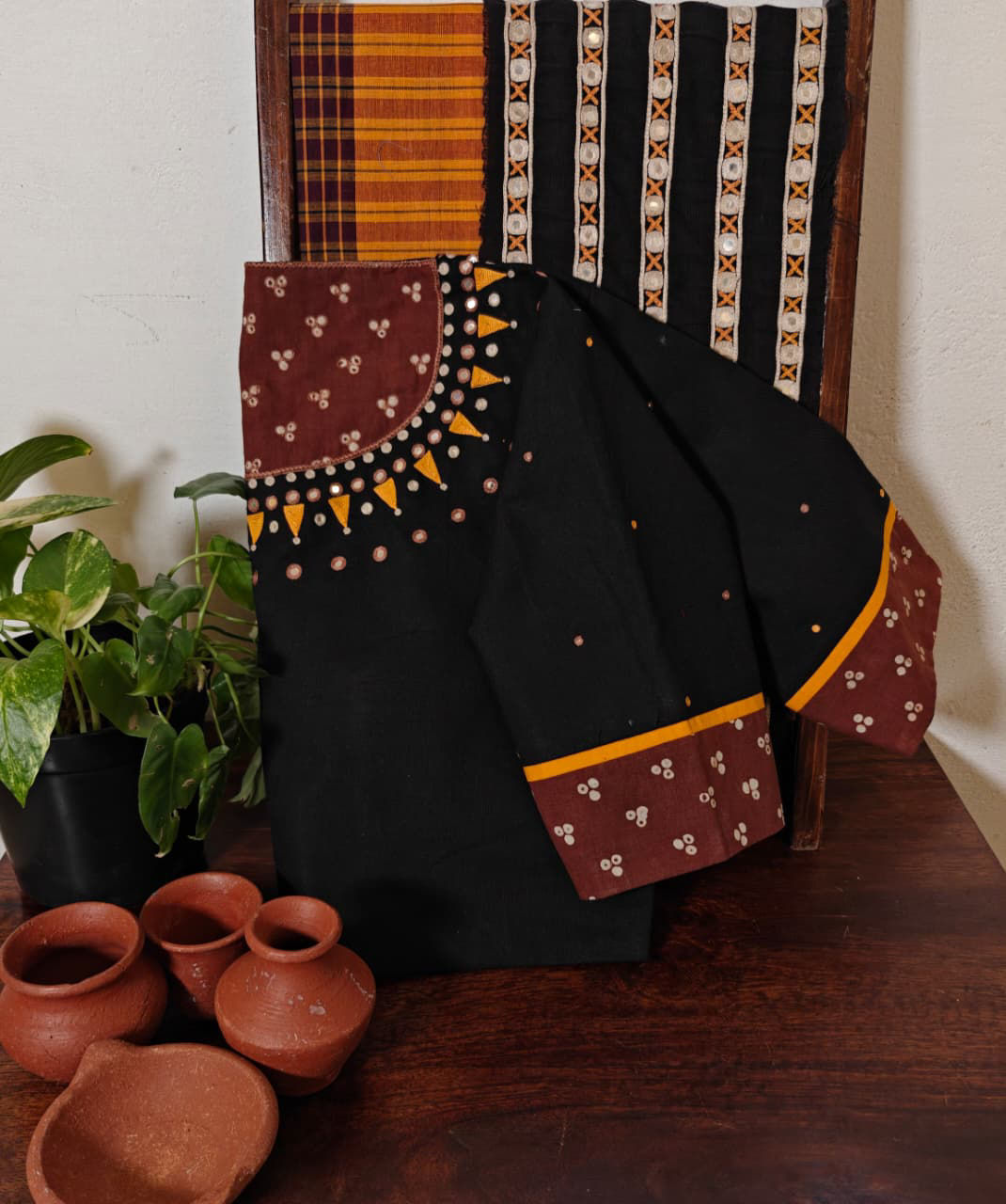 In rich cinnamon brown, appliquéd in a semi-circle and framed with geometric embroidered borders. A handcrafted revival — bold, earthy, and beautifully Svasa. 🤎