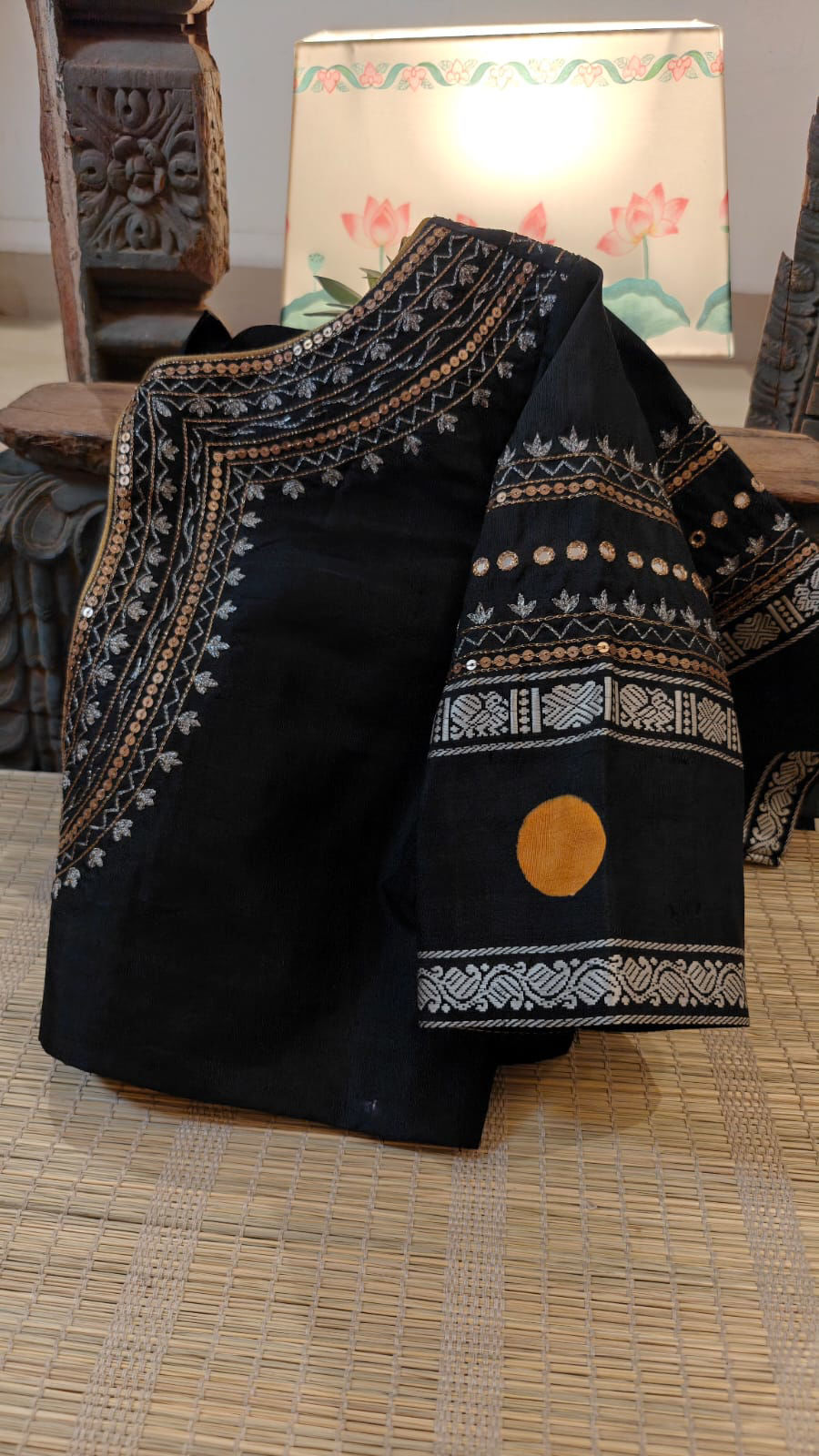 Pure black Kanjivaram silk with Annam korvai borders woven in ivory — a heritage weave reimagined. Block-printed with cheerful yellow dots and embroidered in beaten gold, blended with antique silver and gold tones for a two-tone shimmer. ✨ Handwoven artistry. Handcrafted by Svasa.