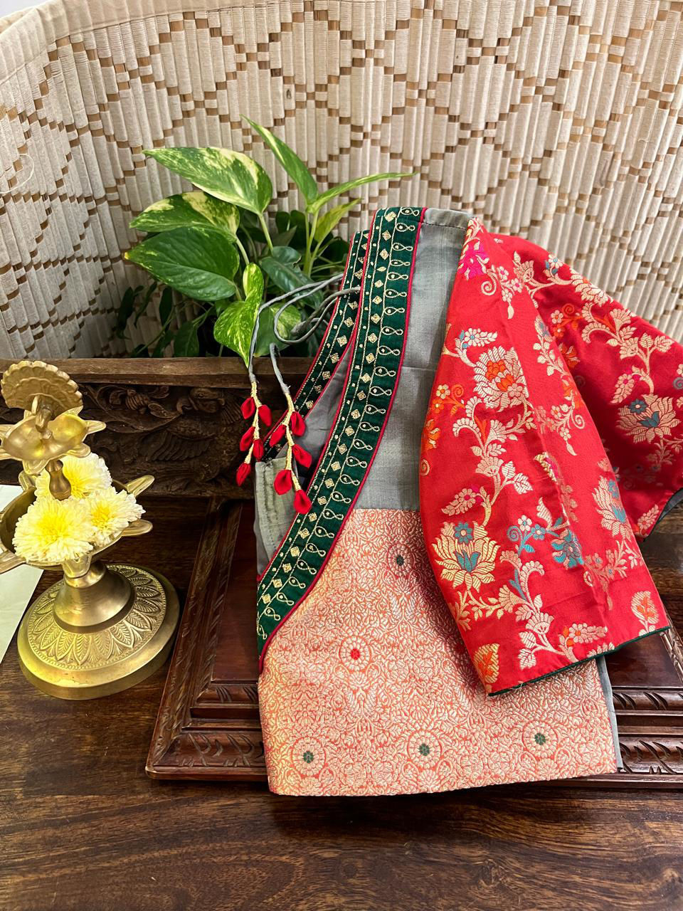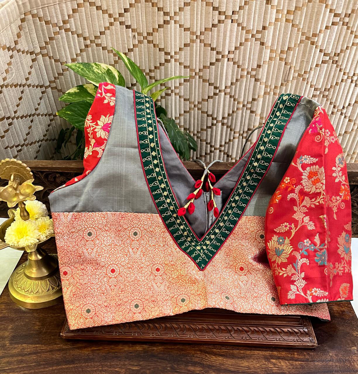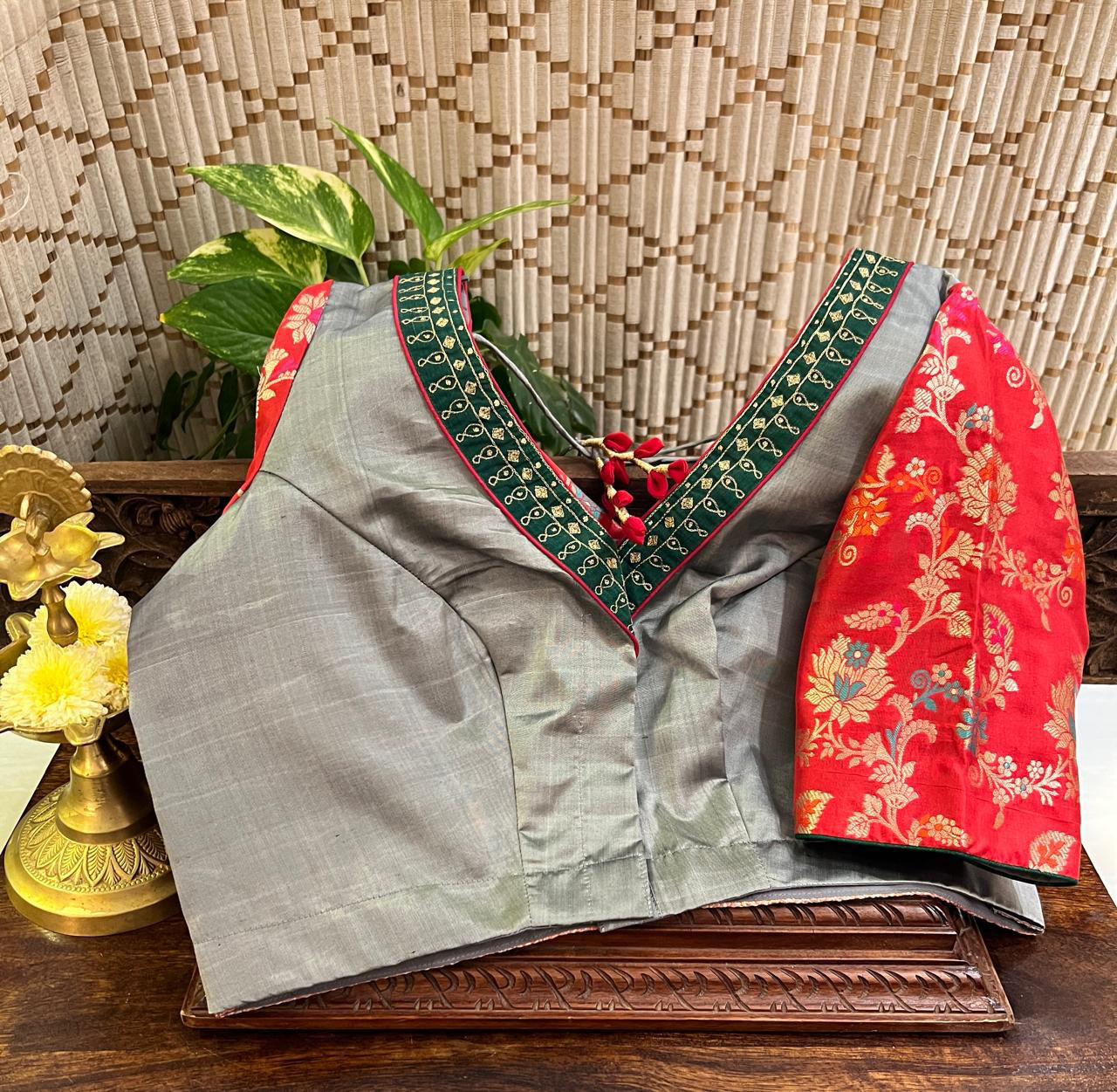 A Svasa classic — where calm meets bold. 🌫️❤️🌸 Ash grey pure silk paired with a fusion of red and blush pink brocade, intricately embroidered with gold along the V-neck. An exquisite play of textures, tones, and timeless craft. 🪡