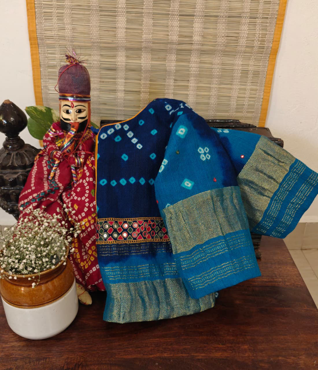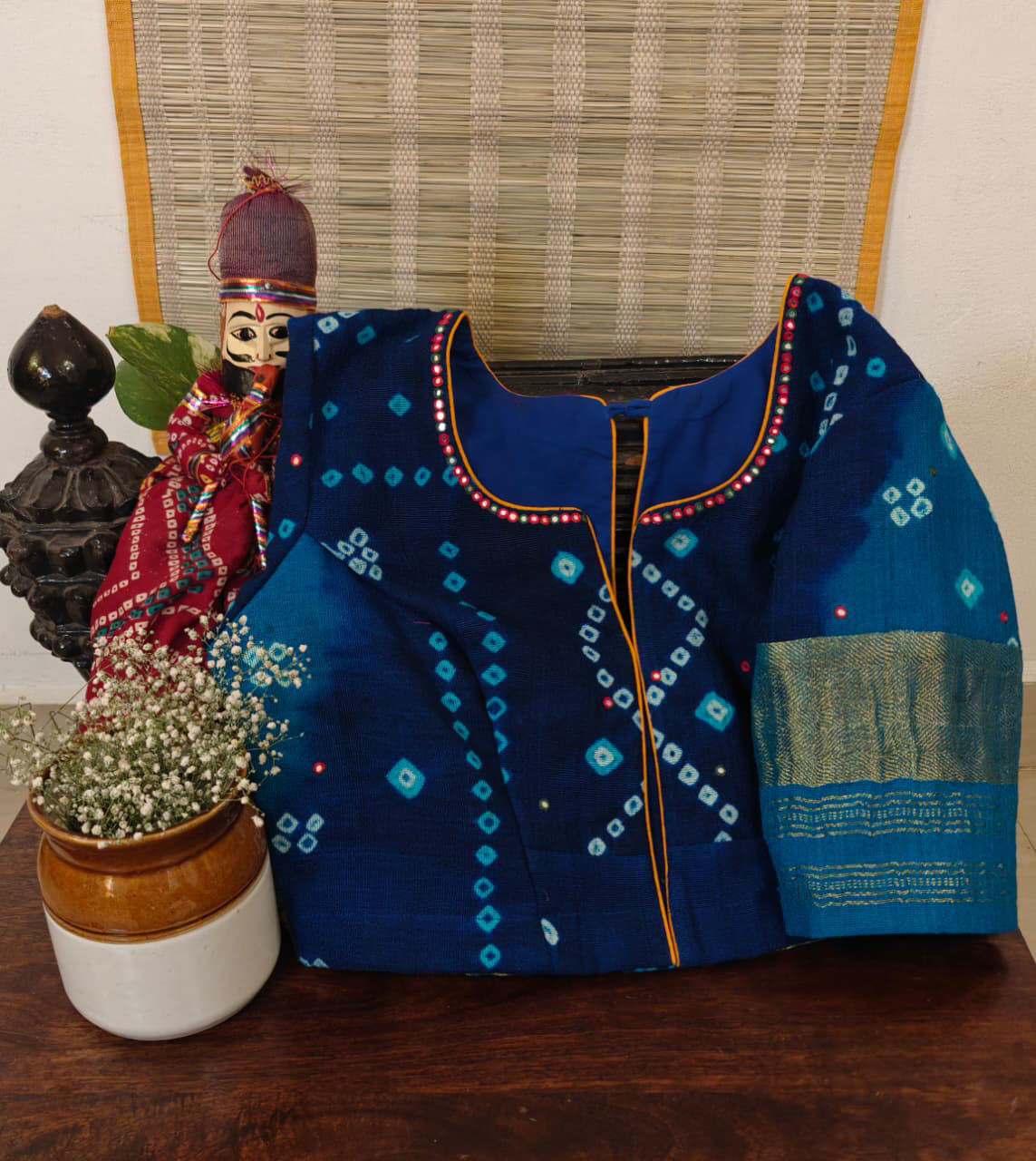 A splash of blue bandhani brought alive with colorful hues β€” festive, bold, and handmade to stand out in every crowd. 🌿πŸͺ‘
