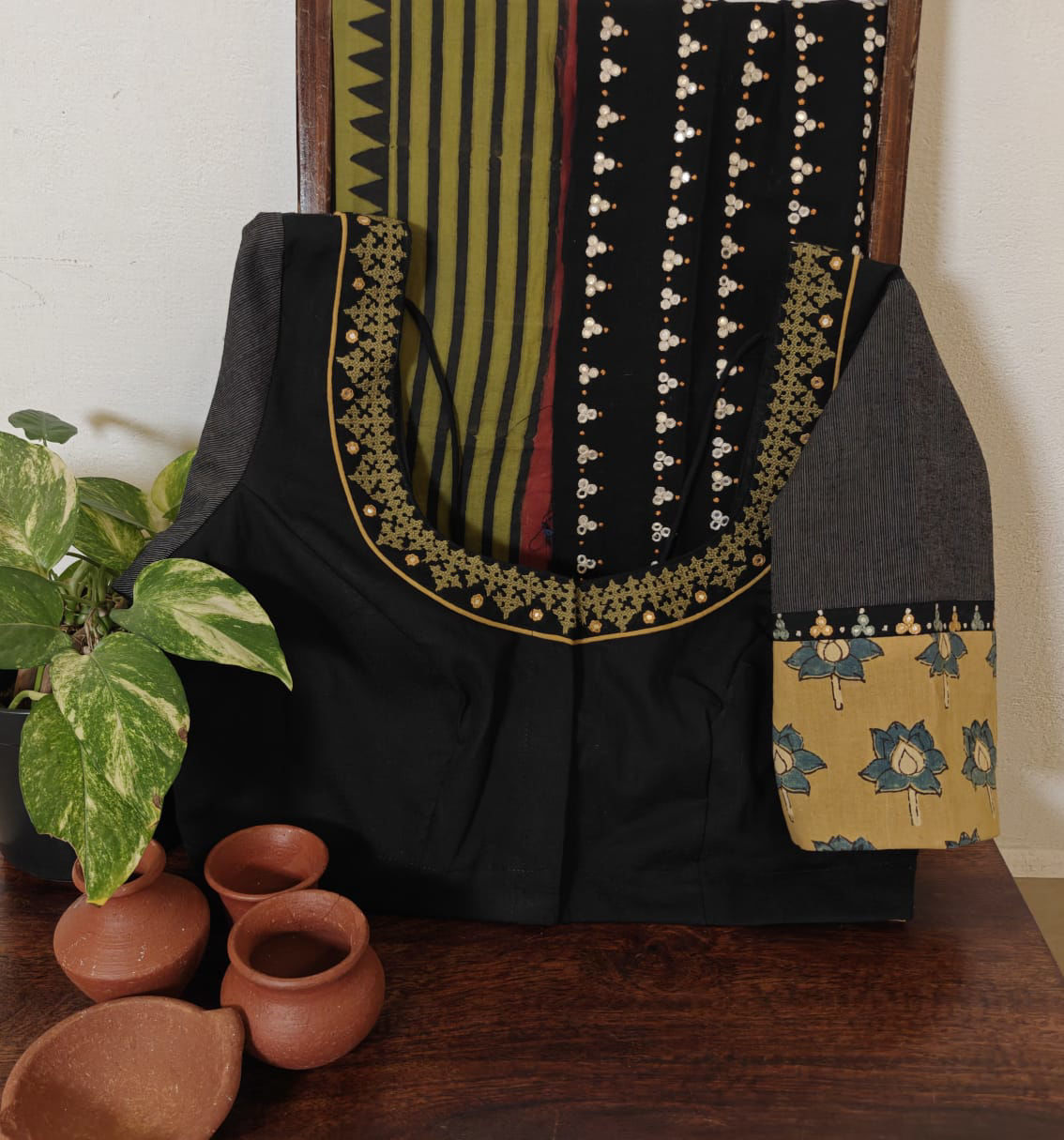 Our artisans creatively hand embroider, hand paint and hand print the blouses that come to you from the design house of SVASA. We use hand woven fabric extensively. You may notice very minute, almost insignificant flaws in the crafts since they are all handmade. We urge our patrons to overlook a few human errors that may have occurred in the process. Our aspirations are towards an empowered society, focusing on keeping traditional needlecraft alive for a long time to come.