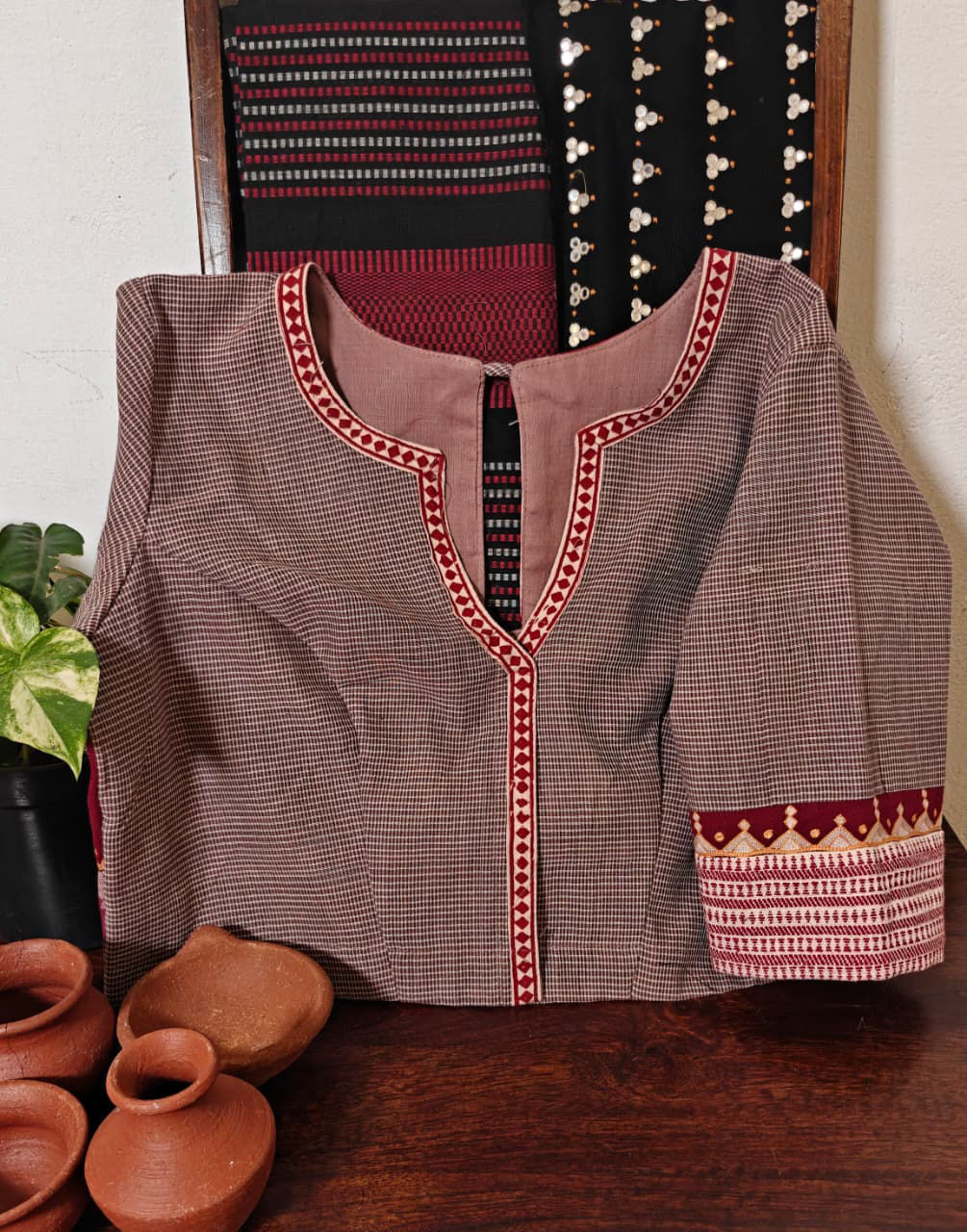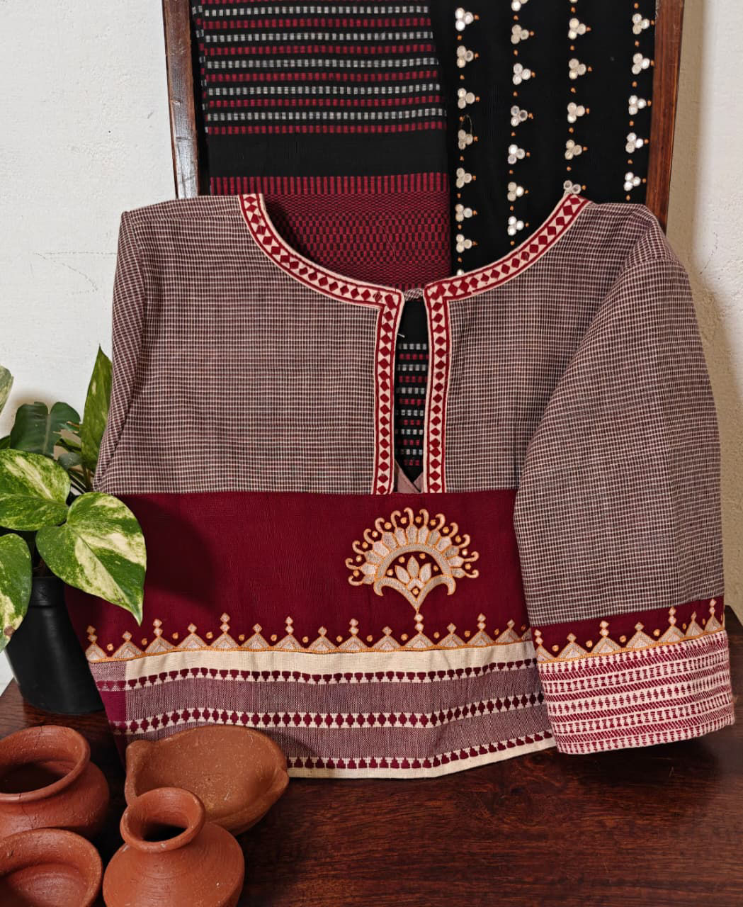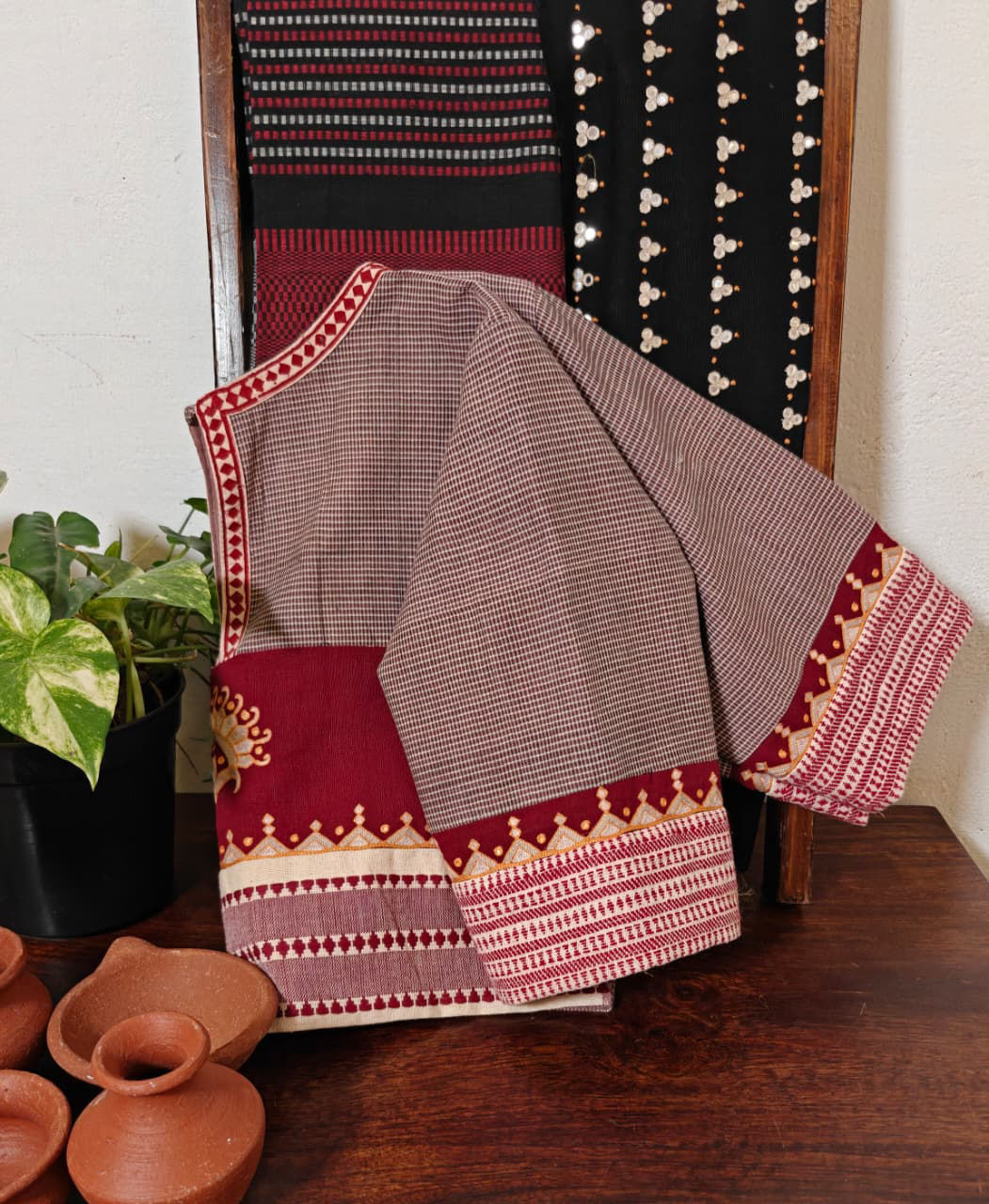 Gomi checks paired with a striking kotpad red, detailed with tribal borders and a bold motif in shades of ivory. 🪡🌿 A piece that celebrates tradition, texture, and the strength of handmade craft. ✨
