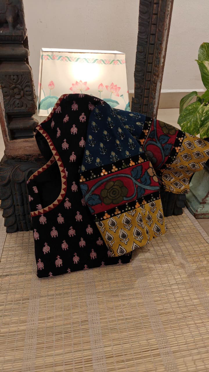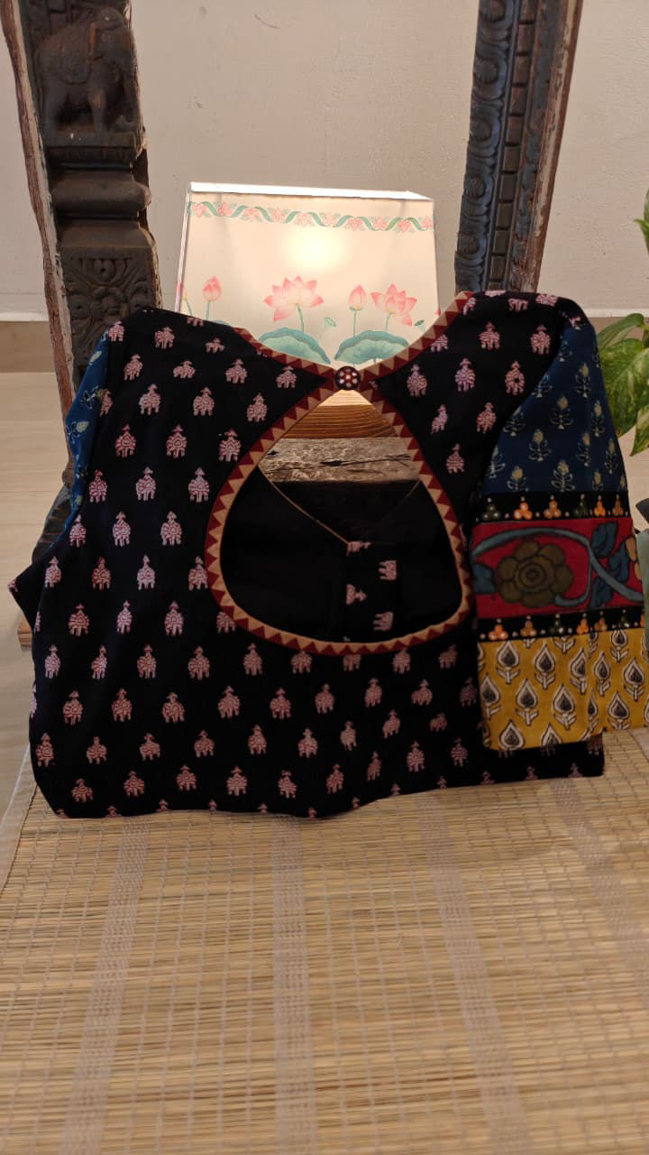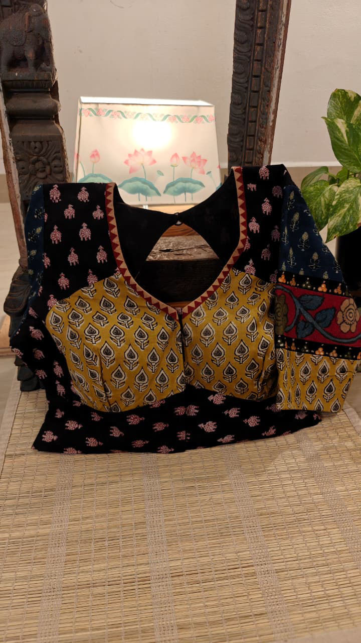 A fusion choli in charcoal and fenugreek, with a playful dash of indigo to lift the weave. Prints blend seamlessly, while Mughal-inspired embroidery graces the sleeves with quiet charm. A handcrafted cotton creation — earthy, timeless, and beautifully Svasa.