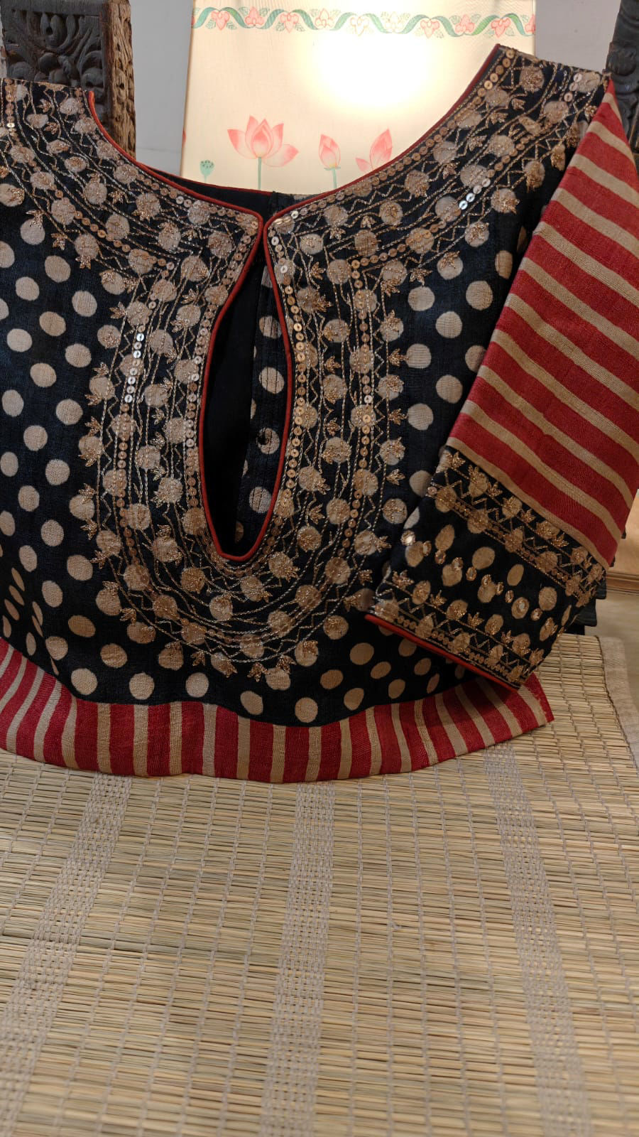 Pure tussar silk in shades of charcoal and rust — timeless and rich. Adorned with our exquisite vintage beaten gold embroidery, and playful polka dots that never go out of style. 🪡 Classic. Handcrafted. Svasa.