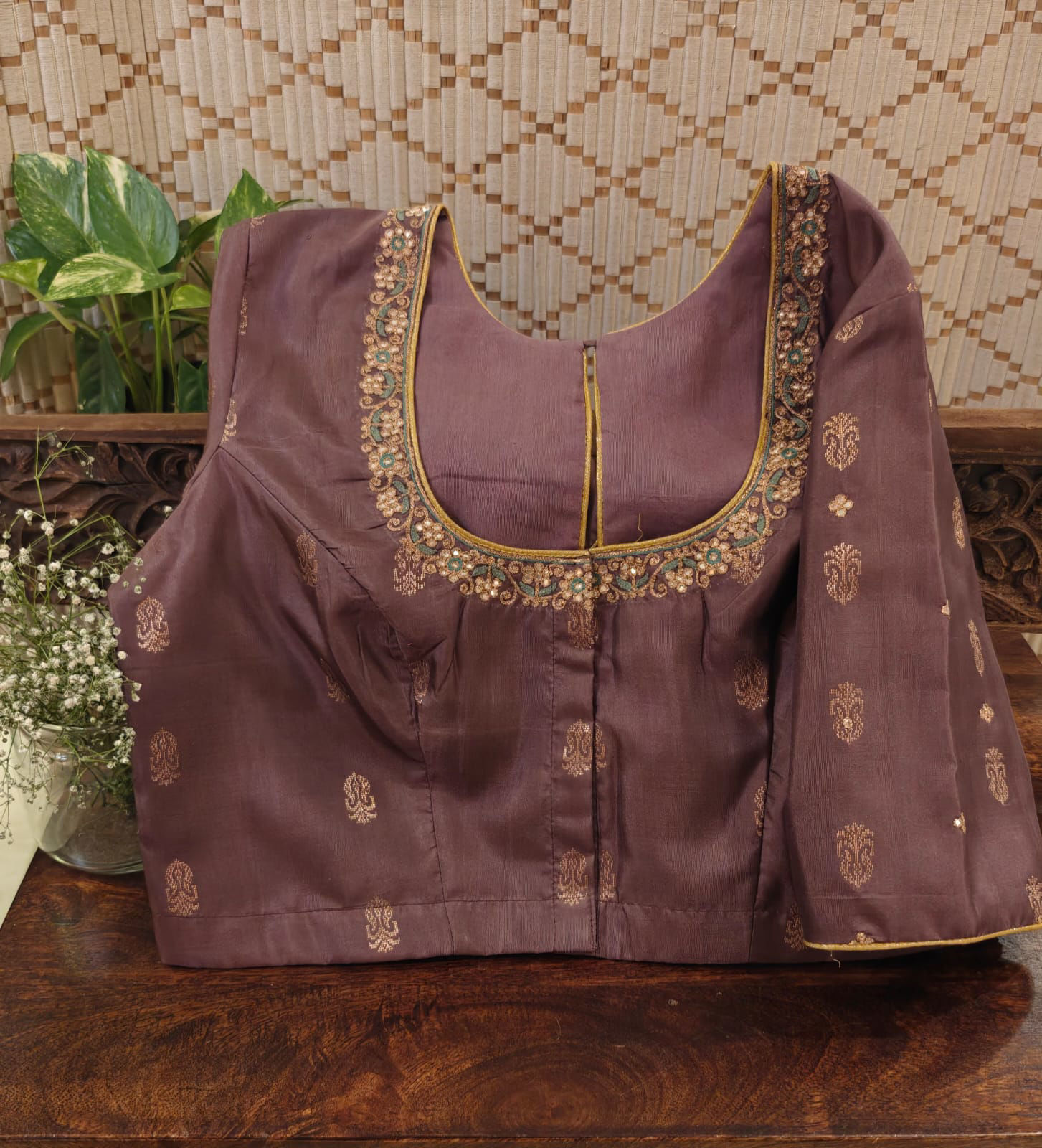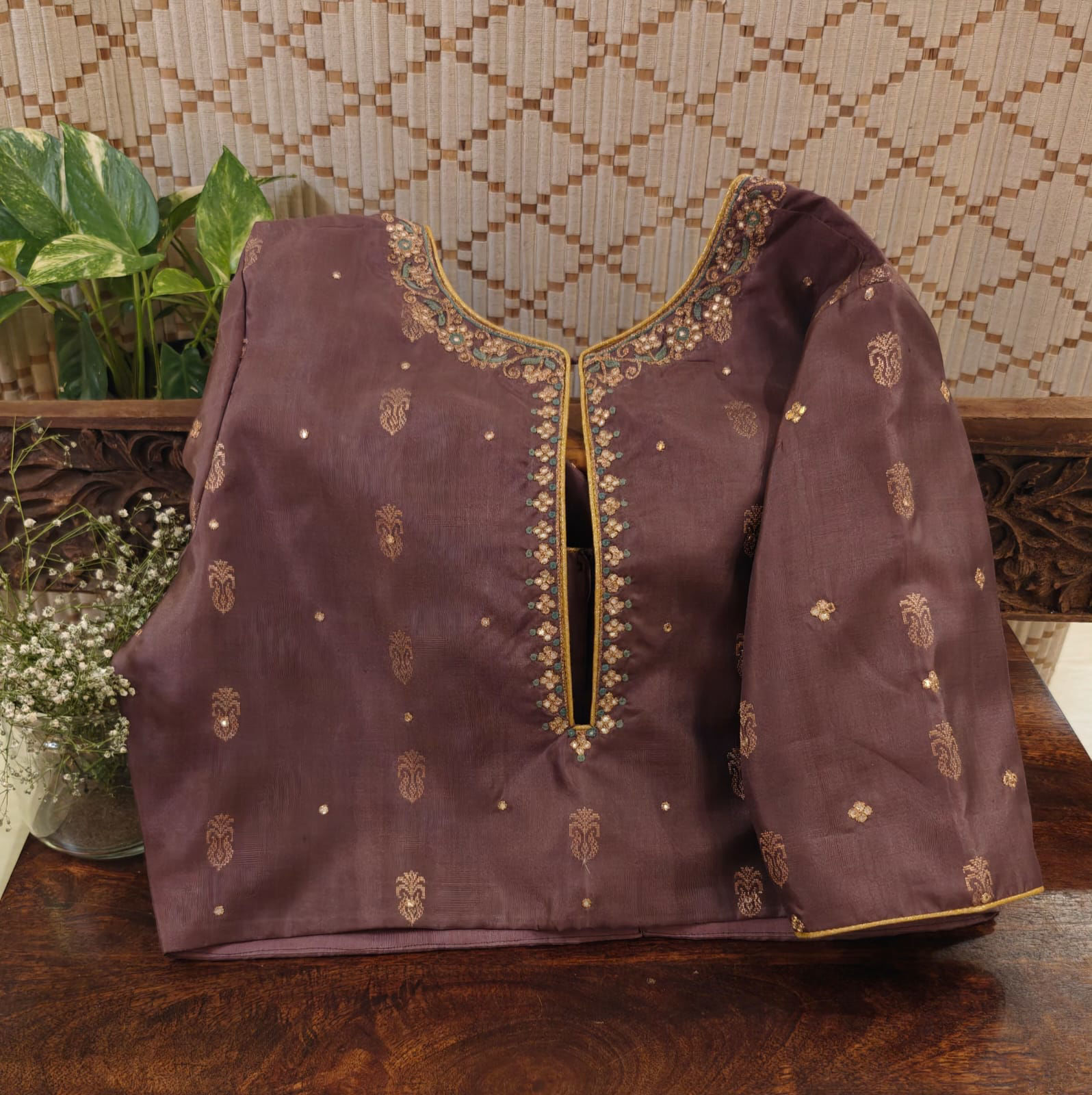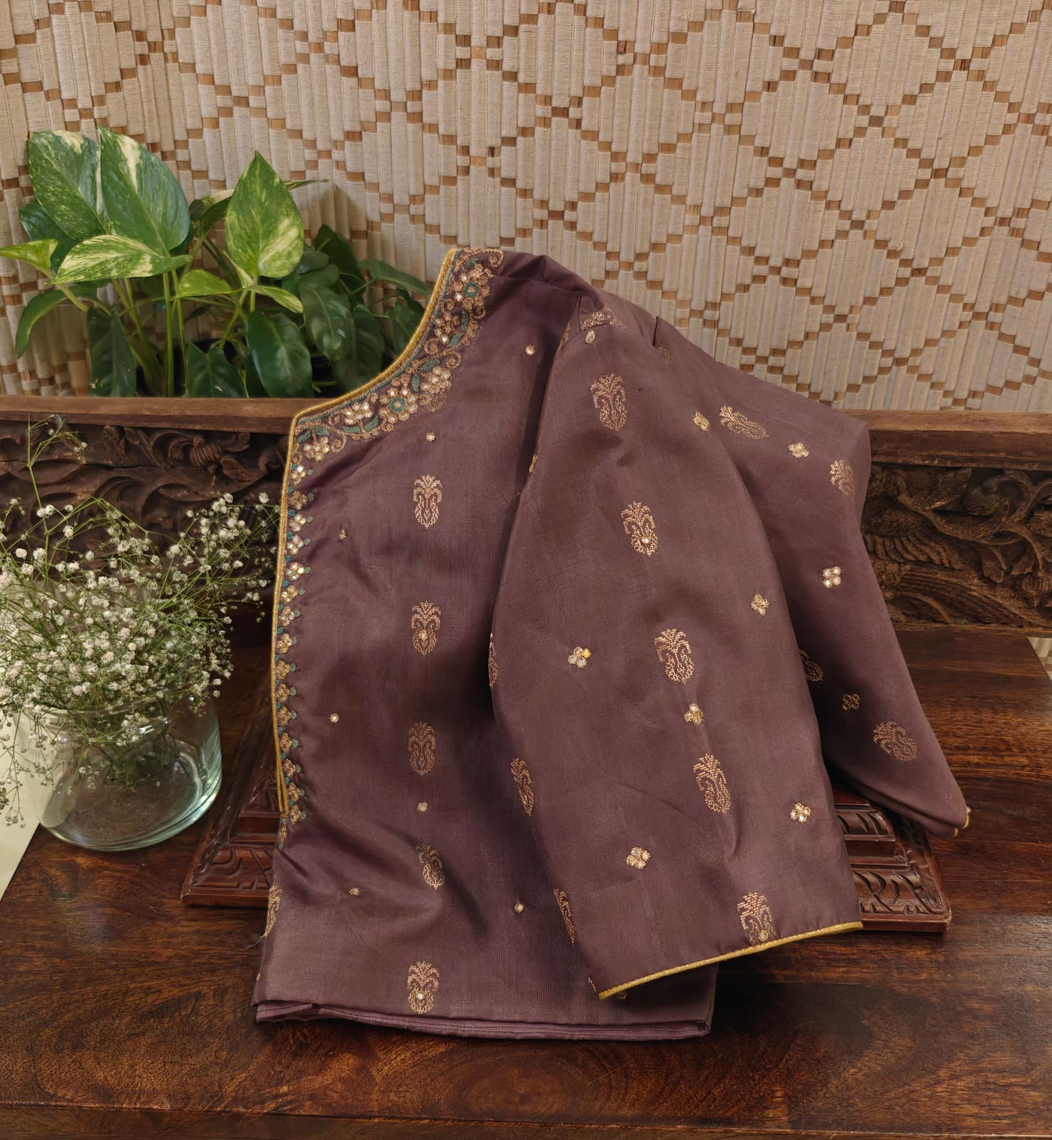 Pure Kanjivaram silk in warm cinnamon, woven with gold and kissed with a dash of blue. A refined slit neck adds character, making this blouse a versatile classic for festive and timeless drapes. 🪡 Handcrafted. Eternal. Svasa.