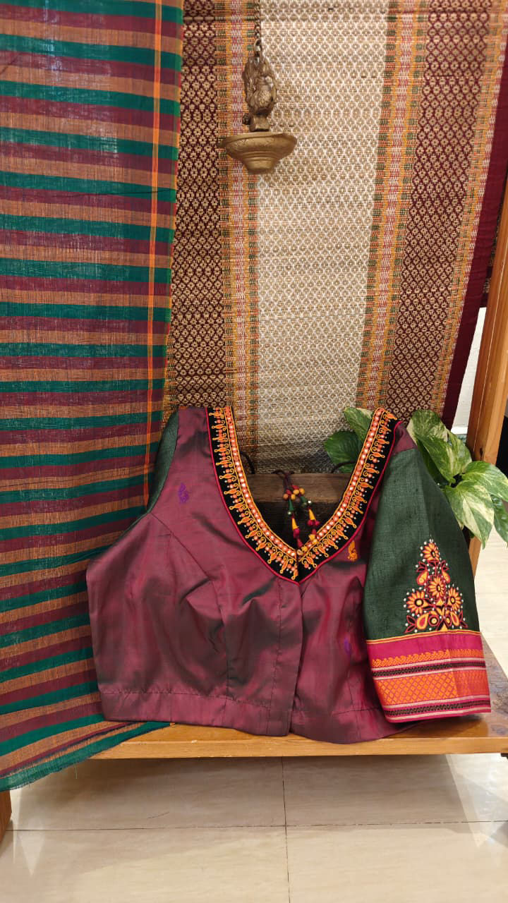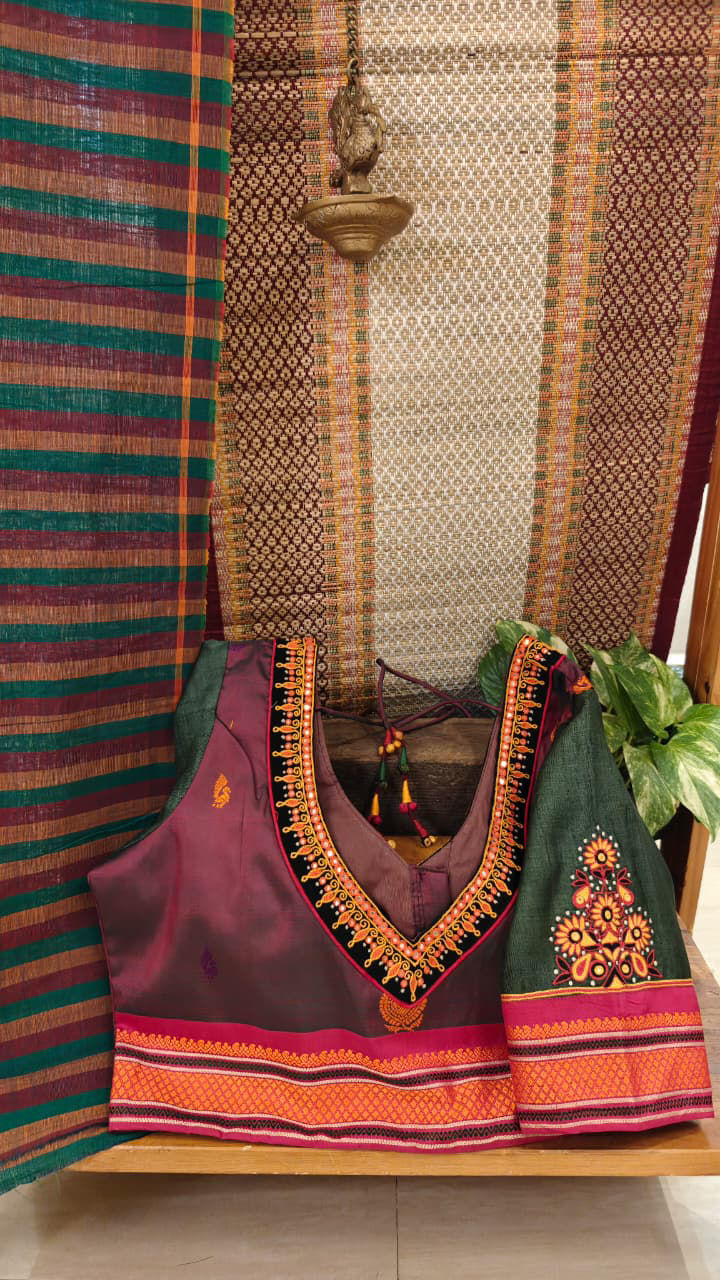 A masterpiece in pure Kanjivaram silk – double-shaded hues that glow with tradition, paired with sleeves in rich mehendi green. 🌿 Intricately embroidered motifs on the sleeves bring out the charm of handwork, making this blouse a true heirloom from Svasa. 🪡💛