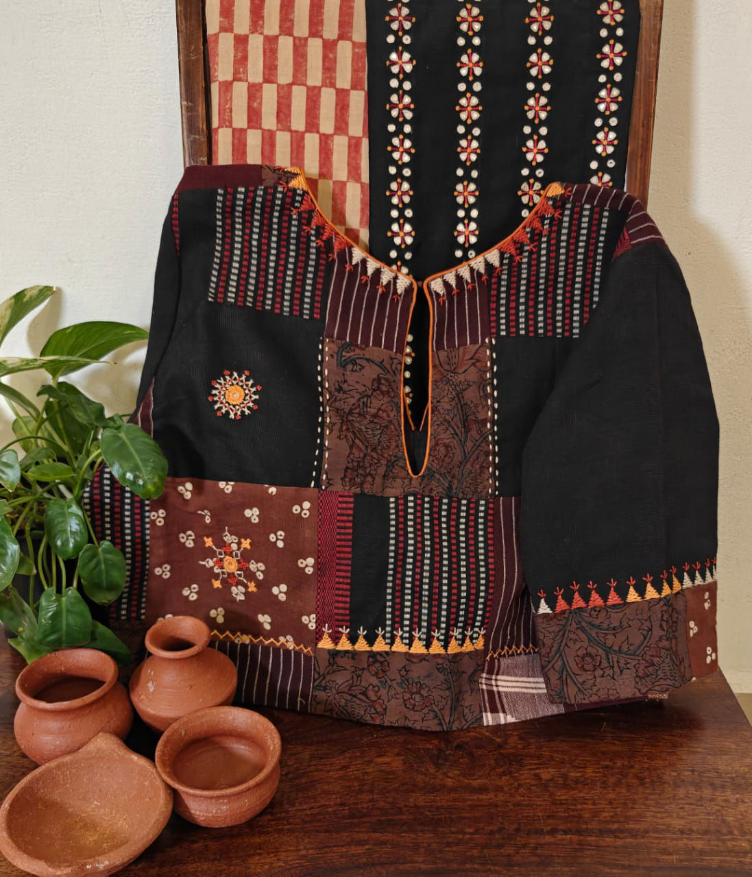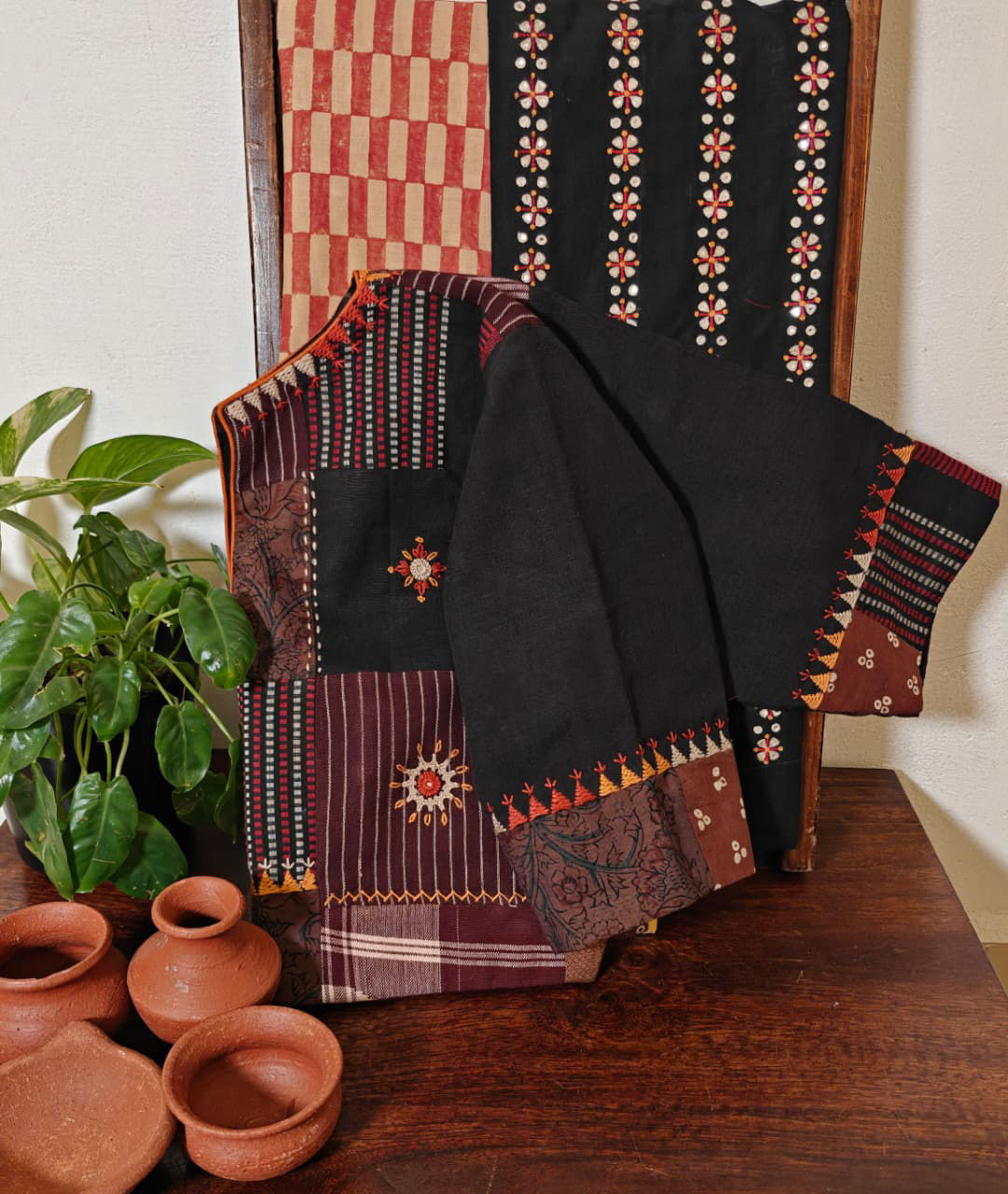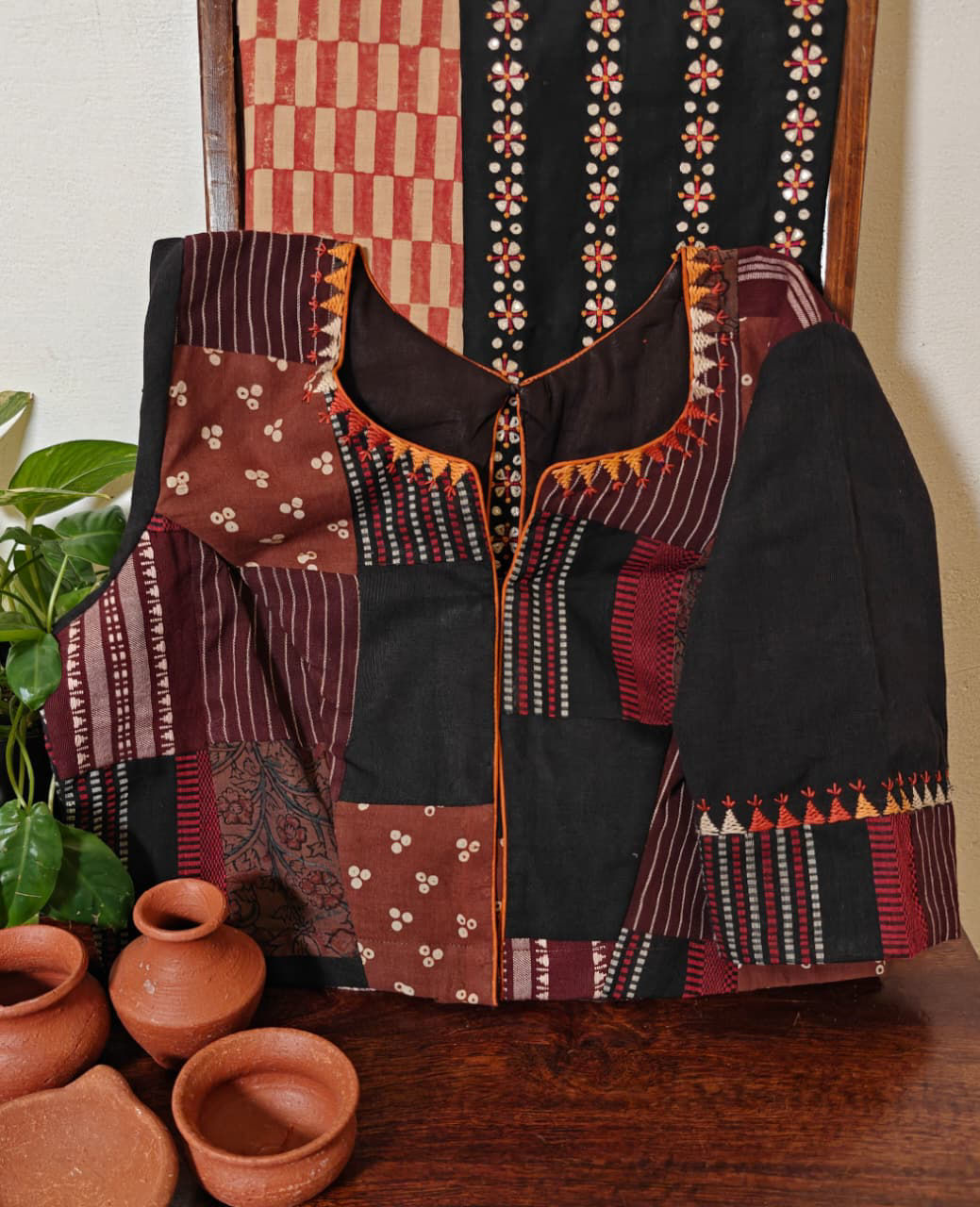 Shades of brown patches fused together, bringing alive the story of sustainable craft and revival. Rustic, mindful, and one-of-a-kind โ€” a blouse that carries heritage in every weave. ๐Ÿงต๐ŸŒพ