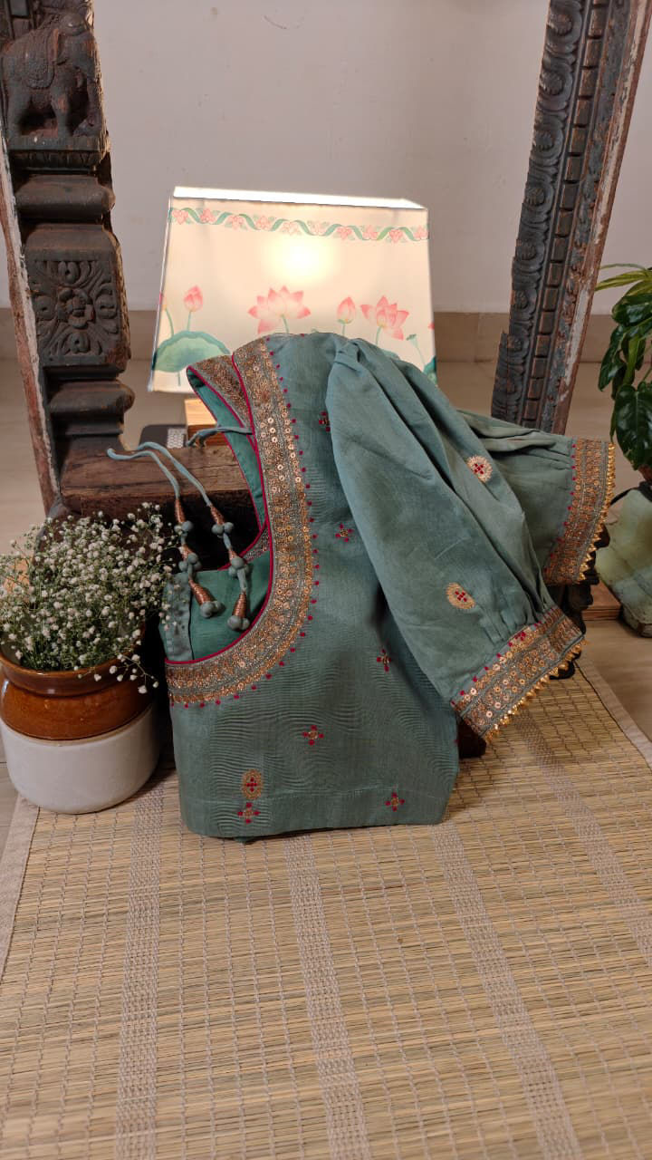 Chanderi in deep emerald green with a touch of sage, detailed with gold embroidery around the neck and sleeves. Finished with a classic puff sleeve β€” subtle, festive, and truly handcrafted at Svasa. πŸŒΏπŸ’«