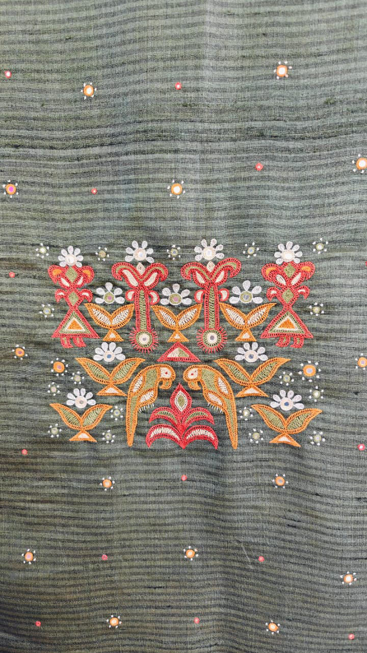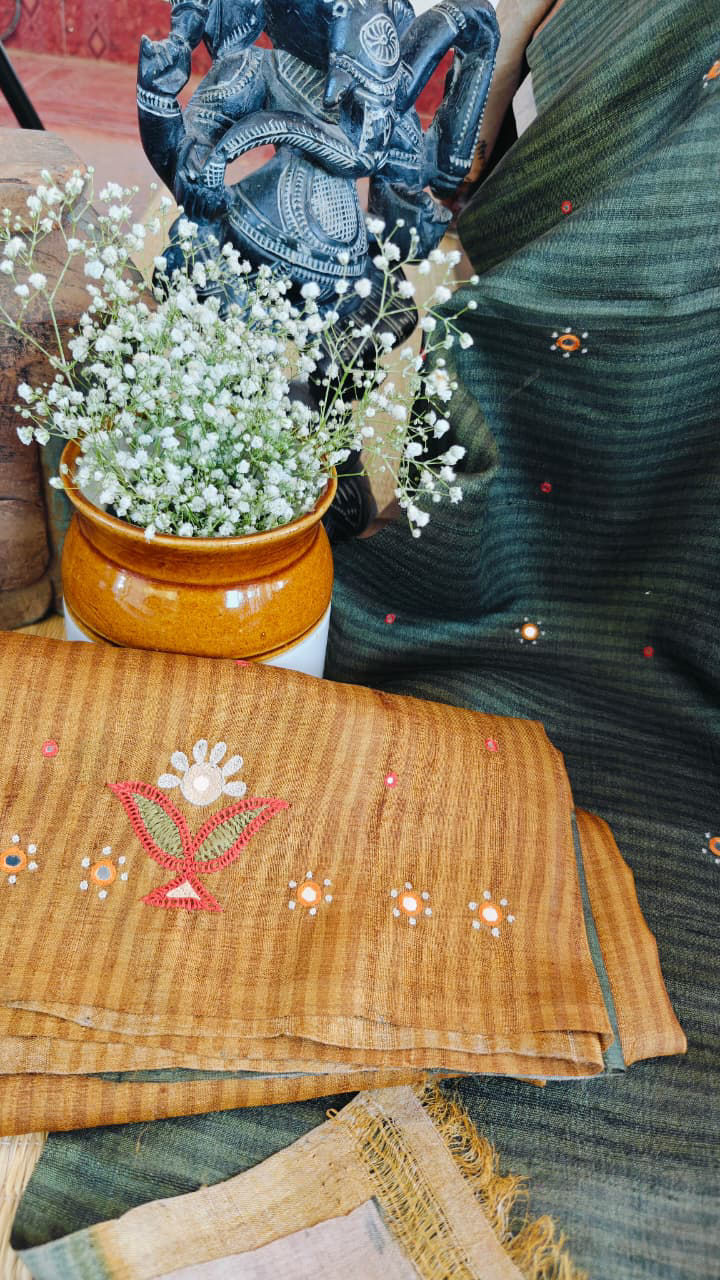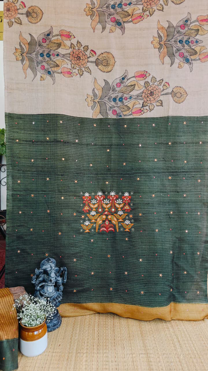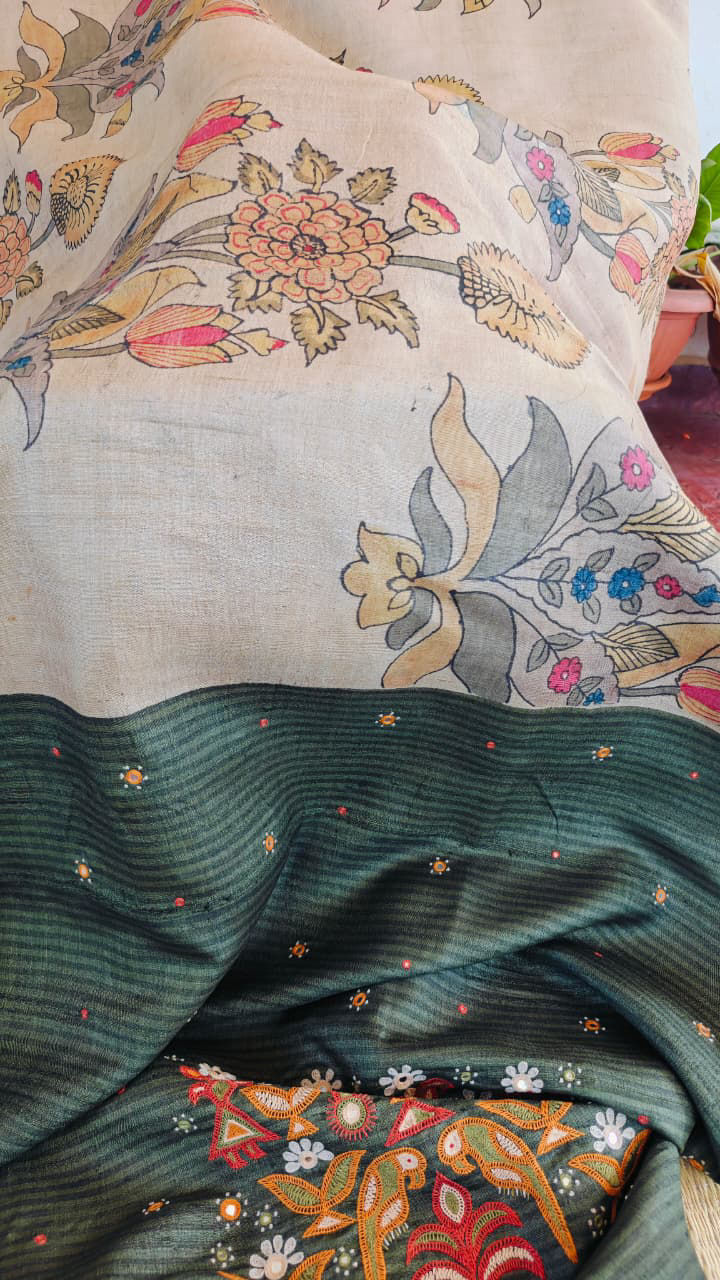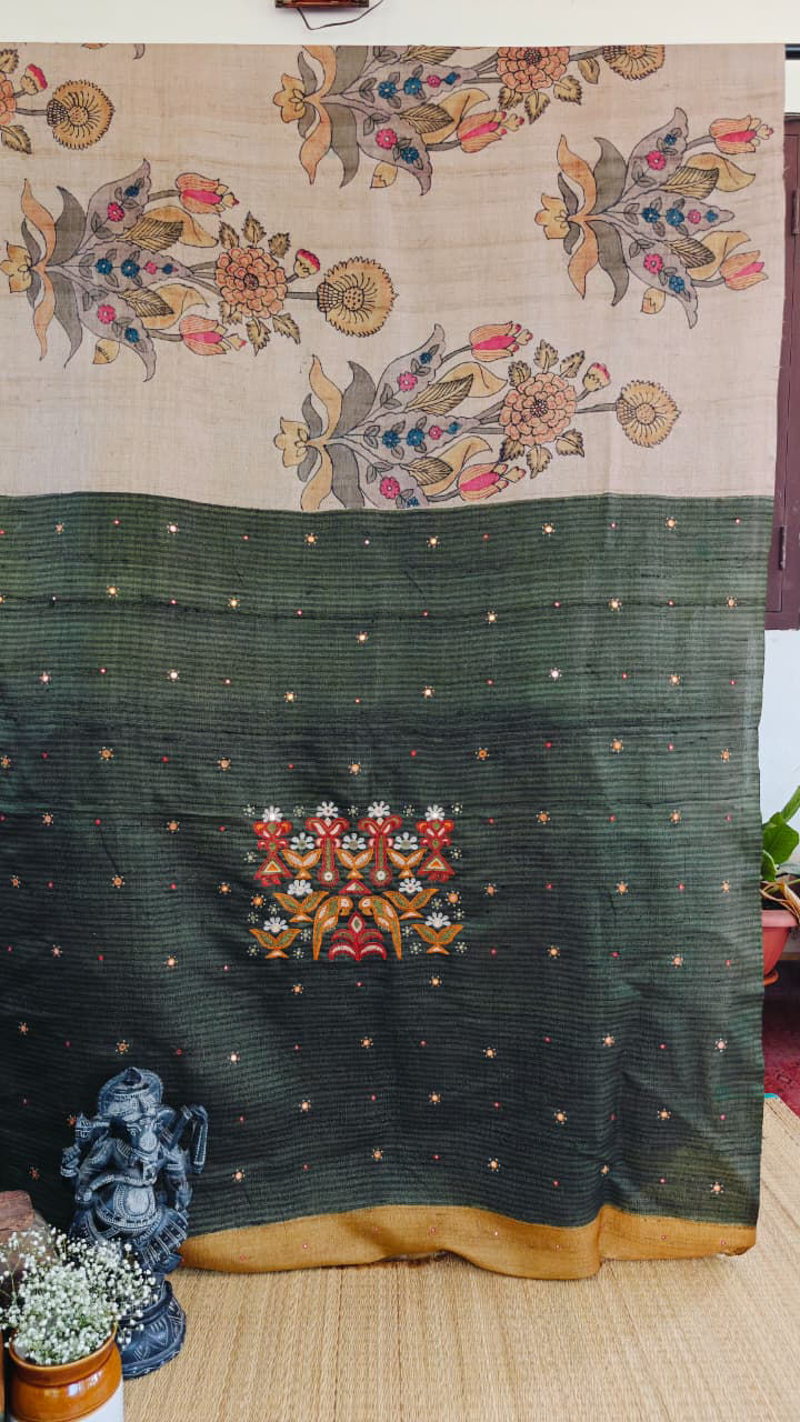 A pure tussar, dyed in natural hues, adorned with hand-painted Kalamkari and highlighted with folk embroidery on the pallu. Matching motifs flow into the blouse, tying the story together in harmony. In all, a masterpiece created exclusively at Svasa — where tradition meets timeless craft 🪡💛