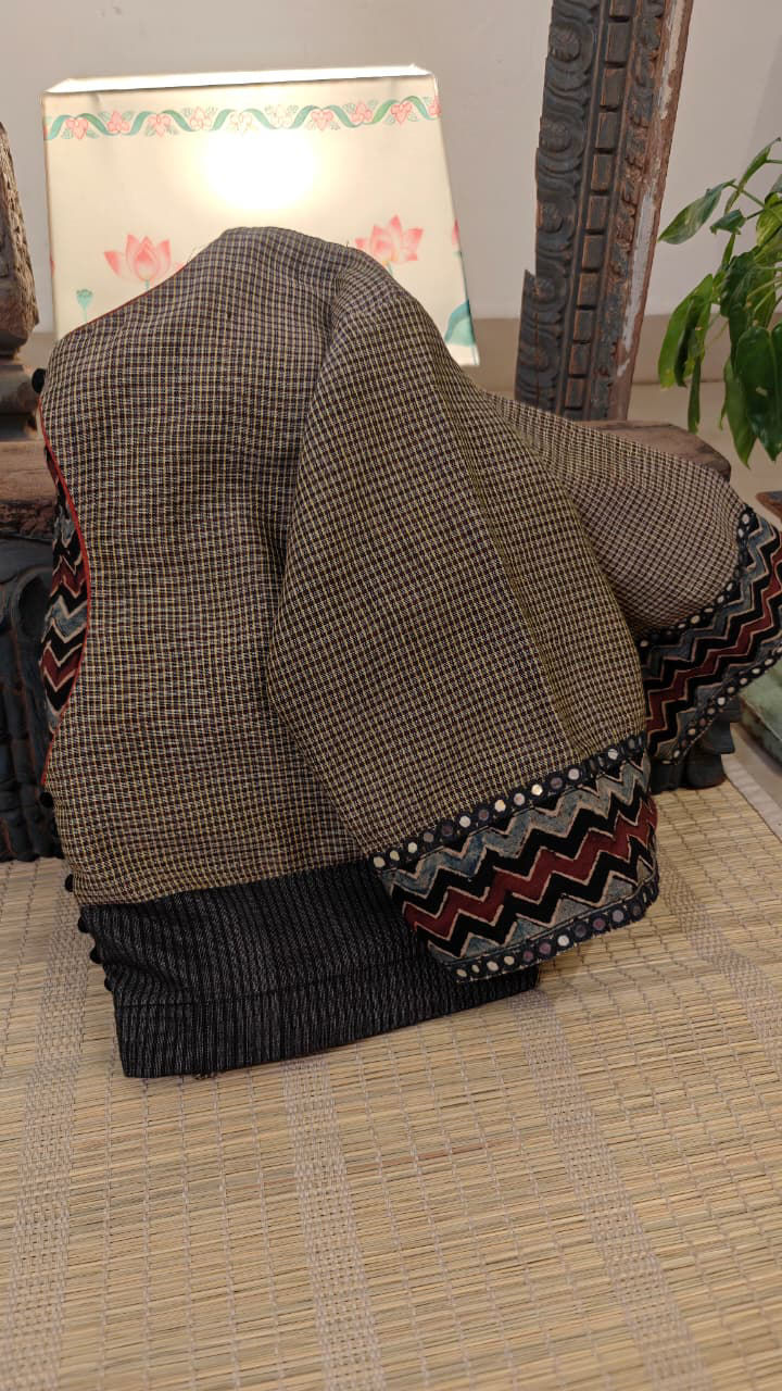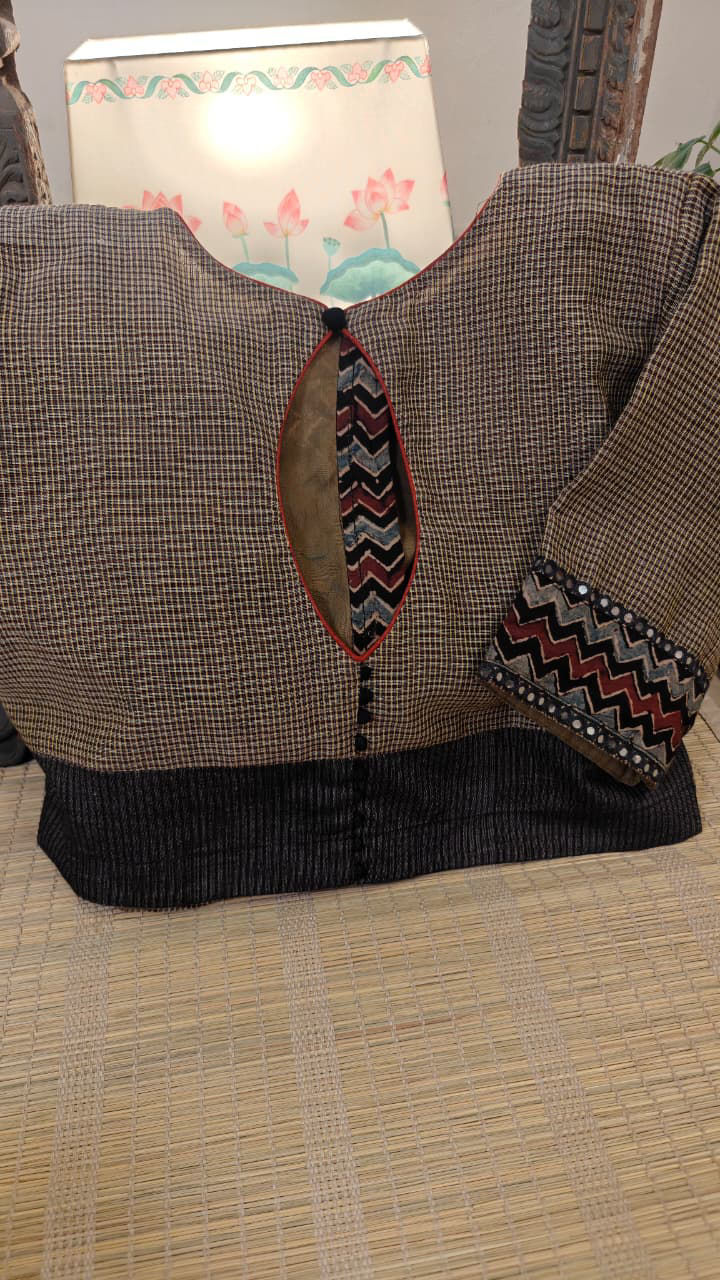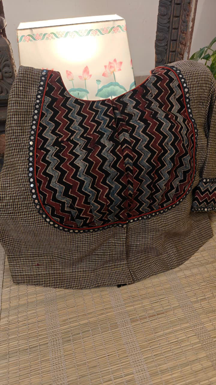 A Bhopali-style yoke crafted in rich Ajrakh rests gracefully on Gomi checks, merging tradition with rhythm. The neckline is outlined with mirrors, reflecting the essence of handmade artistry and tribal beauty. ✨ Rustic charm, rooted craft — every stitch tells a story.