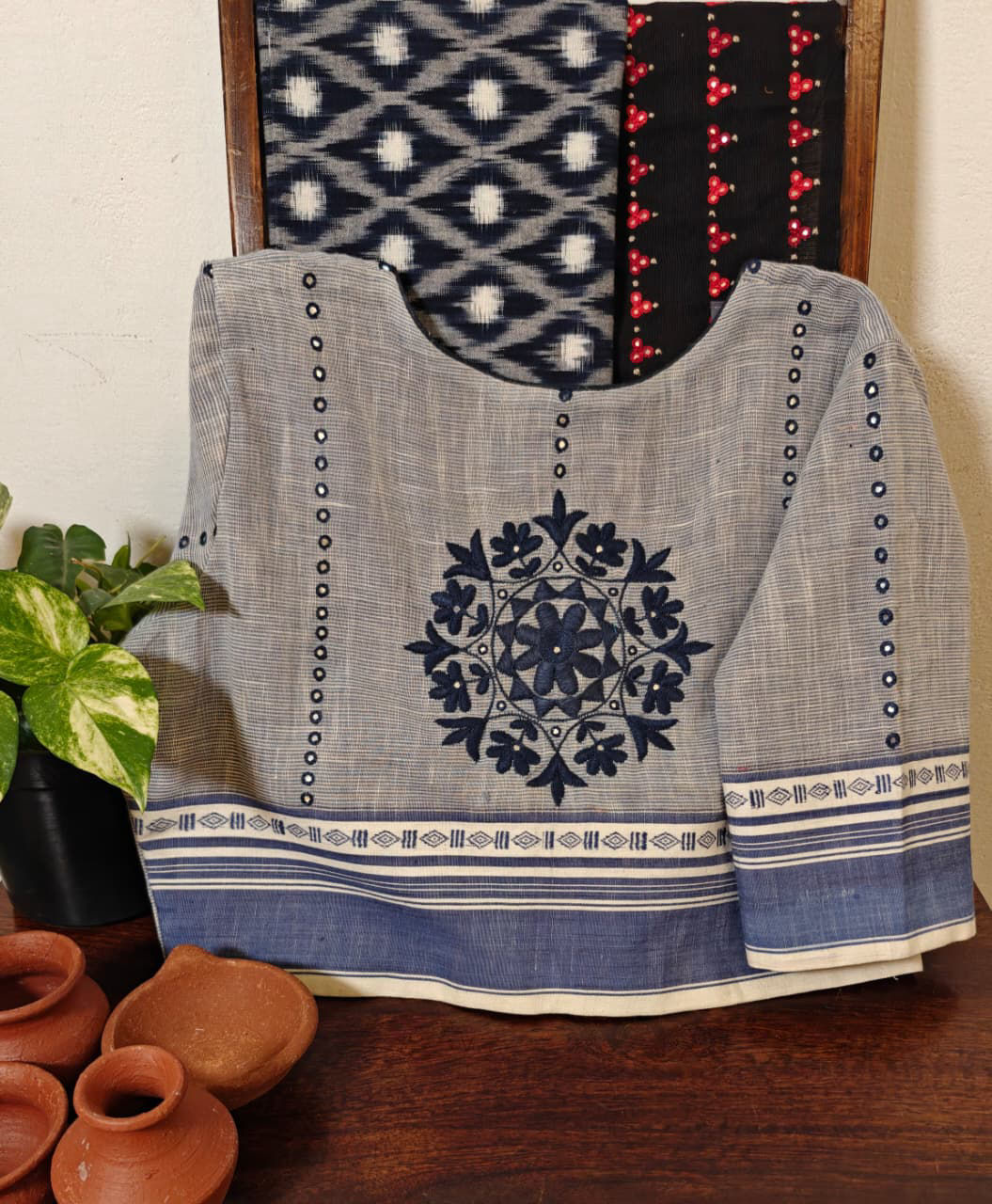Our artisans creatively hand embroider, hand paint and hand print the blouses that come to you from the design house of SVASA. We use hand woven fabric extensively. You may notice very minute, almost insignificant flaws in the crafts since they are all handmade. We urge our patrons to overlook a few human errors that may have occurred in the process. Our aspirations are towards an empowered society, focusing on keeping traditional needlecraft alive for a long time to come.