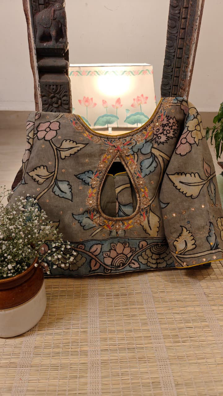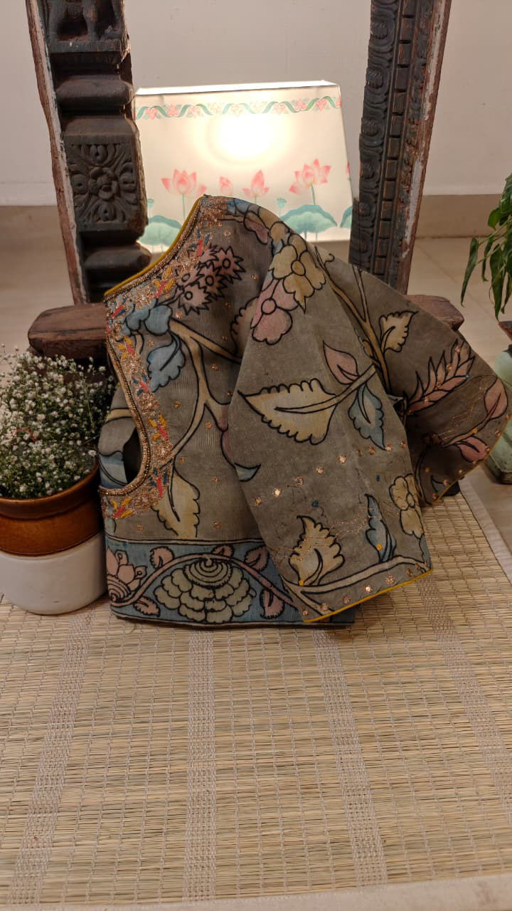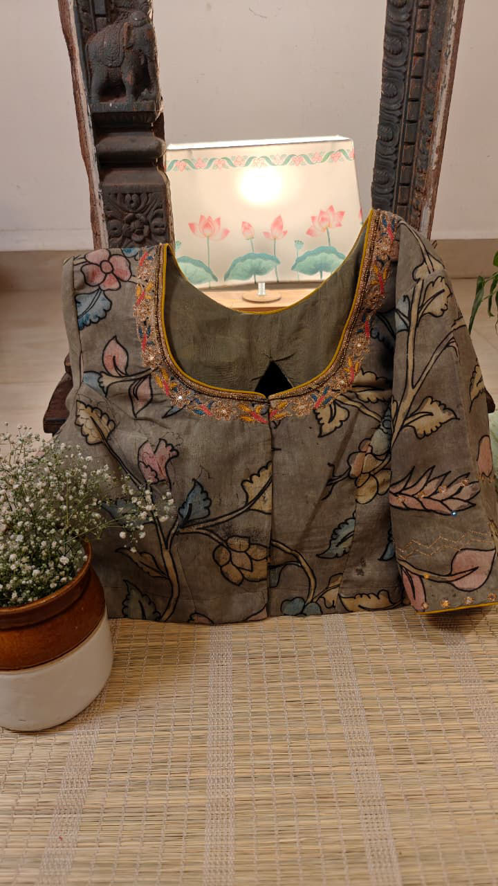 Modal silk with hand-painted Kalamkari, highlighted with gold and threads embroidered beautifully around the drop neck. A work of art, timeless and one-of-a-kind. 🪡
