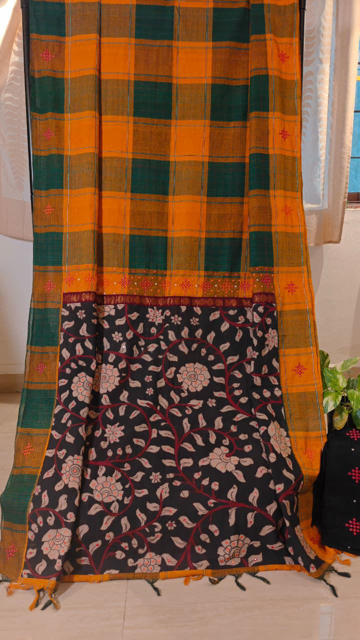 A bold play of yellow & green checks woven with tradition. The kalamkari pallu adds its timeless story. Paired with a striking charcoal blouse adorned with kolam motifs – a match made in Karaikudi’s looms. 🌾 Traditional yet forever unique.