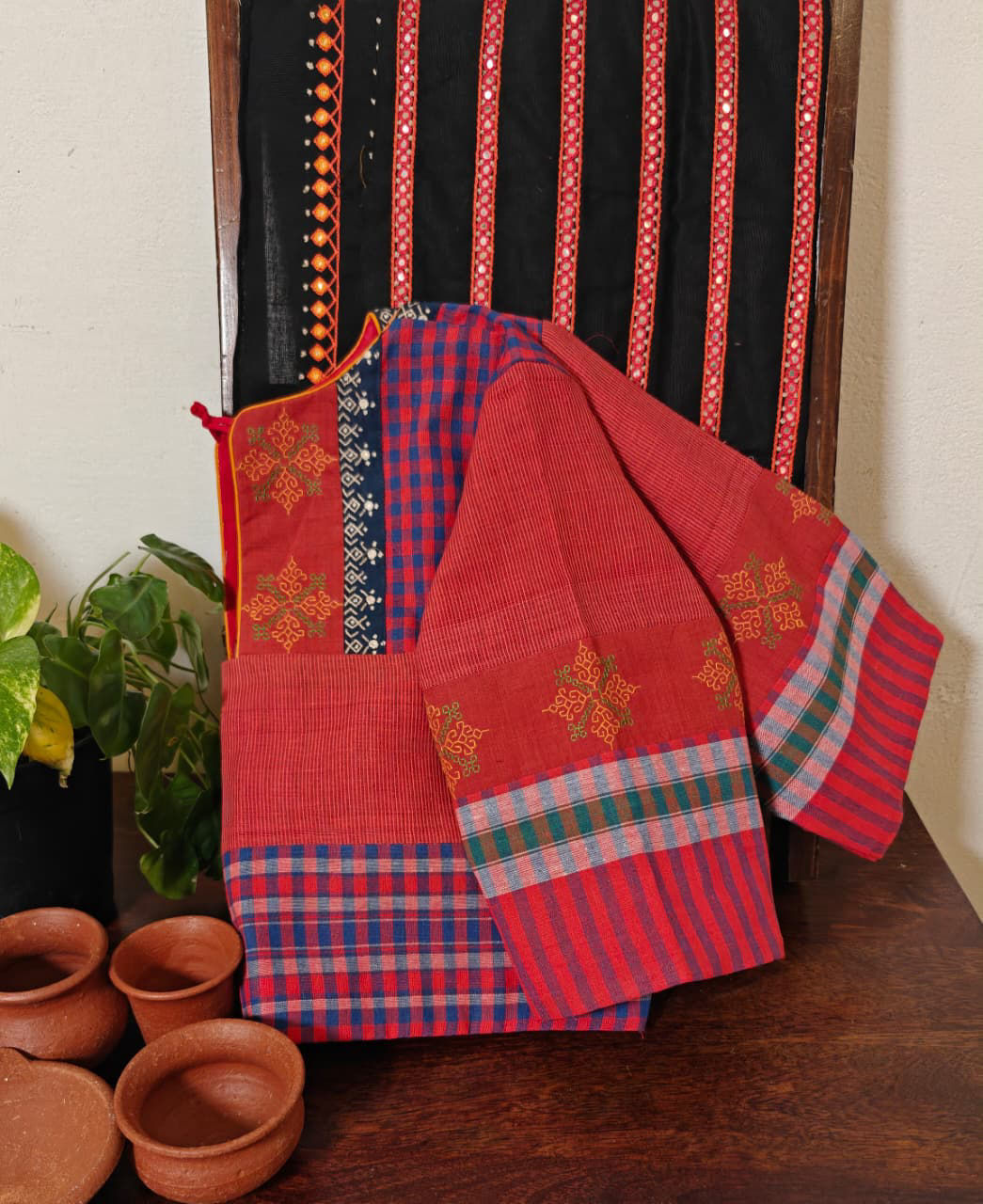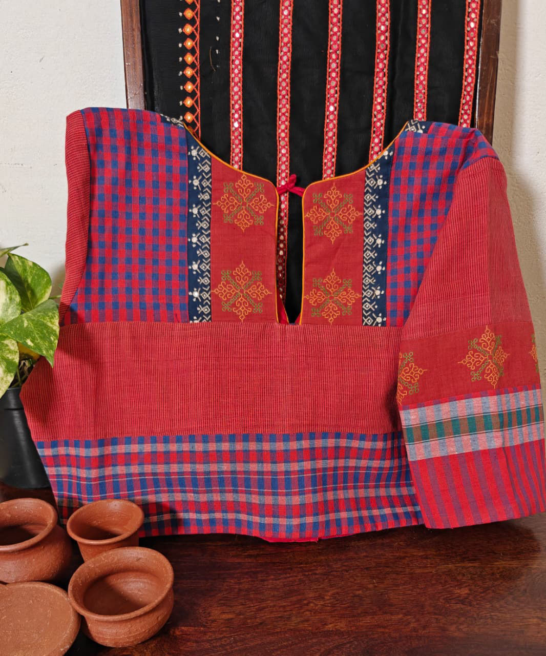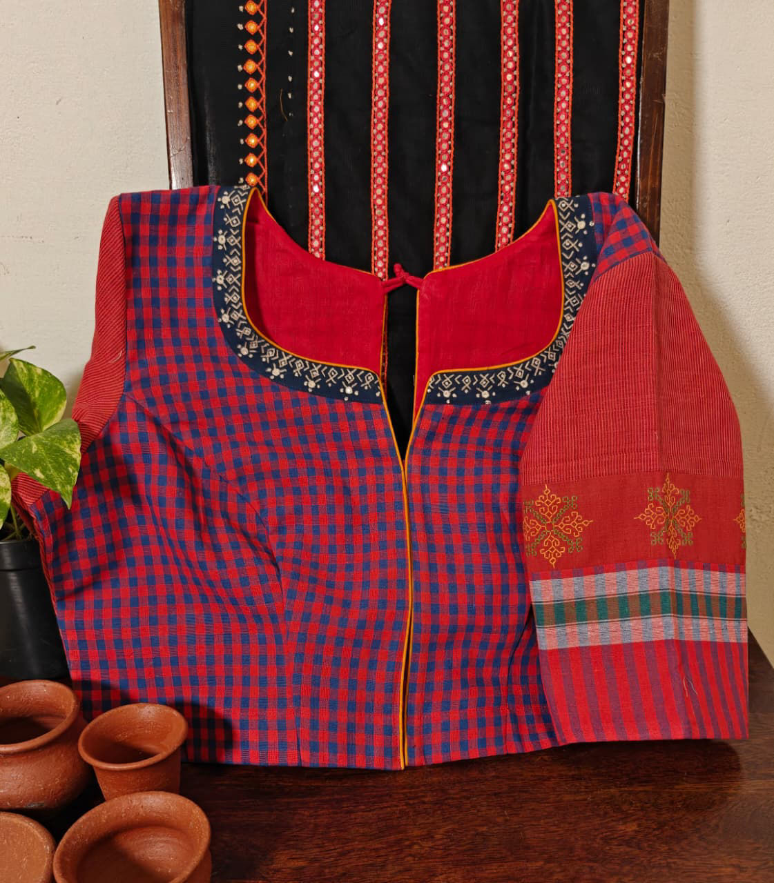 Intricate Kasuti embroidery brought alive on classic checks. A cotton blouse that is truly one of a kind β€” handmade with timeless artistry at Svasa. 🌿πŸͺ‘