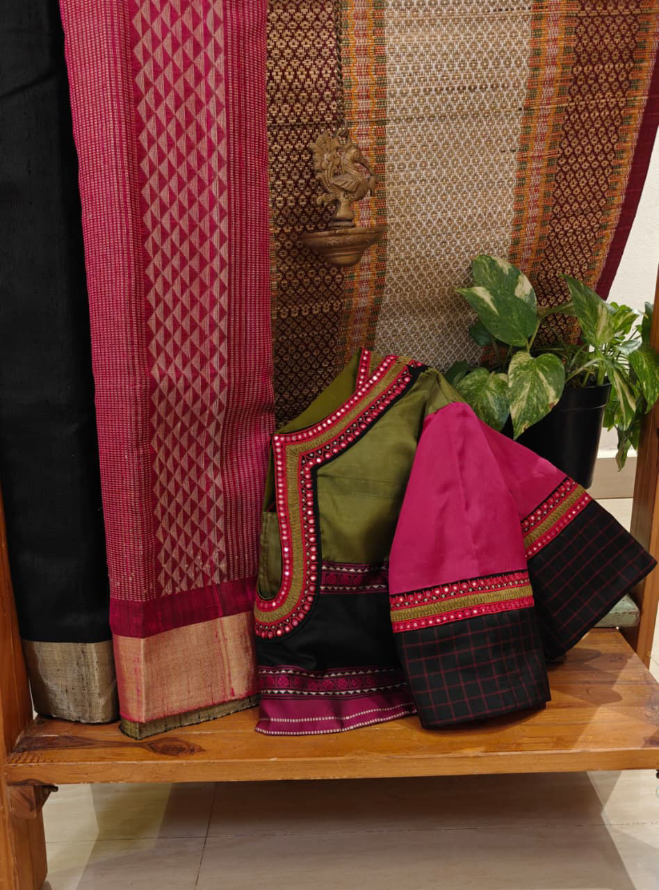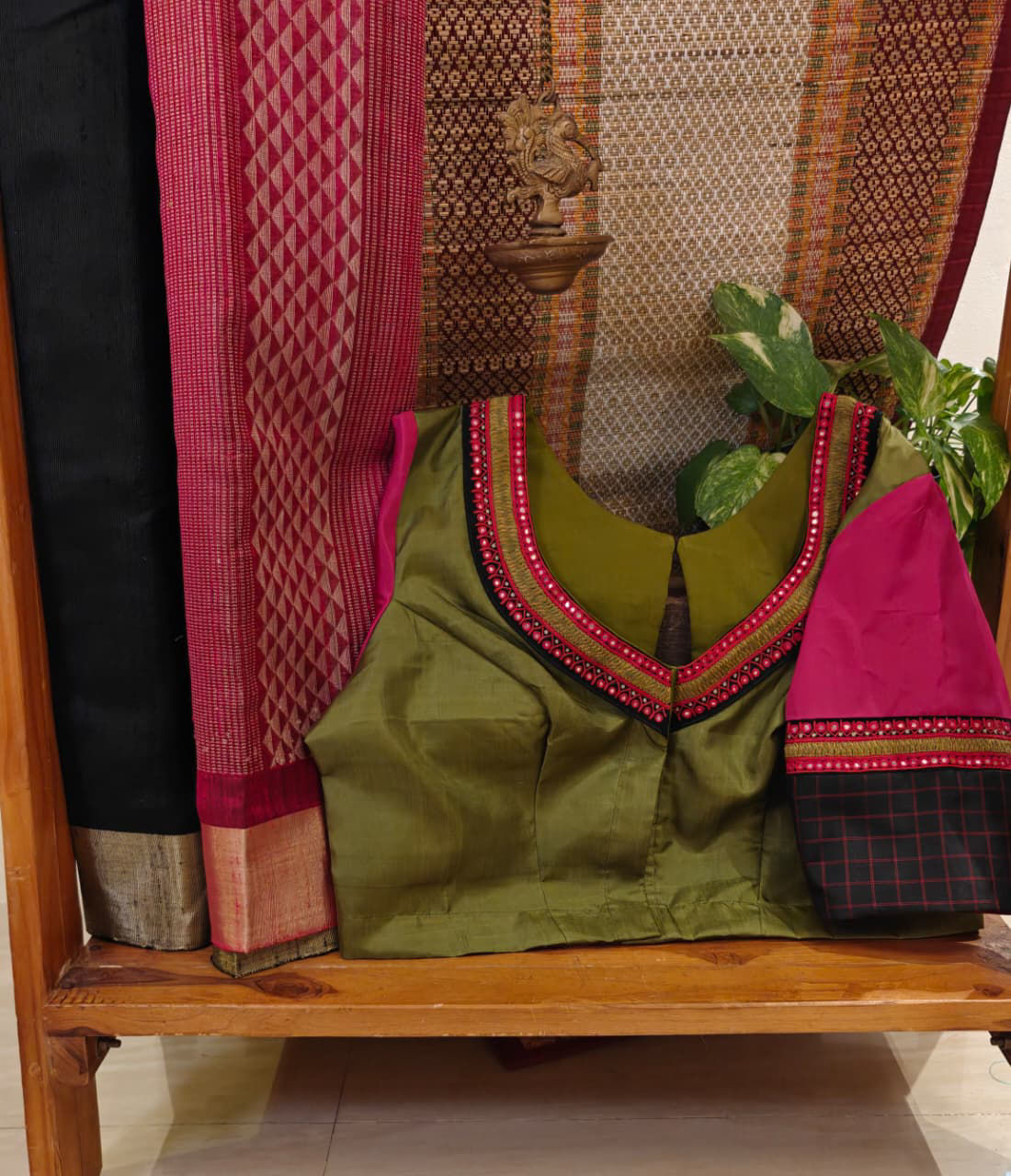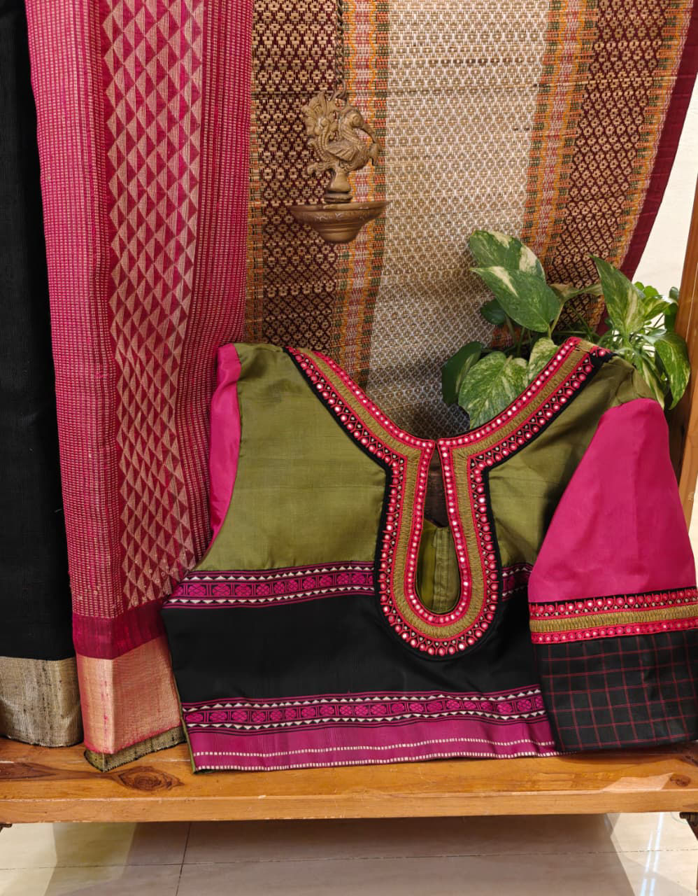 A pure Kanjivaram silk in olive green, highlighted with a striking black and pink korvai border. The neckline is adorned with thick thread embroidery that brings texture and tradition together — bold, refined, and distinctively Svasa. ✨🪡