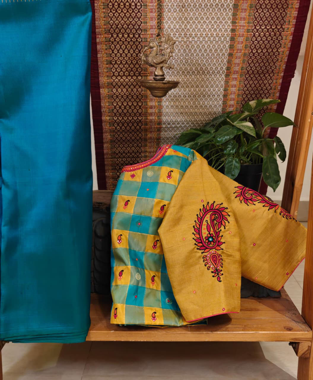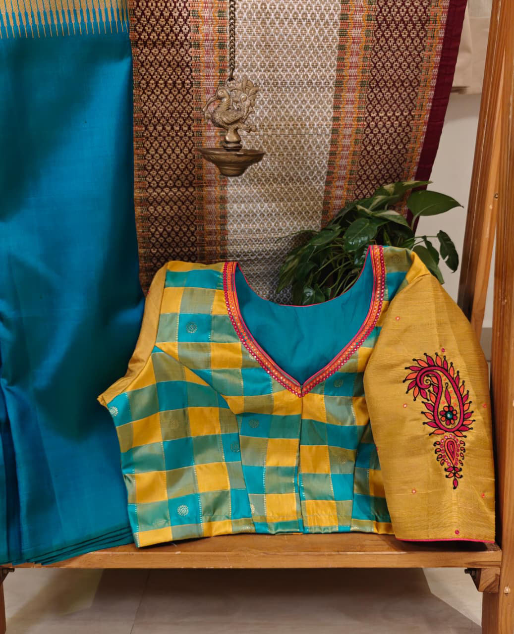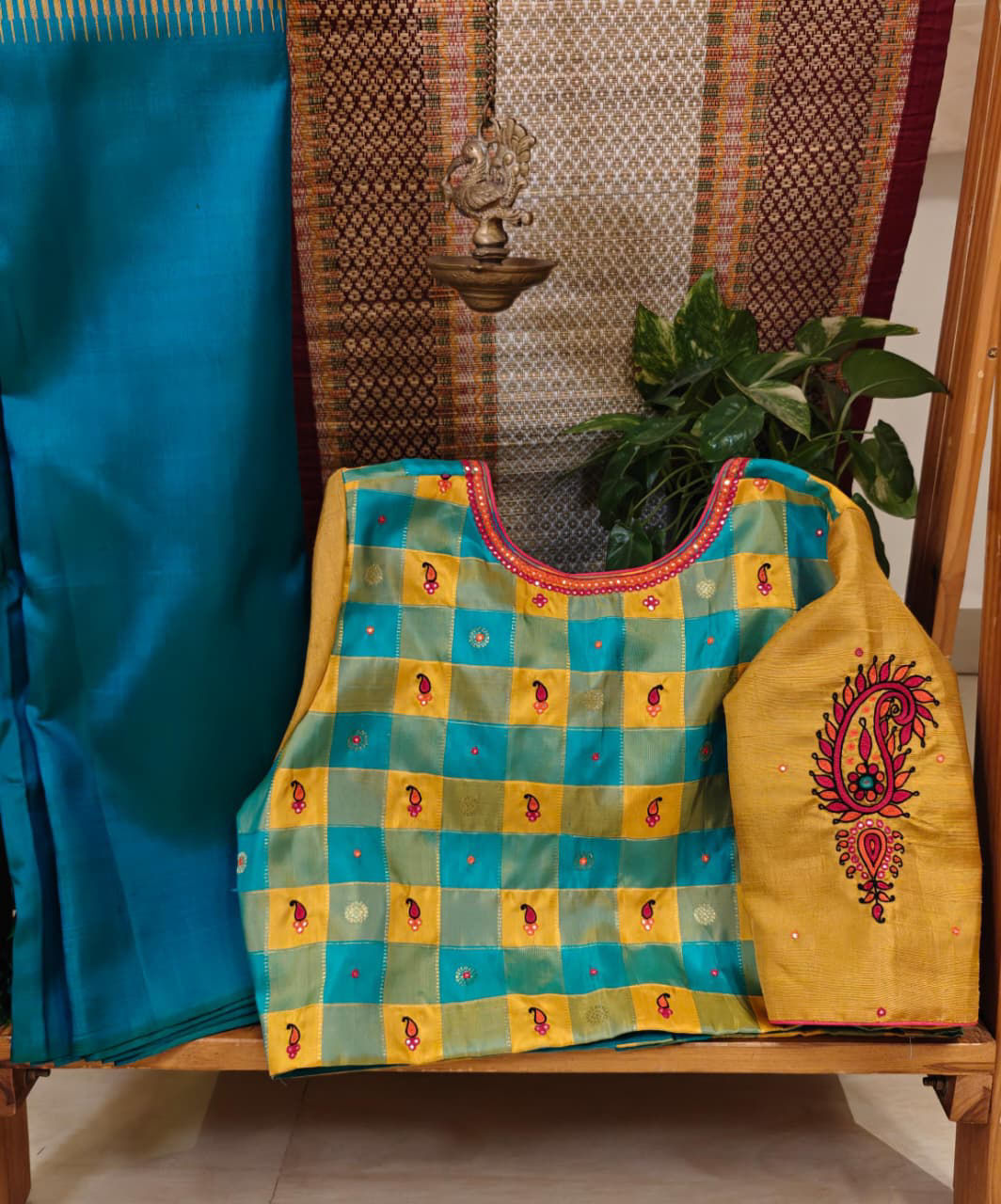 Checks in classic Palum Pazhamum tones of blue and yellow — woven in pure Kanjivaram silk. Paired with plain turmeric yellow sleeves and detailed with embroidered paisleys to create the magic. ✨