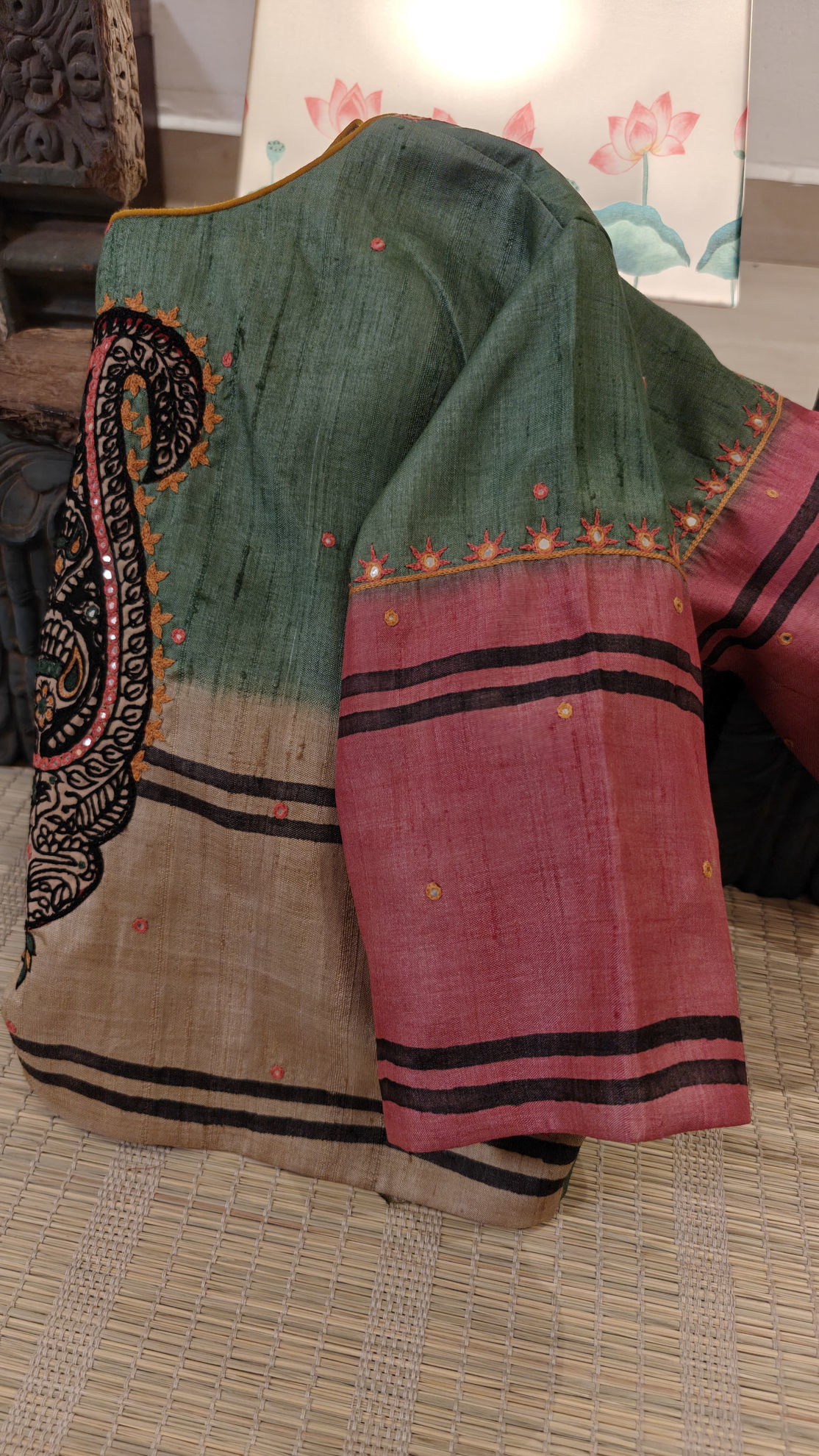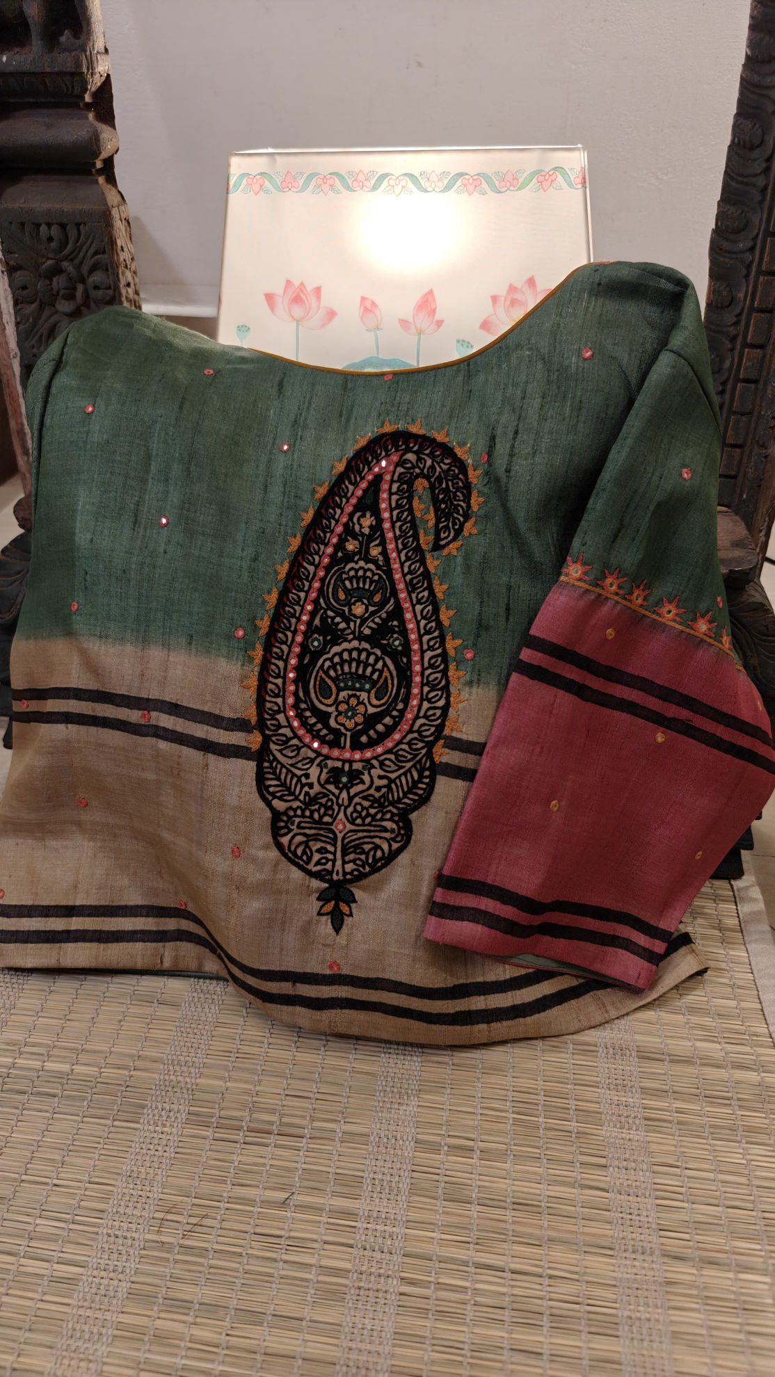 A paisley appliquéd on a Ganga Jamuna pastel tussar in shades of sage green, pink, and ivory — subtle, serene, and timeless. A classic from Svasa that celebrates the beauty of simplicity and craft. 🪡🌿💫