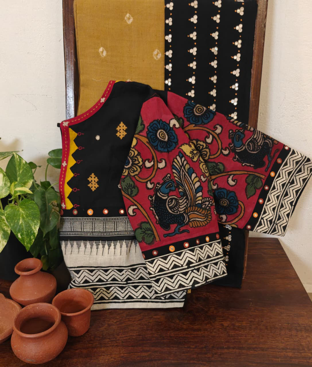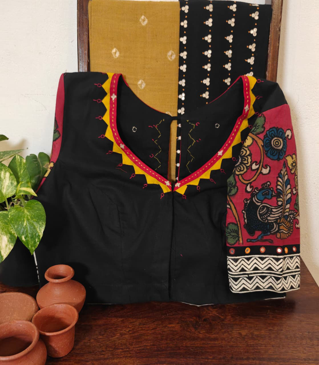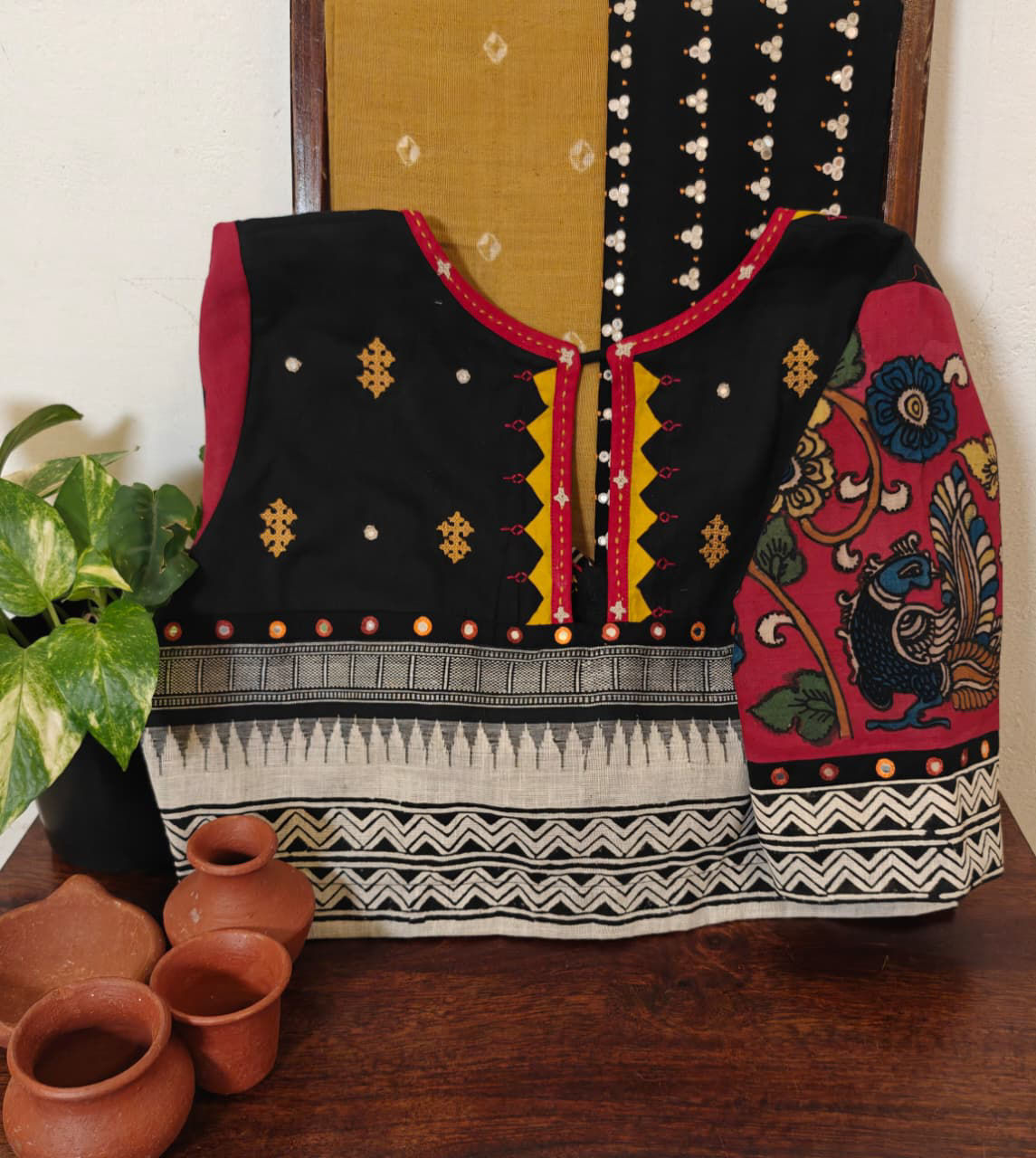 Pure handspun Ponduru cotton fused with Kalamkari sleeves — highlighted with hand-hemmed appliqué and Kutchi motifs. A heritage weave that carries the story of artisans in every stitch. 🌿🪡