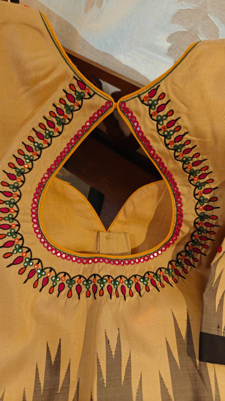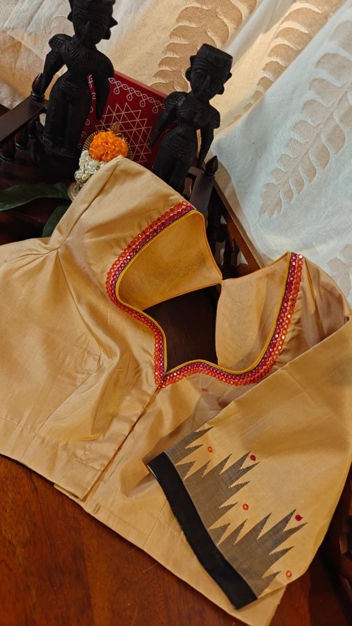 A rich blend of sandal and charcoal on pure silk, brought to life with colourful embroidery that adds depth and character. Earthy at its core yet vibrant in detail, this blouse celebrates contrast — subtle tones meeting joyful stitches. A statement piece that pairs beautifully with both classic and contemporary silks.