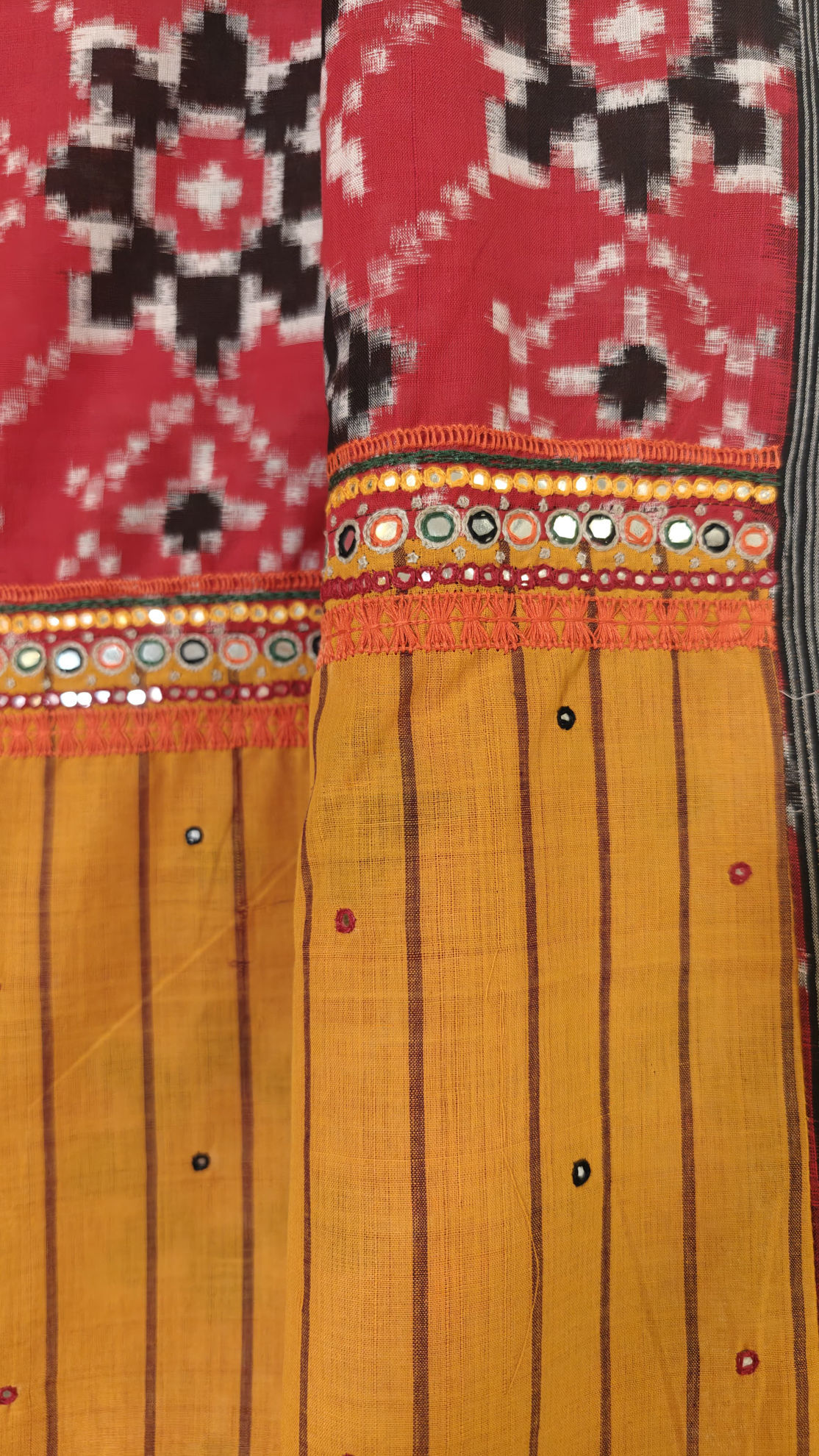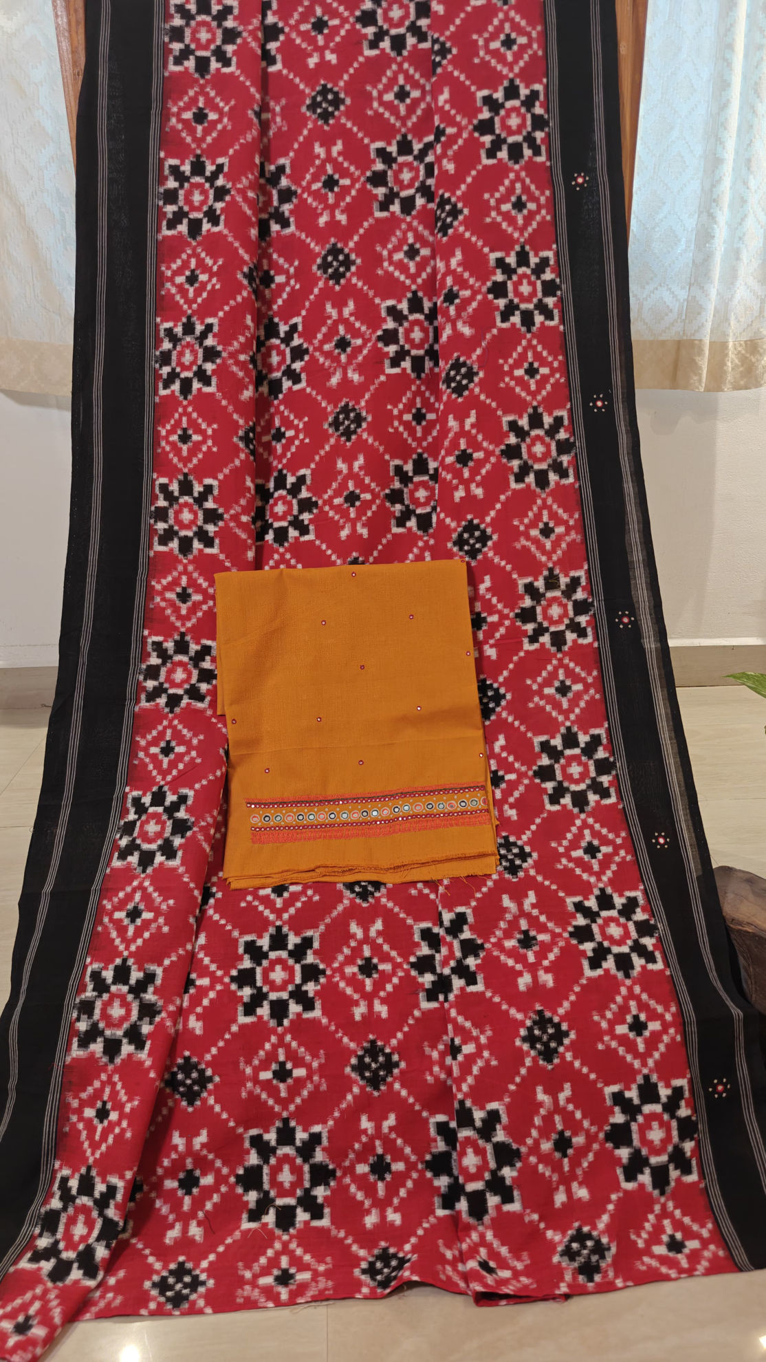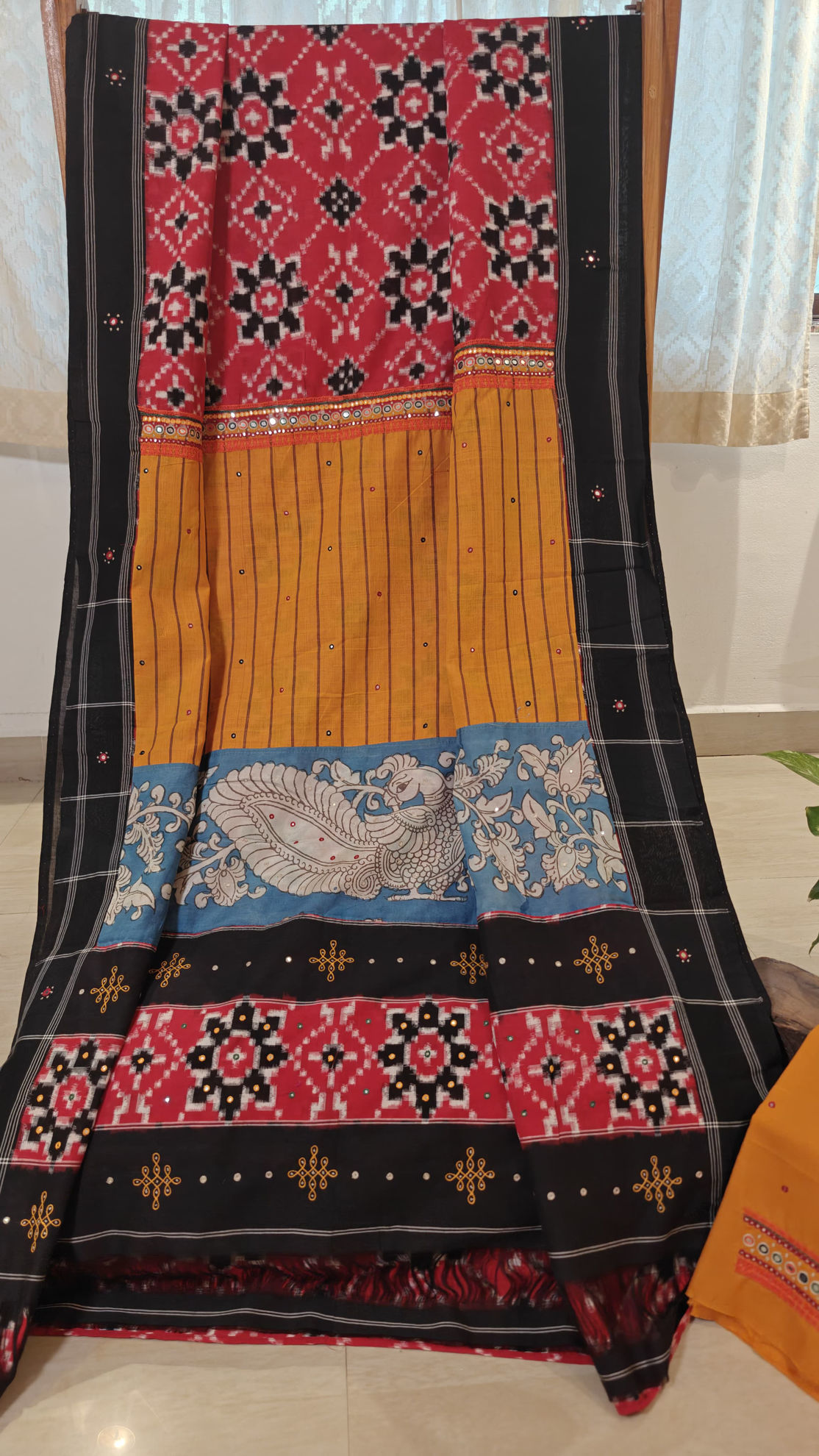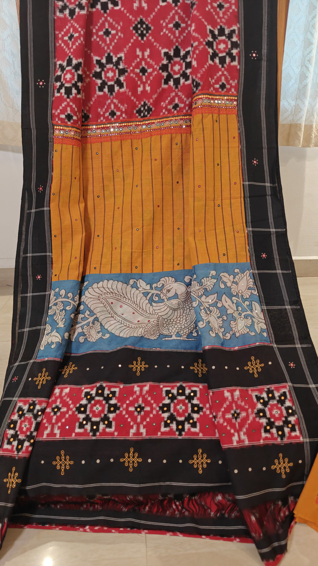 A striking telia rumal in deep red and charcoal, its bold borders seamlessly fused with a sky blue kalamkari. Finished with intricate kolam motifs embroidered to perfection — a piece where heritage meets artistry. 💫 A saree–blouse set that tells a story in every thread. 🪡💙❤️🖤