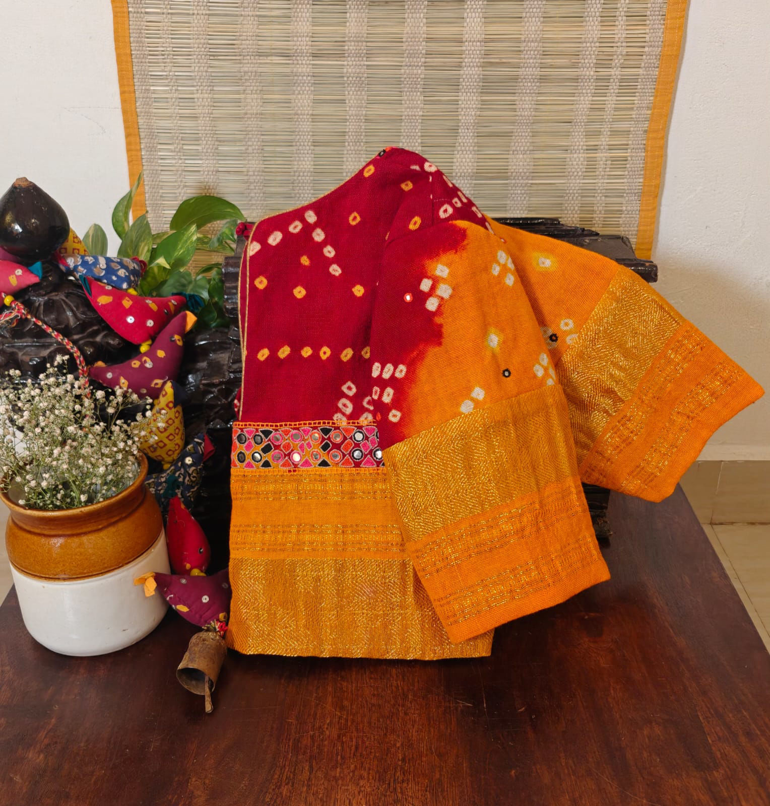 Vibrant bandhani in red and yellow — brought alive with intricate folk embroidery. A celebration of colour, craft, and culture, handmade with love at Svasa 🪡✨