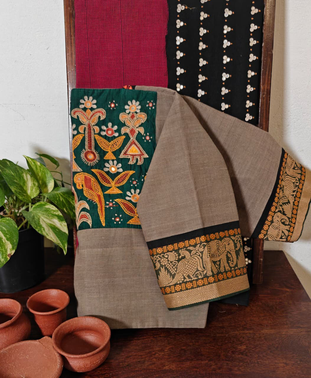 A green yoke with tribal motifs set against a subtle grey base — earthy, bold, and handmade at Svasa. 🪡💚