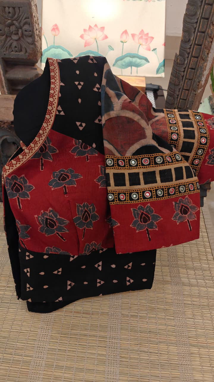 Charcoal and ivory Ajrakh hand block prints meet a fiery red cutcholi. Multi-weaves come alive on the sleeves, fused with mirror borders — a true celebration of heritage and handmade craft. ❤️🪡🌿