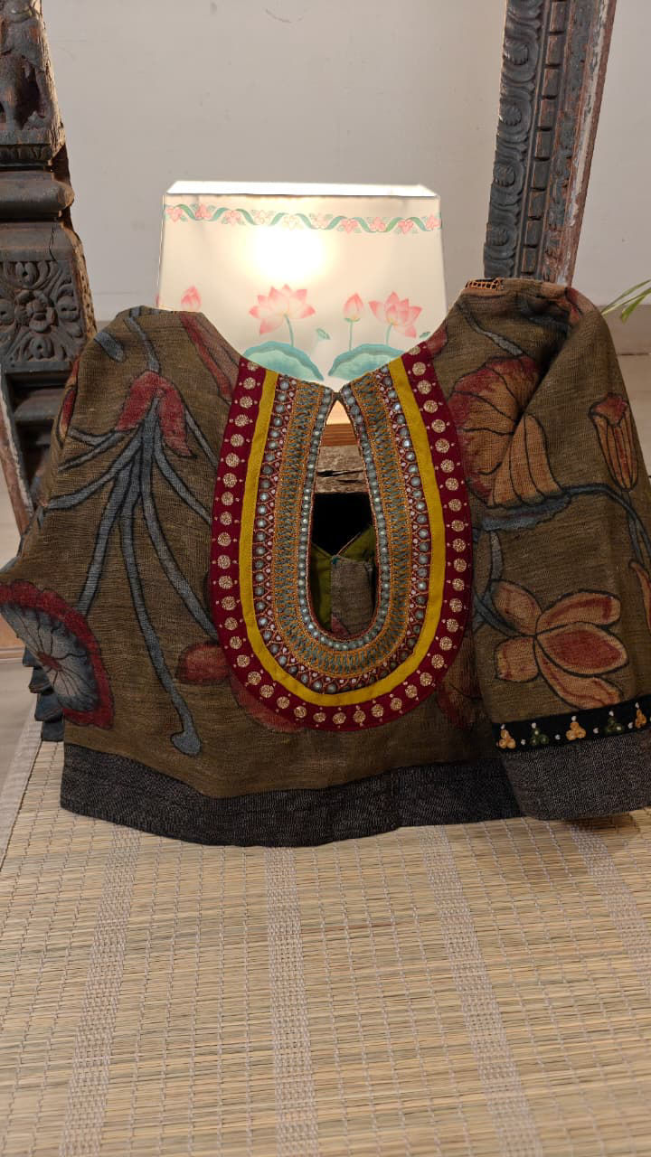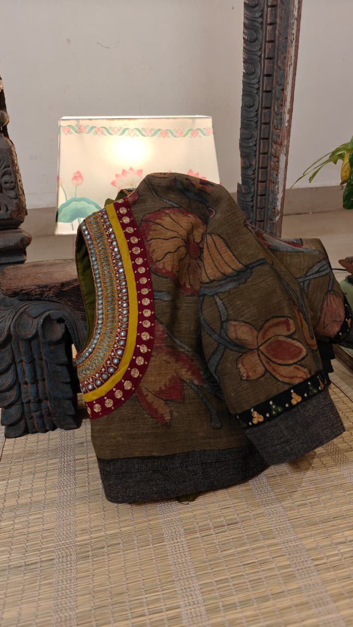 Our artisans creatively hand embroider, hand paint and hand print the blouses that come to you from the design house of SVASA. We use hand woven fabric extensively. You may notice very minute, almost insignificant flaws in the crafts since they are all handmade. We urge our patrons to overlook a few human errors that may have occurred in the process. Our aspirations are towards an empowered society, focusing on keeping traditional needlecraft alive for a long time to come.