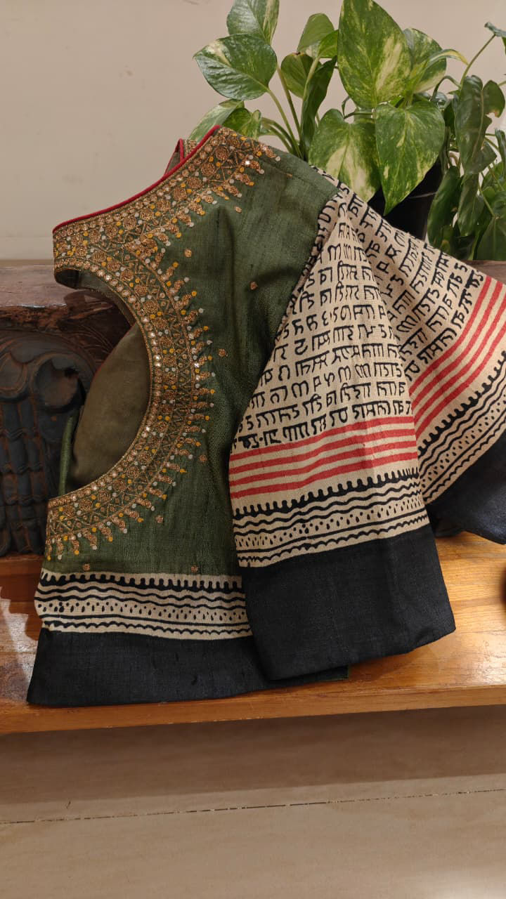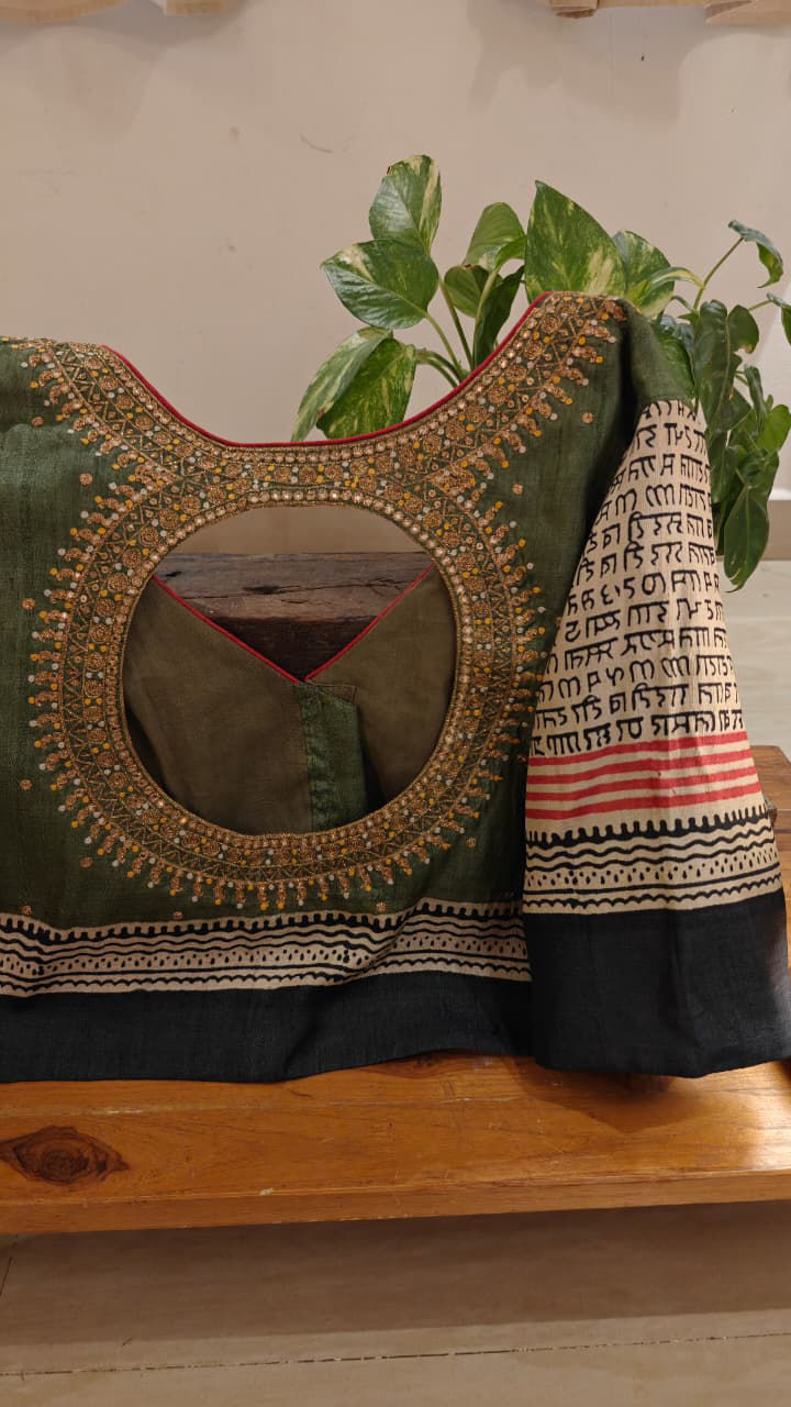 A masterpiece in tussar block-printed silk, adorned with vintage embroidery in beaten gold that circles the neckline beautifully. Timeless craft, refined detail — a true Svasa creation 🪡🌿