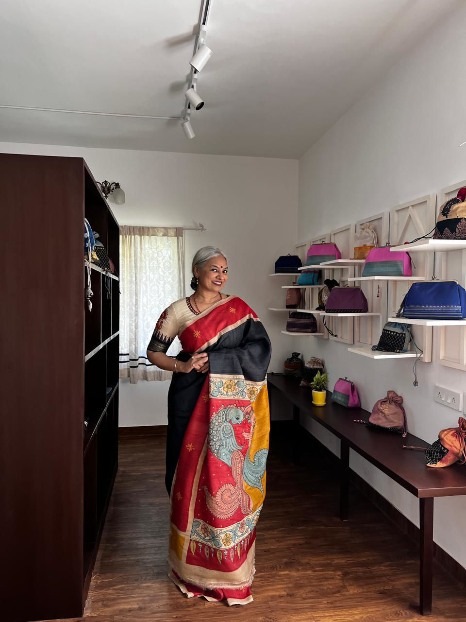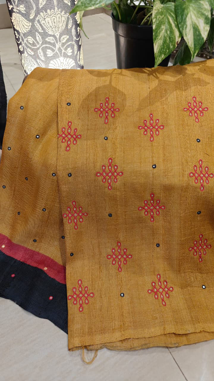 A solid tussar silk, understated and timeless, brought to life with a kalamkari pallu that tells its own story. Kolam motifs are intricately embroidered, adding a rooted, cultural rhythm to the weave—subtle, yet striking. A piece that carries the essence of tradition with quiet confidence. A Svasa creation. Please note: The ready blouse worn in the image is not included with the saree.