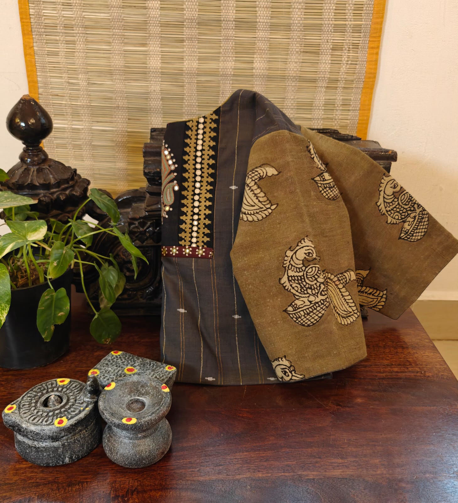 A snuff brown cotton handloom base carries an Unusual Annam from our Mithra creation. annam motifs bloom on handcrafted Kalamkari sleeves in olive and olive green hues. A charcoal yoke is outlined with Kutchi embroidery and tiny mirrors, stitched by in-house makers at Svasa Studio. The designs fuse tradition with modern intent—every loop, motif, and border narrates the Svasa way.