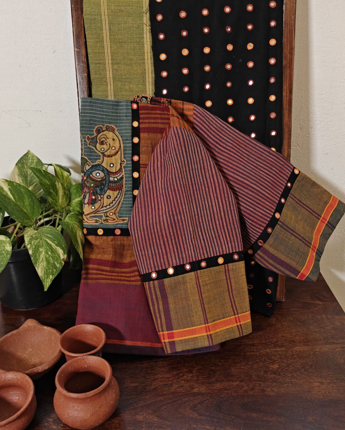 Our artisans creatively hand embroider, hand paint and hand print the blouses that come to you from the design house of SVASA. We use hand woven fabric extensively. You may notice very minute, almost insignificant flaws in the crafts since they are all handmade. We urge our patrons to overlook a few human errors that may have occurred in the process. Our aspirations are towards an empowered society, focusing on keeping traditional needlecraft alive for a long time to come.