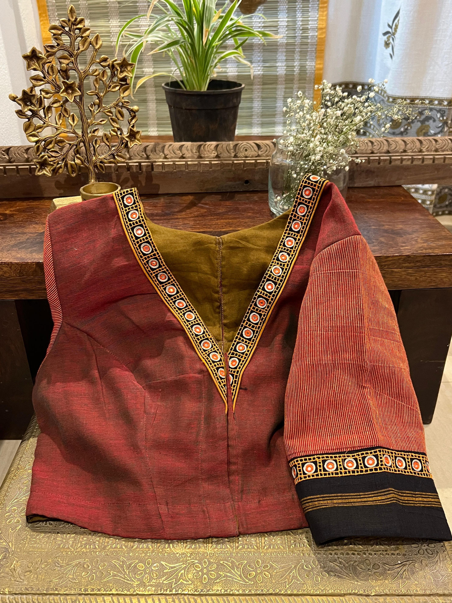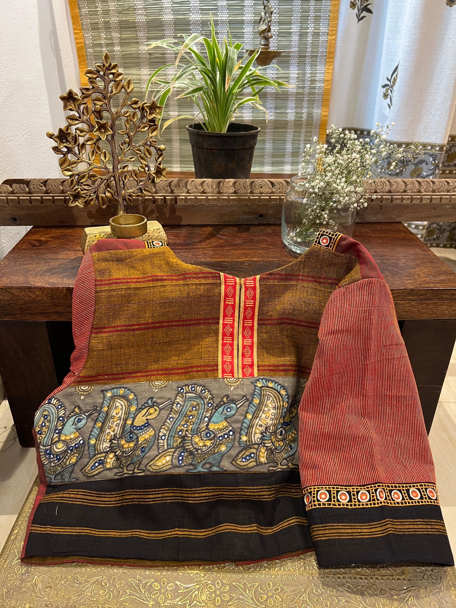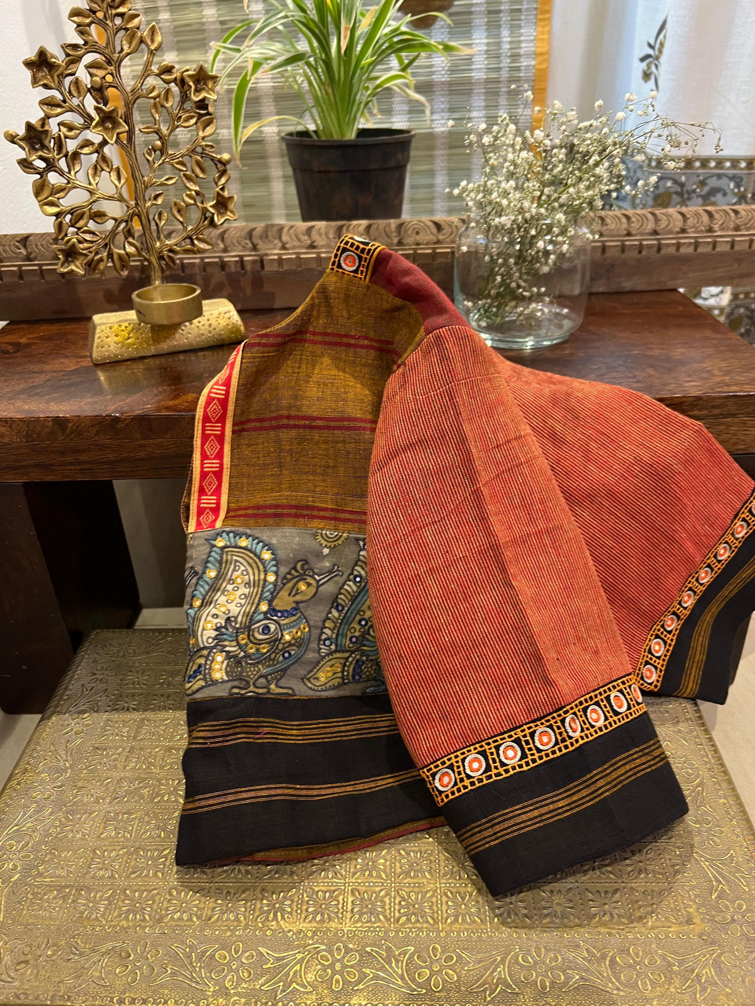 A one-of-a-kind blouse from our Mithra collection — crafted in Anne Hejje cotton and fused with Kalamkari Annams across the back, finished with mirror borders created in-house. Every detail tells a story — of tradition, craftsmanship, and quiet strength. Only one. Always yours.