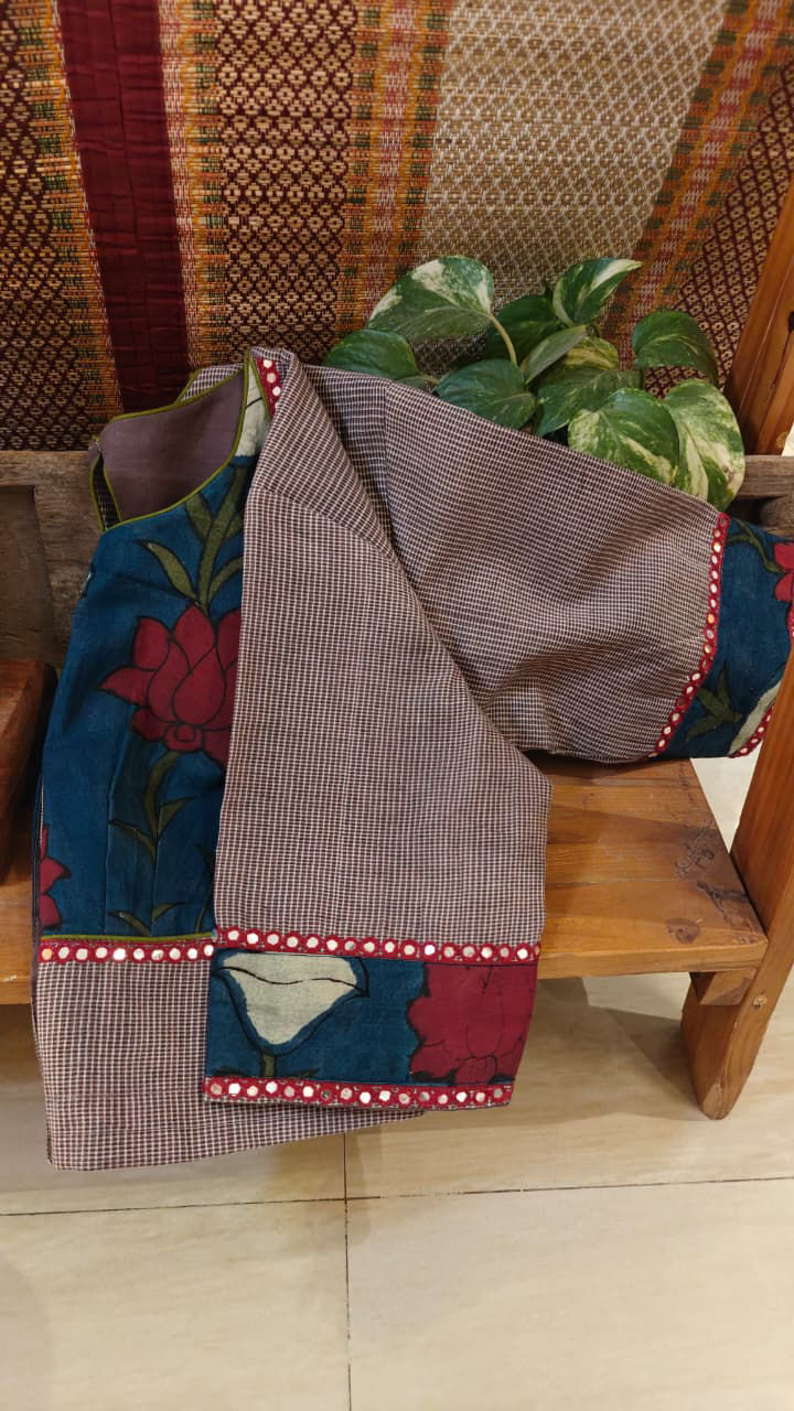 Anne Hejje in a striking shade of blue is paired with a bold Kalamkari yoke, creating a rich play of texture and tradition on breathable cotton. The yoke becomes the focal point, bringing depth and character without overwhelming the weave. Rooted in heritage yet easy to wear, this piece brings together multiple techniques in a way that feels balanced, thoughtful, and distinctly Svasa.