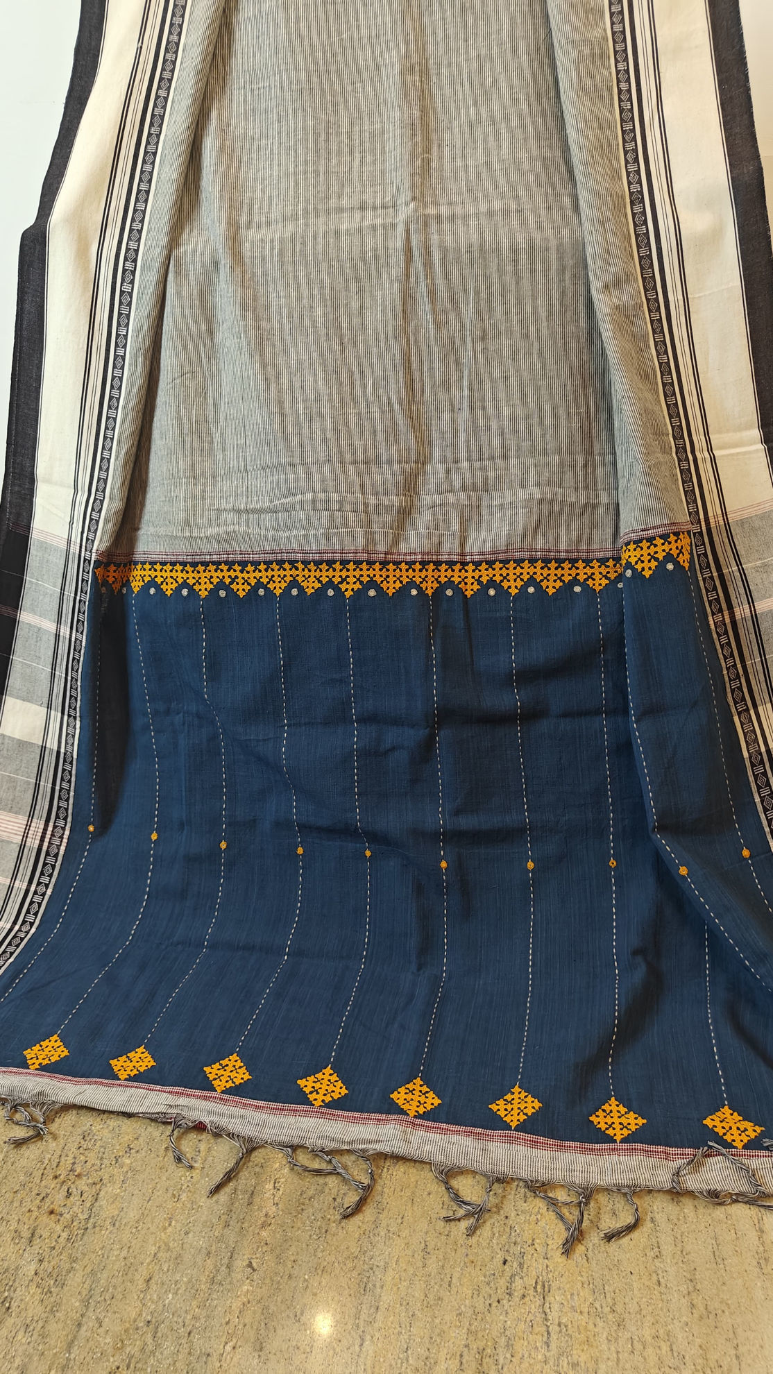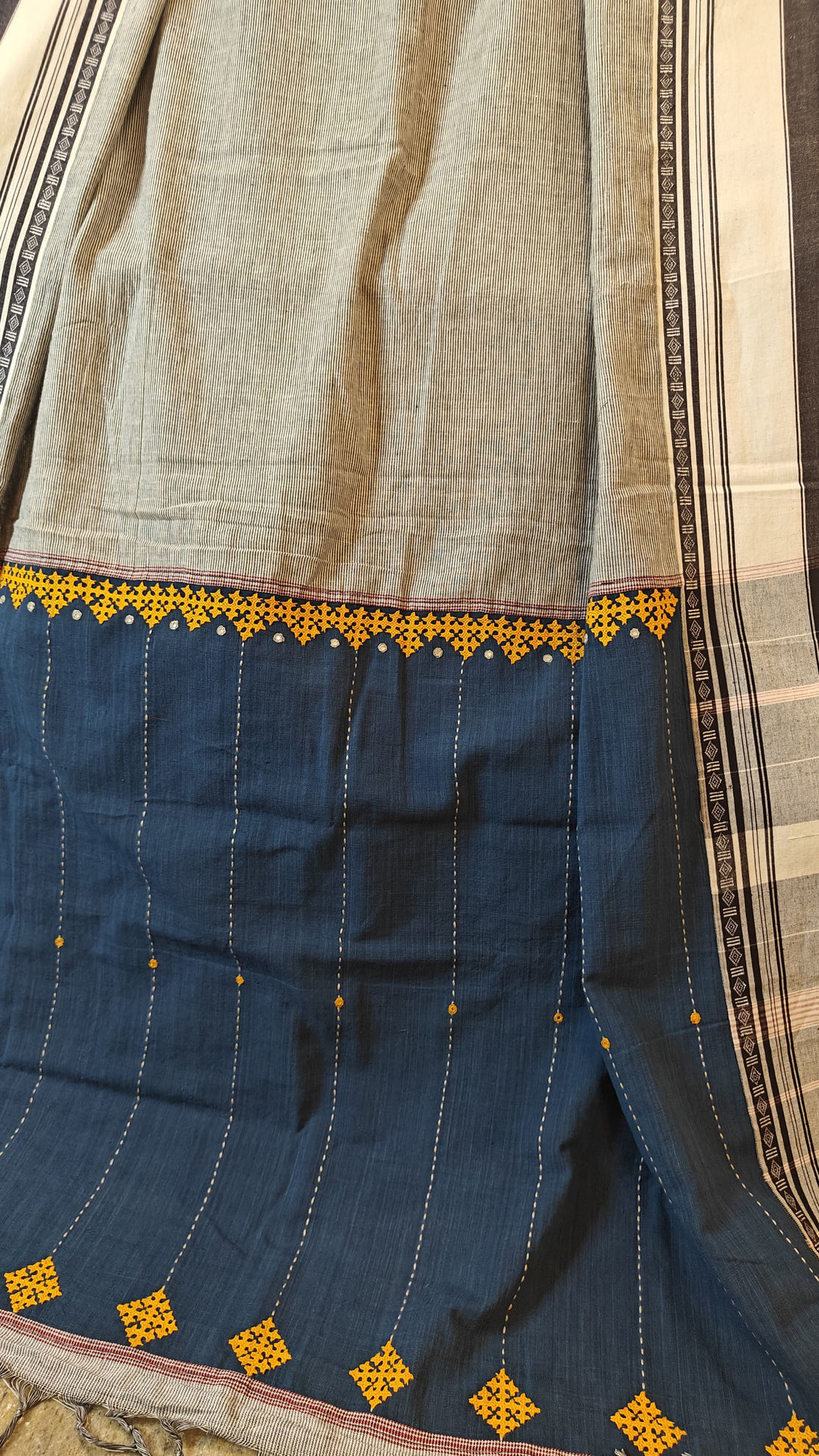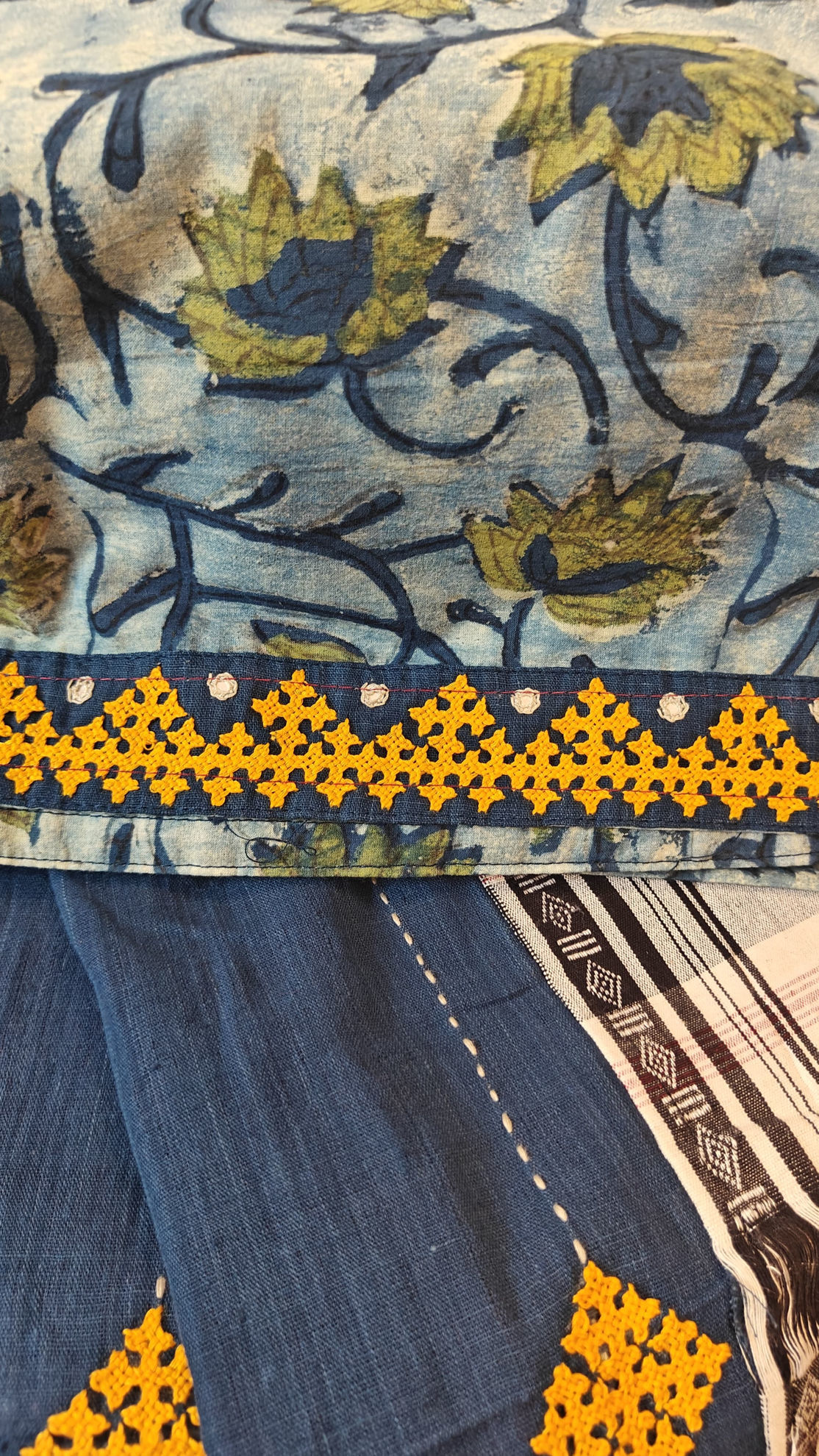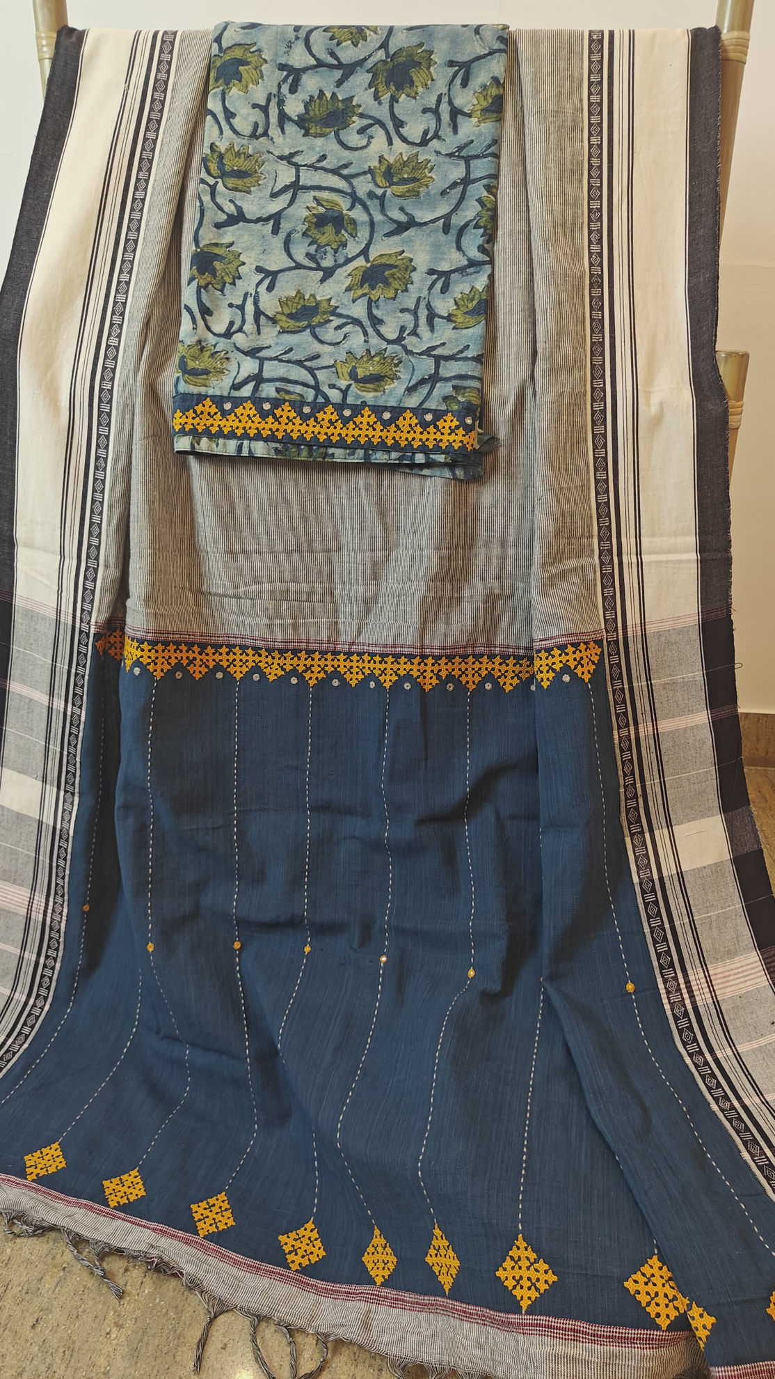 A soft grey Anne Hejje paired with an indigo khadi pallu — embroidered in striking turmeric yellow Kutchi work by our talented team. The blouse is hand block printed and embroidered to match, bringing the whole set alive in earthy charm and timeless craft.