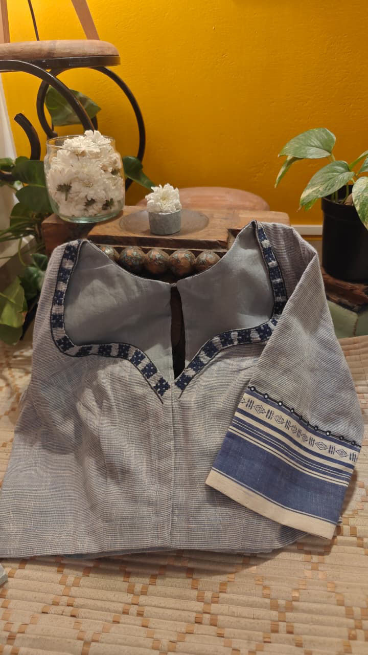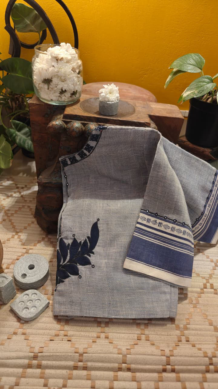 A quiet revival of heritage in pure cotton. Rooted in the timeless grace of Anne Hejje, this piece celebrates tradition with a bold hand. A striking kamal motif blooms in deep indigo threads — strong, grounded, and unmistakably classic. The rhythm of the stitches carries stories of craft, patience, and revival, bringing old-world artistry into today’s silhouette.