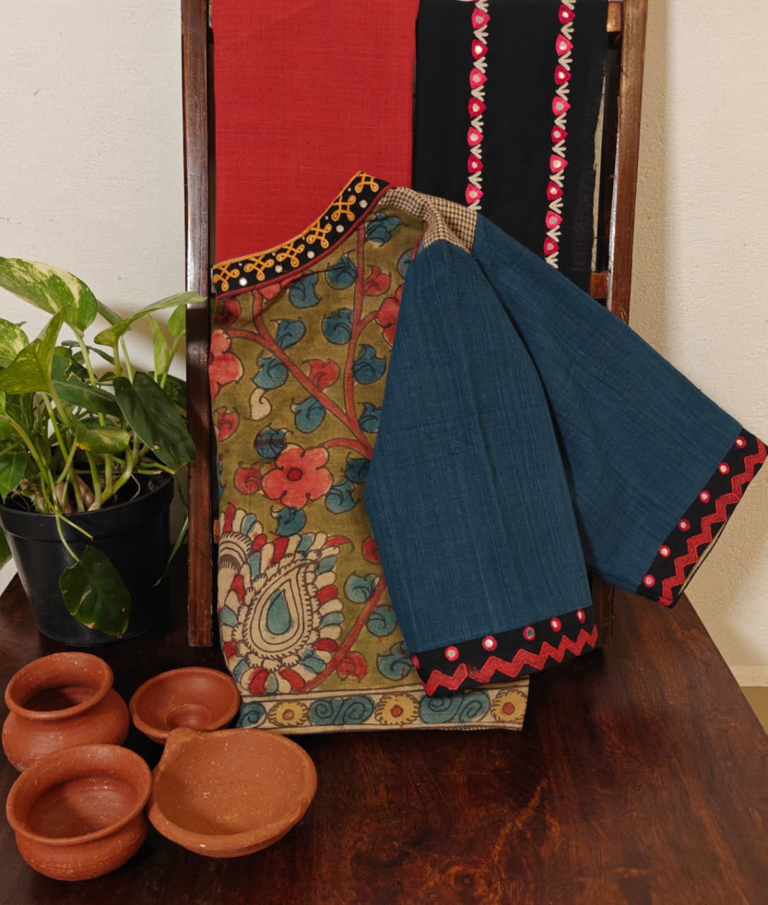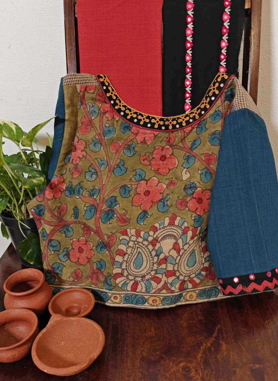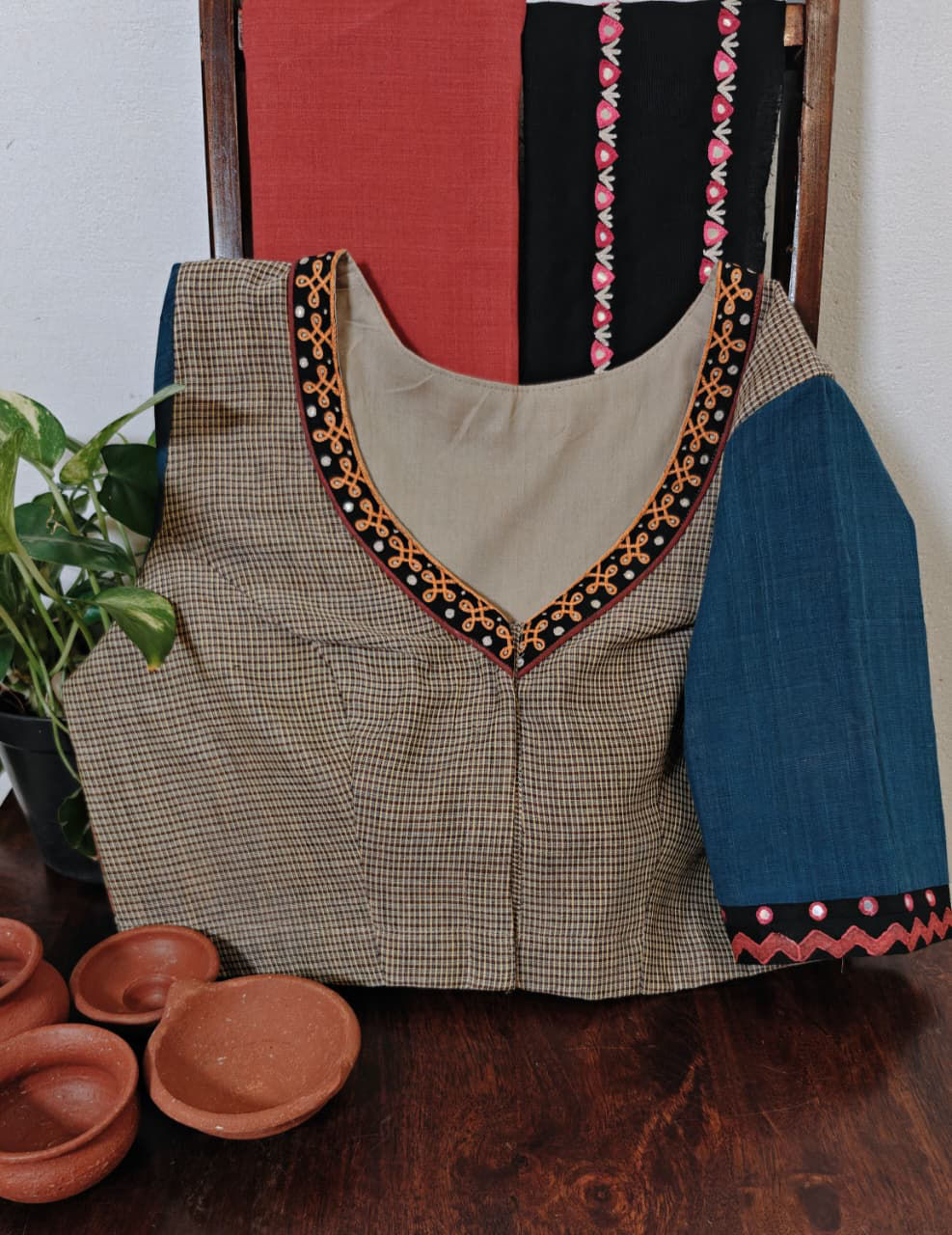 Gomi checks in a soft ash base, fused with embroidered kalamkari sleeves in earthy greens and deep blues. A timeless cotton blouse from our Mithra range β€” grounded, graceful, and full of character. ✨🧡