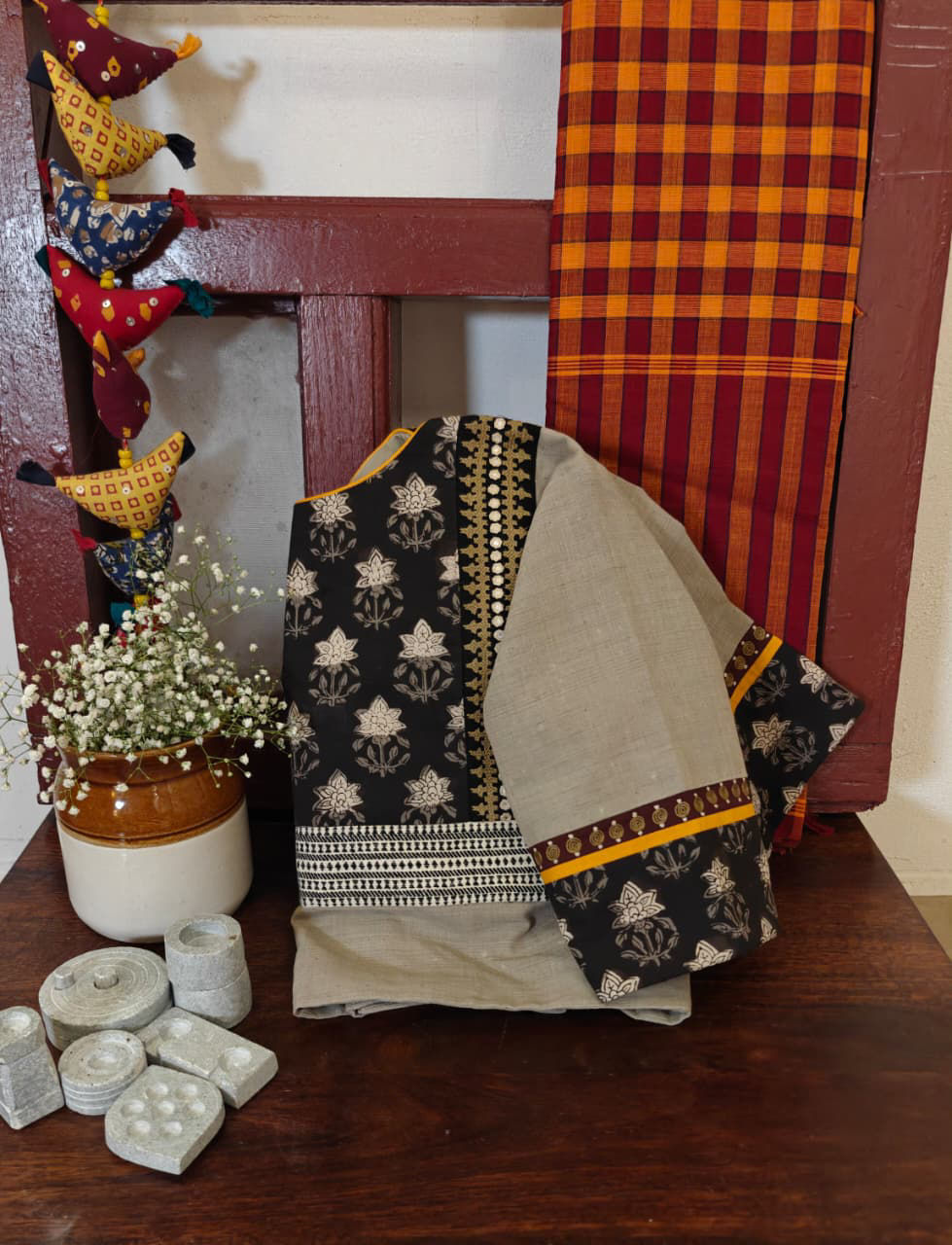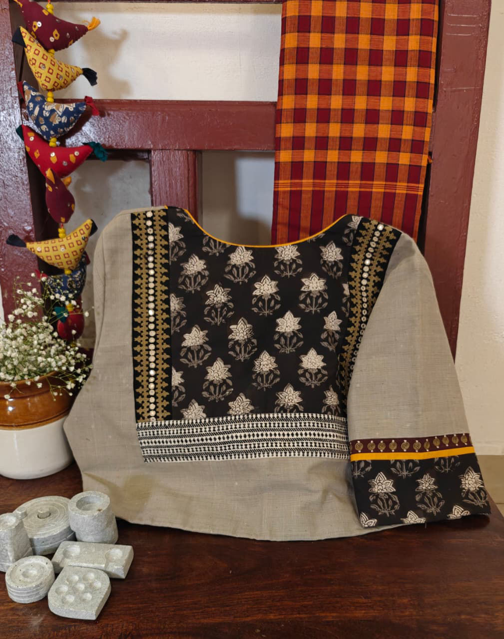 An ash grey cotton handloom paired with a block-printed yoke, finished with Kutchi embroidery in olive green and a subtle dash of ivory. Understated, earthy, and crafted with the quiet artistry that defines Svasa.