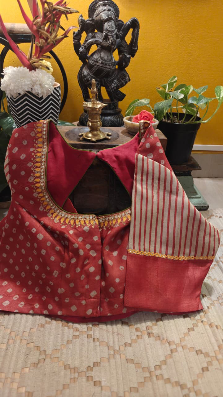 A beautiful meeting of textures — hand-tied bandhani on rich tussar silk, brought alive with vintage embroidery. The softness of the bandhani dots flows effortlessly across the silk while the embroidery lends an old-world character to the piece. Rooted in tradition and crafted by hand, it carries the quiet depth and timeless charm that defines a classic Svasa creation. ✨