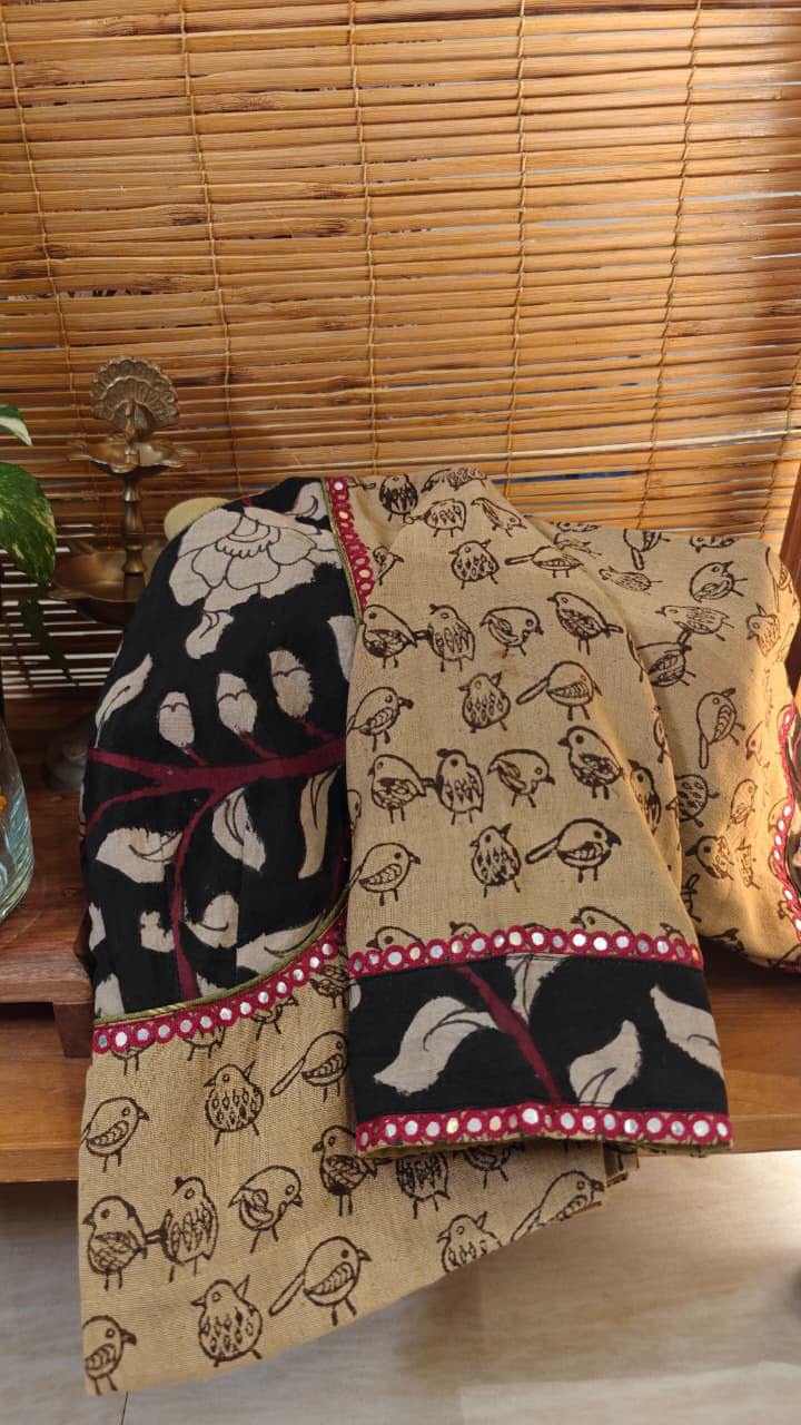 A classic beige khadi, hand-dyed and shaped into a timeless Bhopali yoke. Bold black and ivory Kalamkari anchors the design, while merlot-toned mirrors are delicately studded around the yoke and sleeves—adding depth, contrast, and a quiet drama. Rooted in tradition, finished with thoughtful detail. A piece that speaks in layers, not loudness