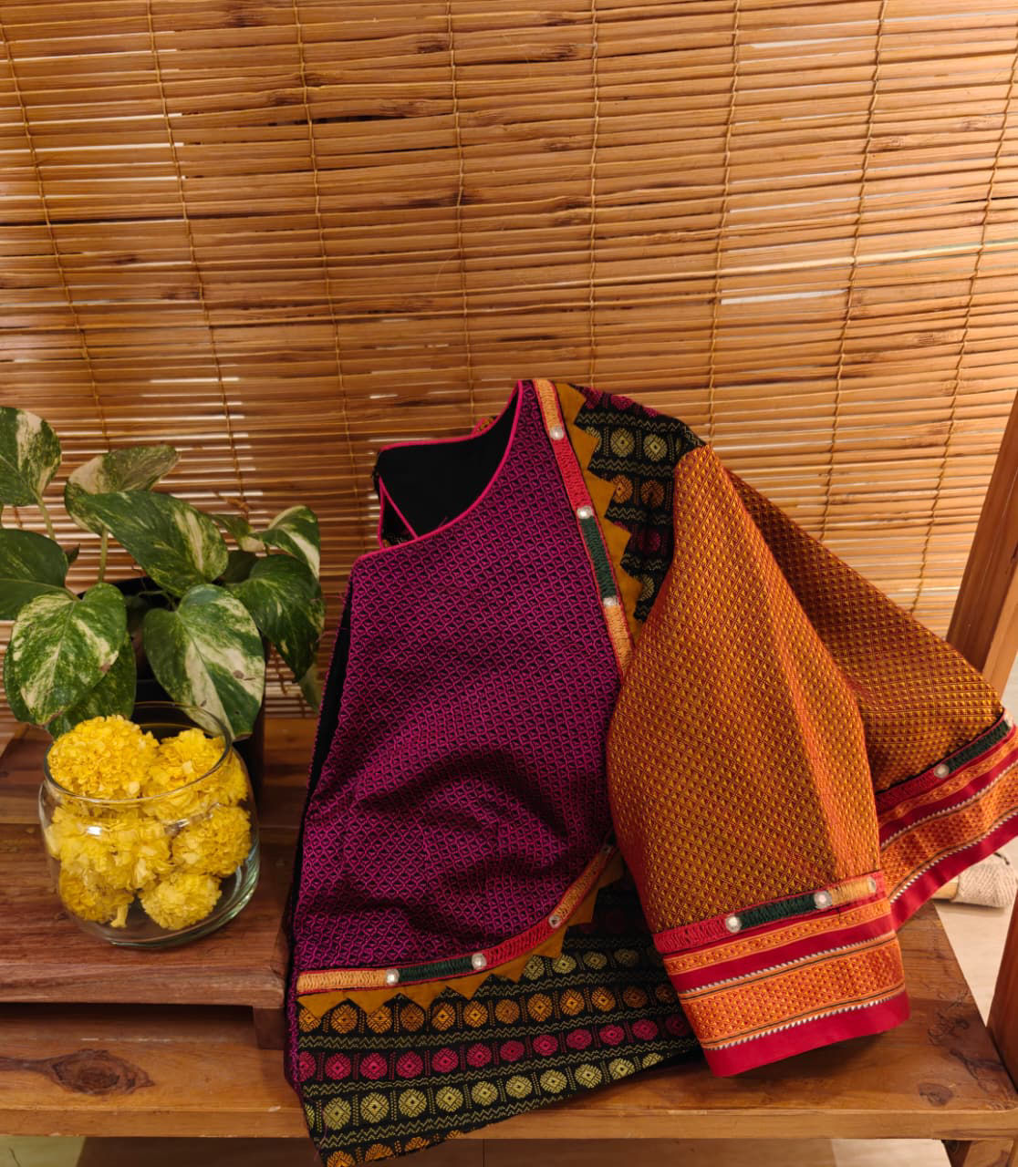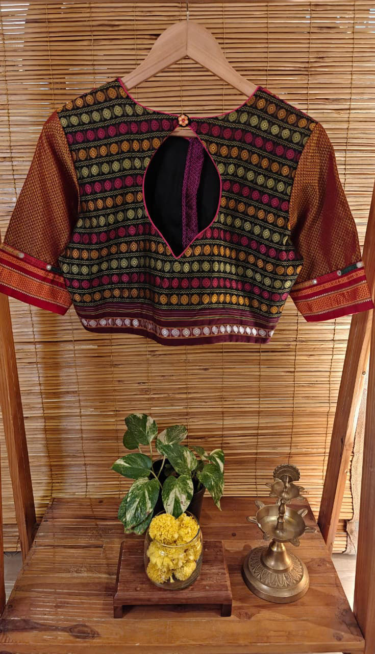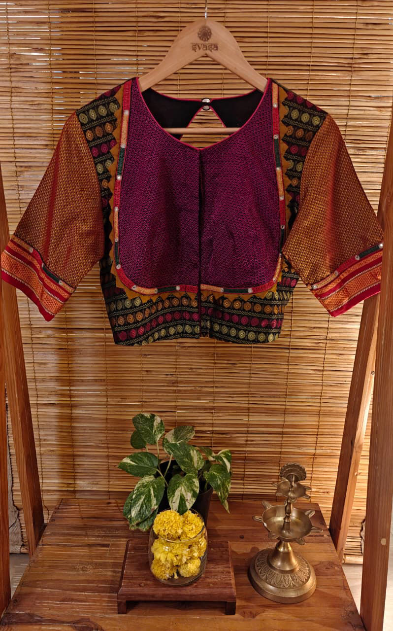 A celebration of colour and craft ✨ This Bhopali yoke–cut khun blouse comes alive in vibrant multicolours, grounded beautifully by a deep aubergine yoke. Intricate embroidery traces the yoke, adding rhythm and detail to the bold weave. Rooted, artistic, and unmistakably handcrafted — a piece that carries tradition with quiet confidence.