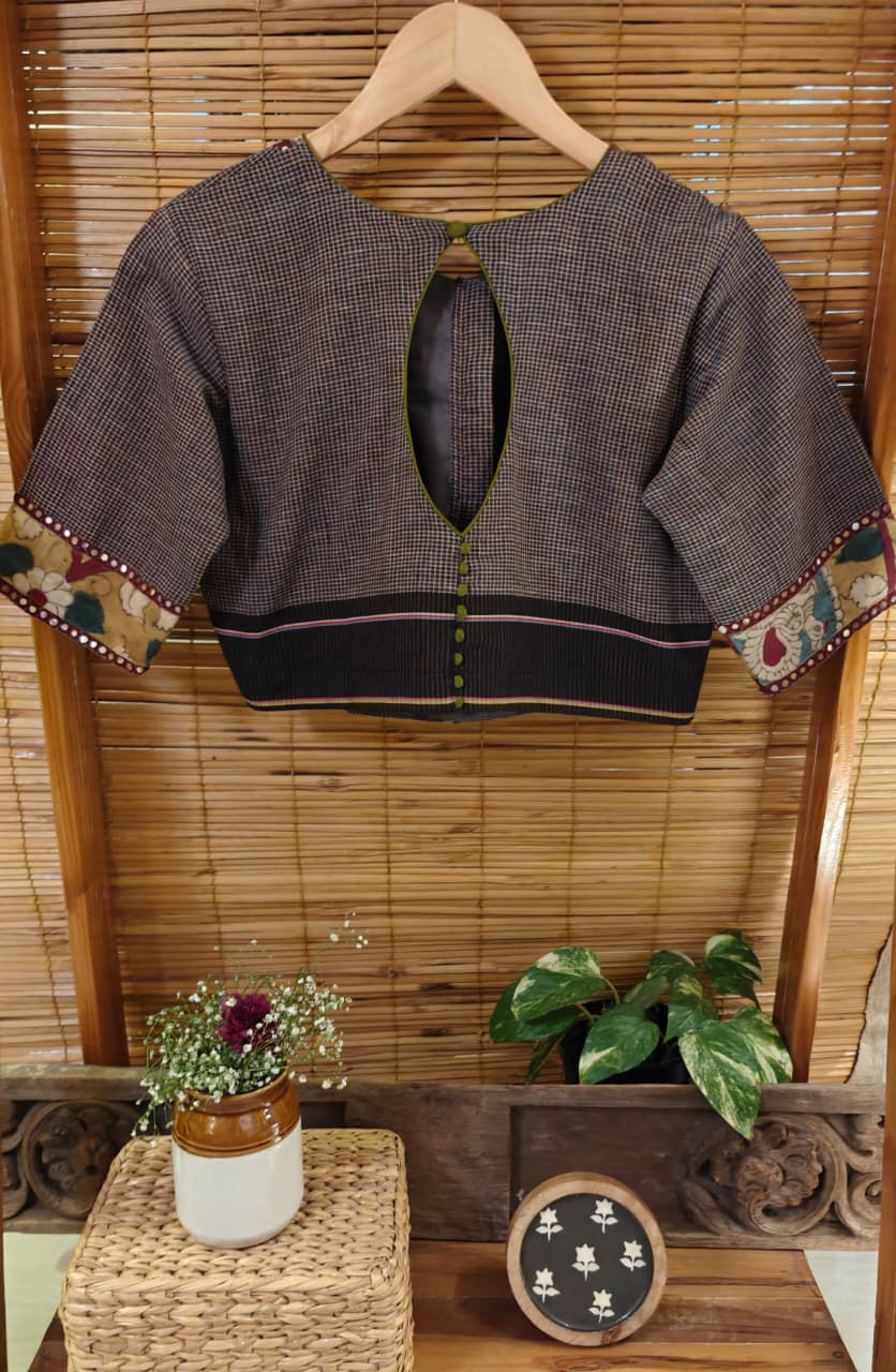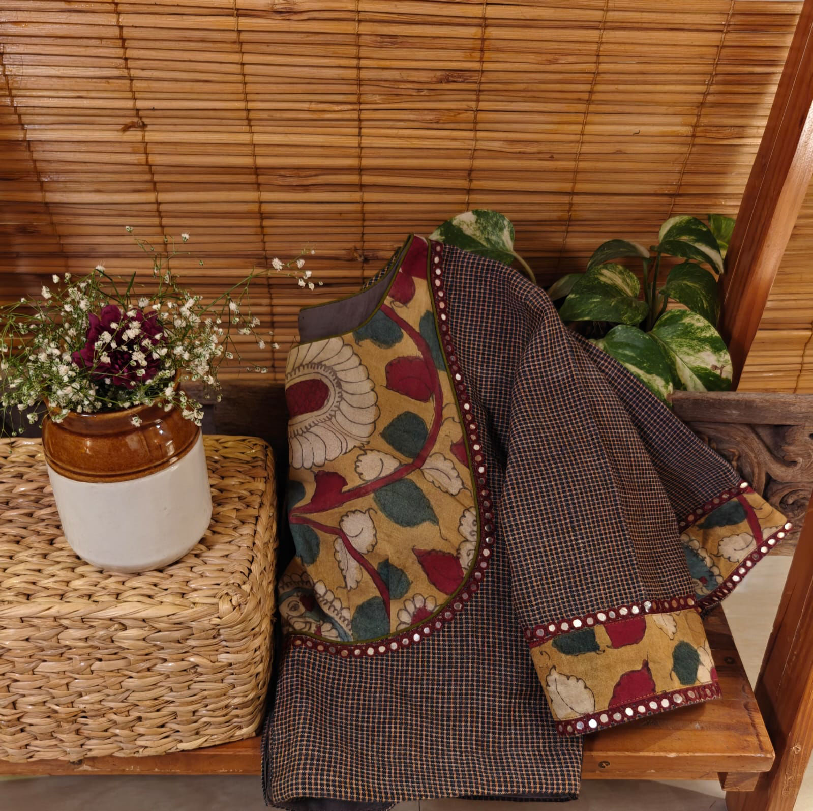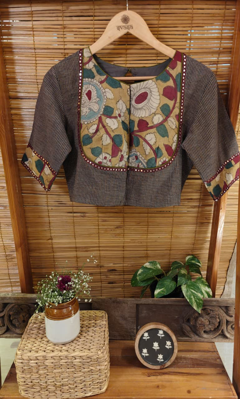 Gomi checks fused with vintage Kalamkari, cut in a classic Bhopali yoke to create that perfect balance of structure and soul. A rooted blend of prints and tradition — finished with fine details, the Svasa way. ✨🖤