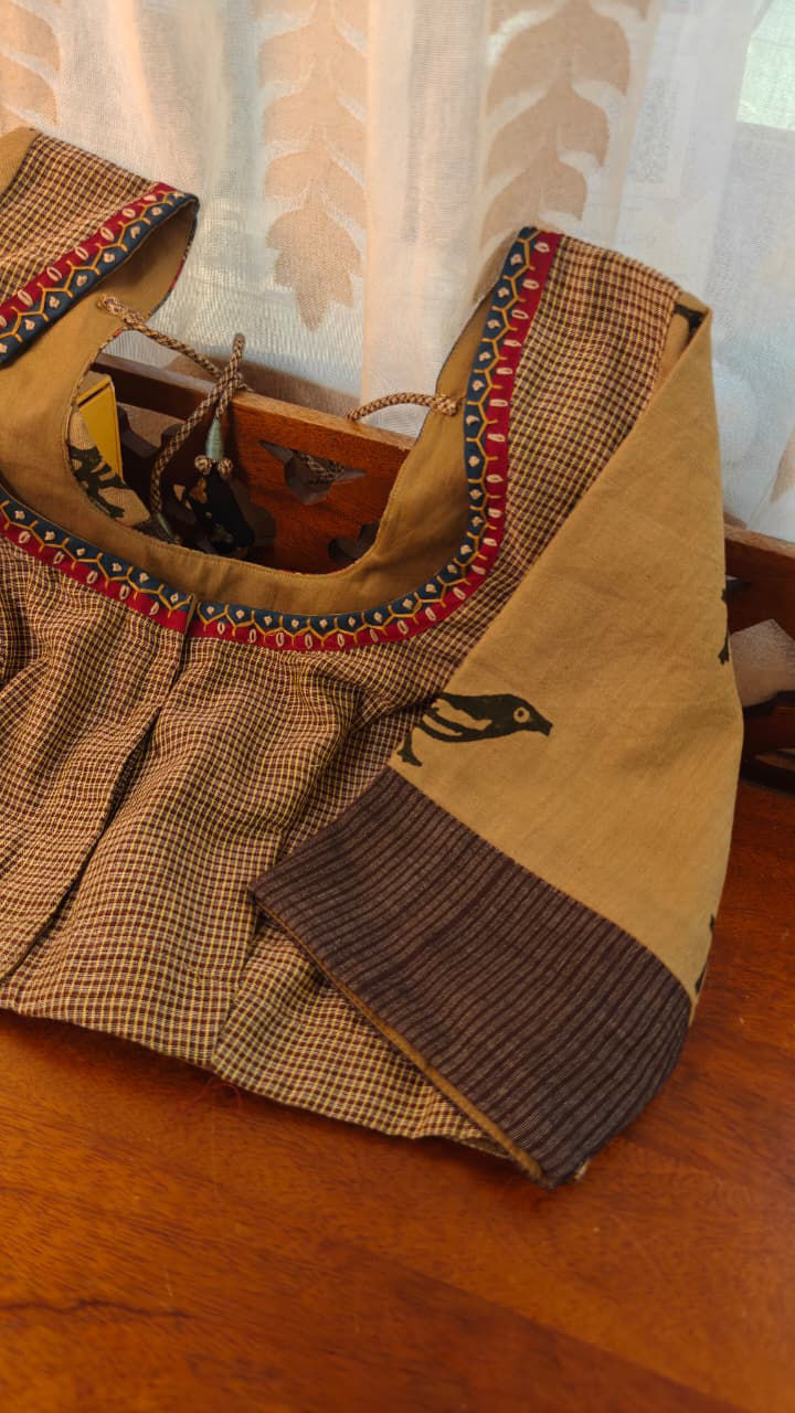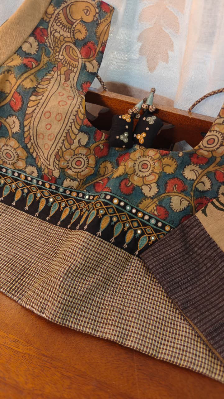 A thoughtful fusion of weaves in cotton — Kalamkari meets block-printed khadi. Delicate bird prints bring an old-world, earthy charm to the piece. Unusually ethnic, rooted in craft, and quietly distinctive.