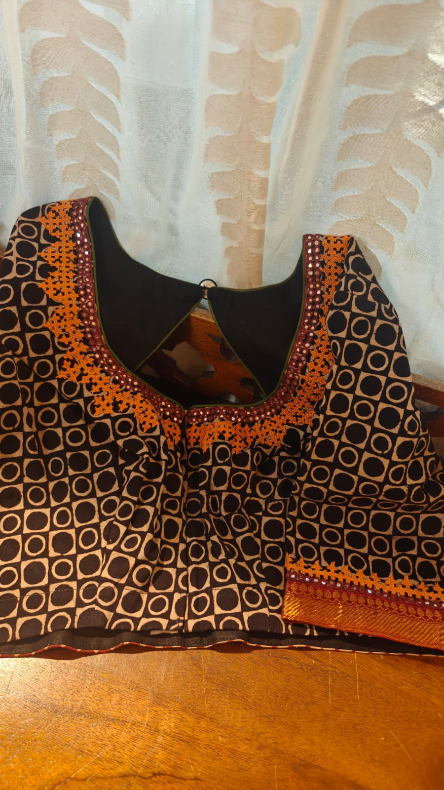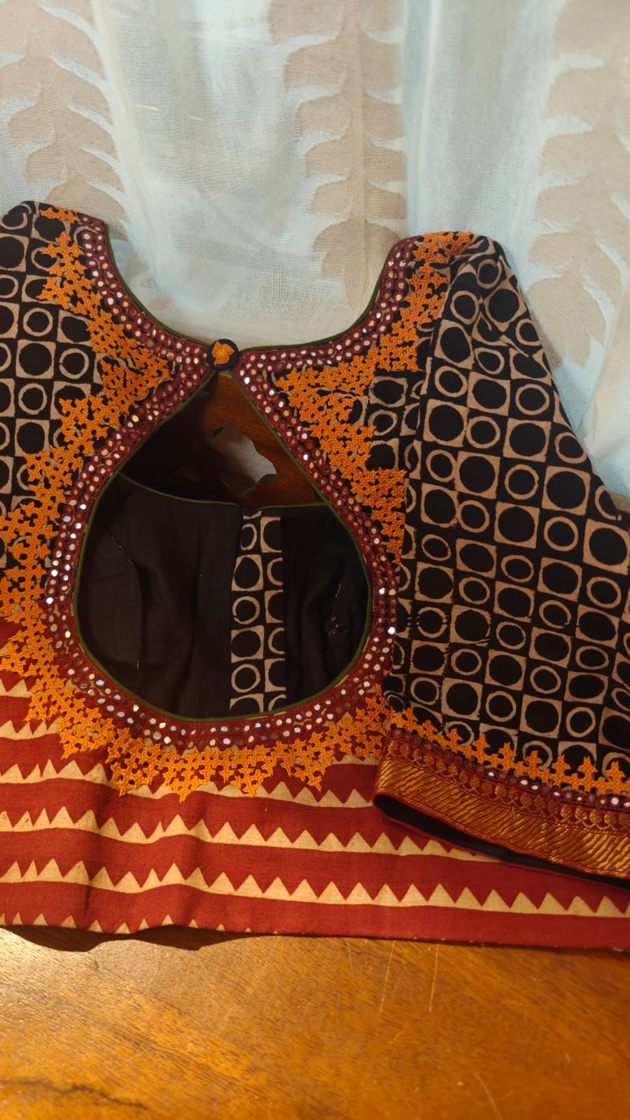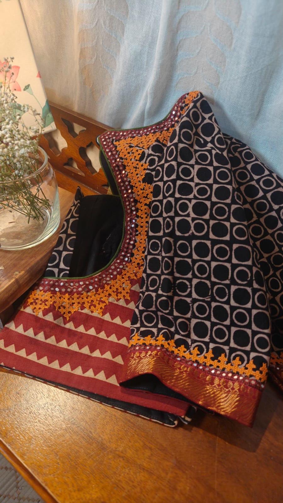 A beautiful cotton base adorned with traditional block prints and highlighted with vibrant Kutchi embroidery in golden yellow. The textured play of handcrafted prints and the striking hand embroidery creates a lively contrast, celebrating craft in its most authentic form. Rooted in heritage yet effortlessly wearable, this piece carries the quiet charm of handmade artistry
