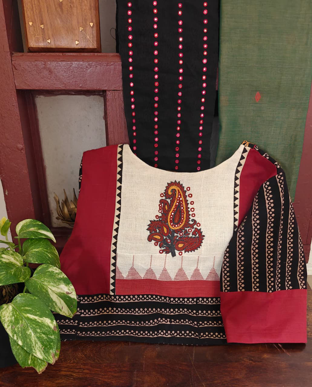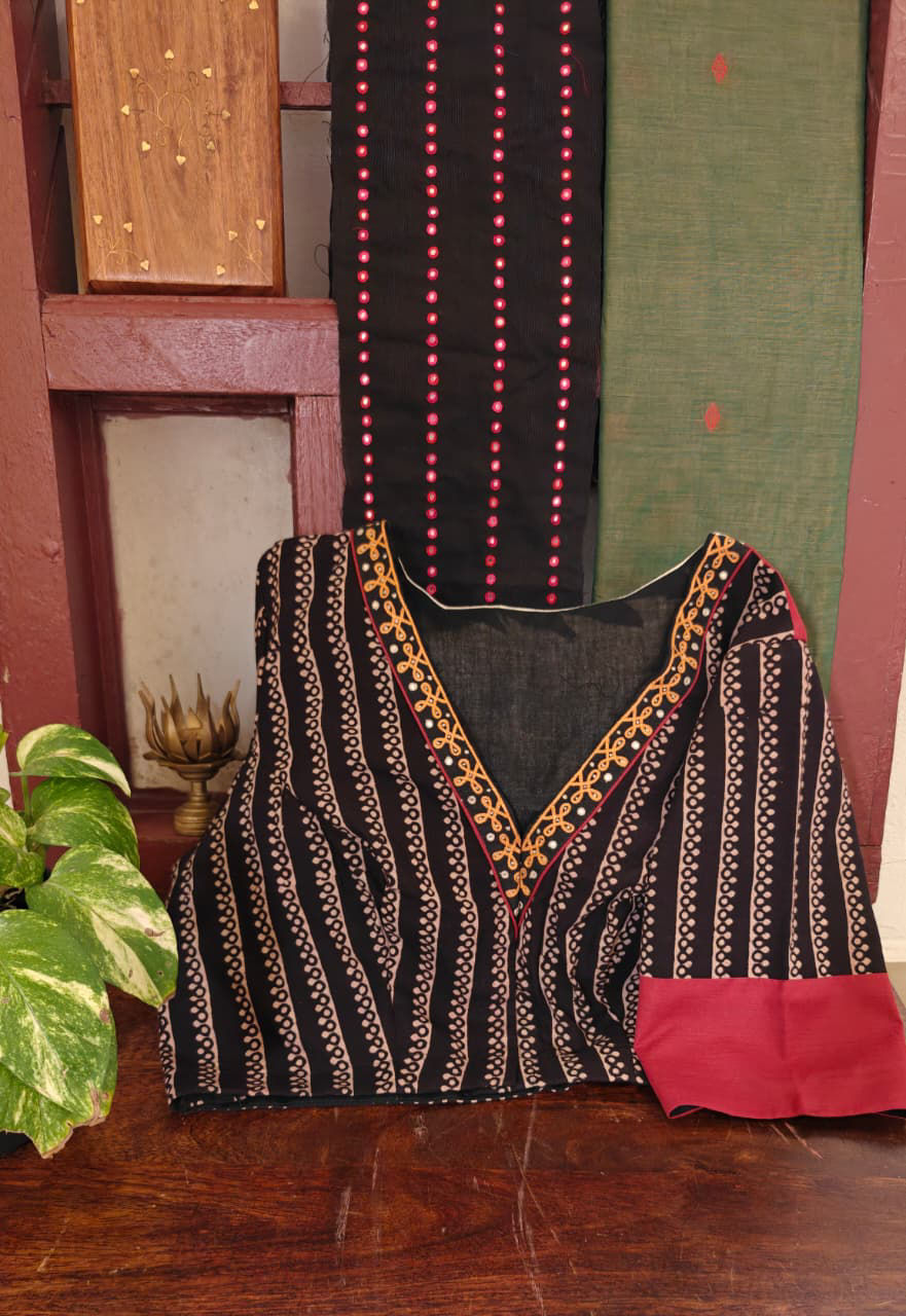Hand-blocked surfaces meet the quiet strength of Ponduru khadi. A paisley, patiently embroidered on the yoke, anchors the piece with tradition— earthy, tactile, and deeply rooted in craft.