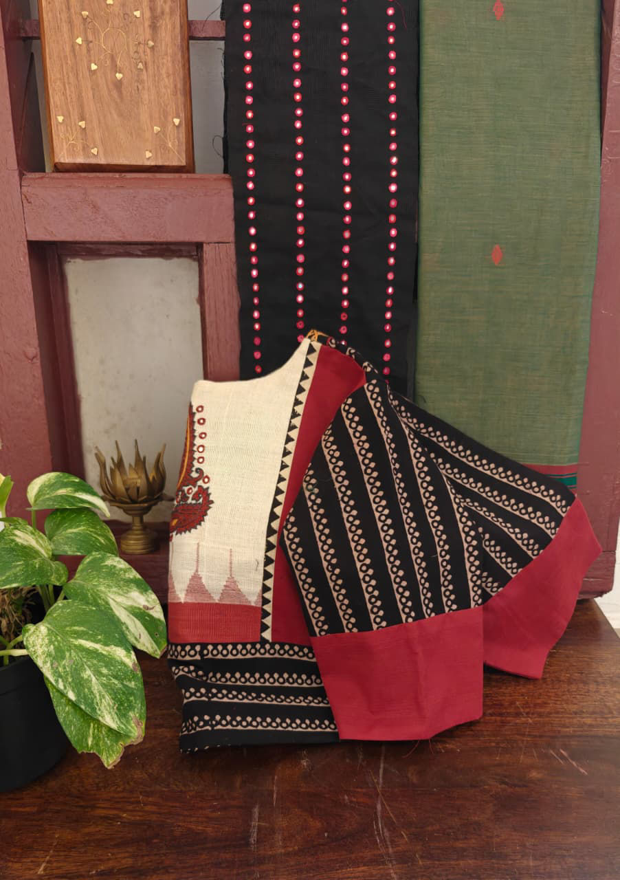 Our artisans creatively hand embroider, hand paint and hand print the blouses that come to you from the design house of SVASA. We use hand woven fabric extensively. You may notice very minute, almost insignificant flaws in the crafts since they are all handmade. We urge our patrons to overlook a few human errors that may have occurred in the process. Our aspirations are towards an empowered society, focusing on keeping traditional needlecraft alive for a long time to come.