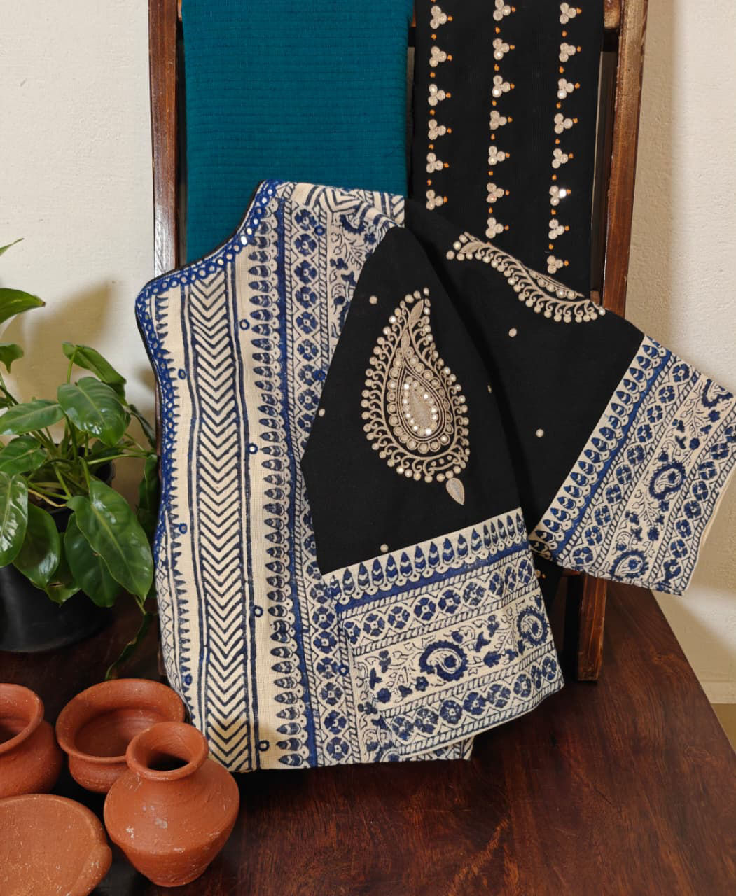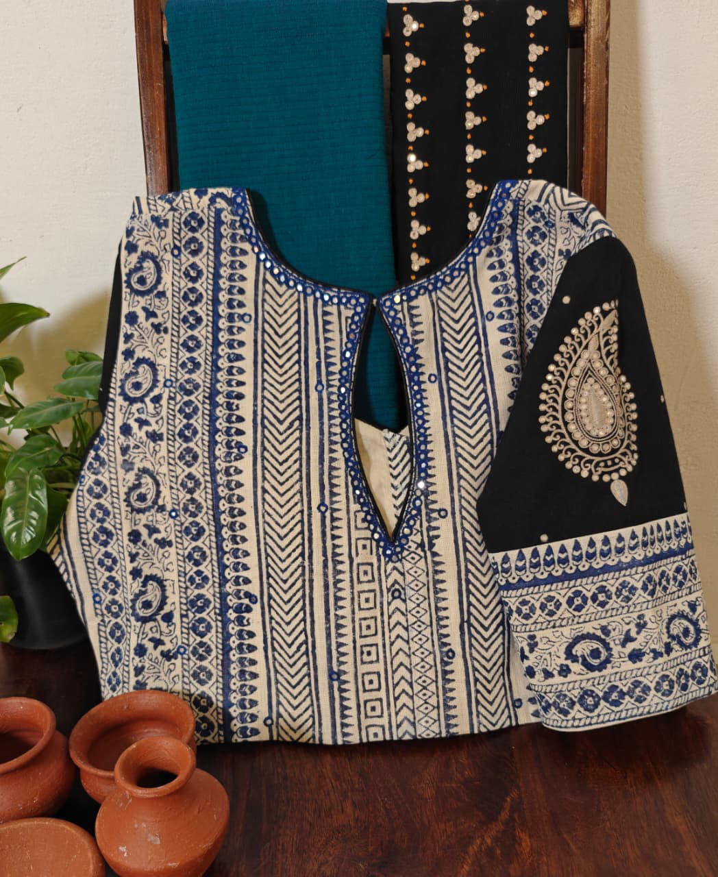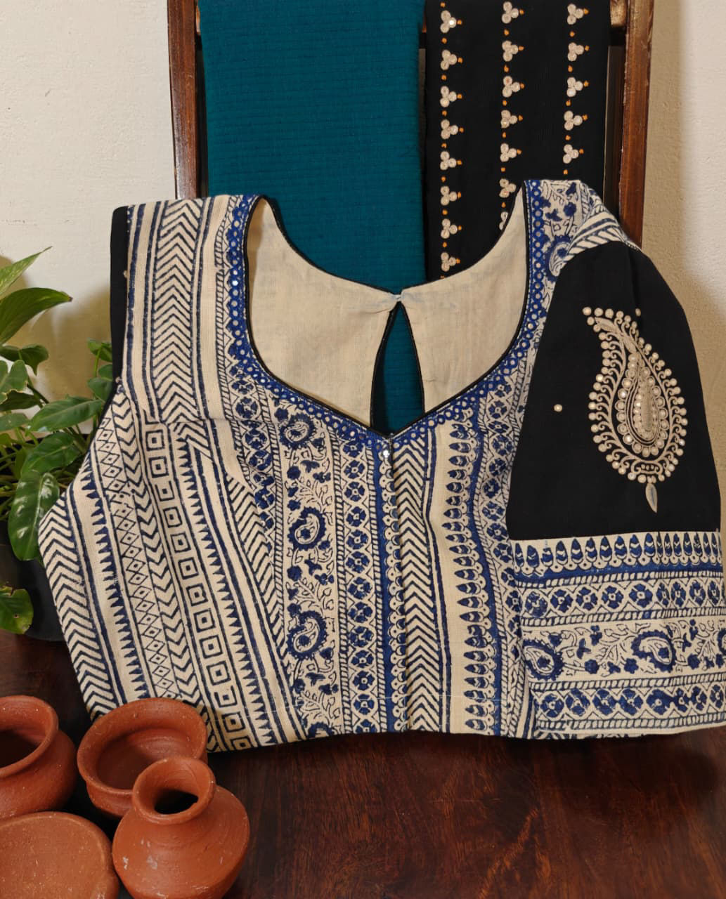 An in-house Svasa creation β€” ivory khadi block printed in blue. The sleeves carry our signature ambi motif in antique shades, making it subtle yet striking. A Svasa classic that blends tradition with quiet artistry. πŸͺ‘🌿
