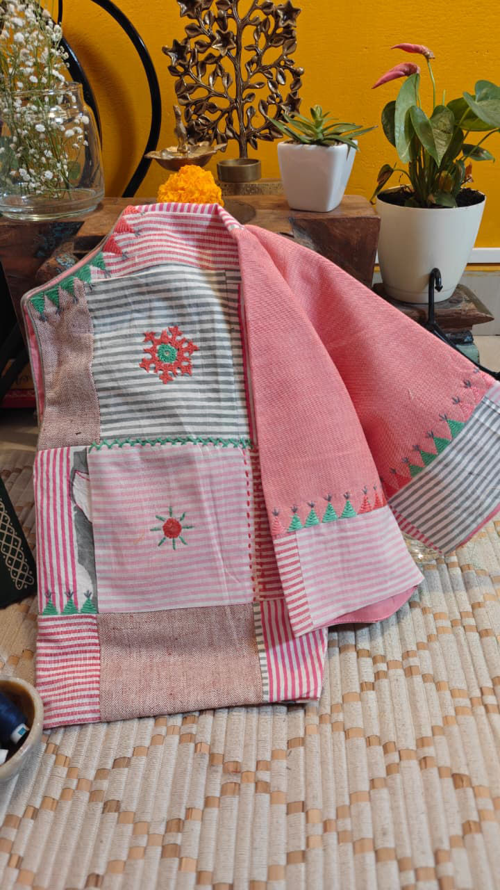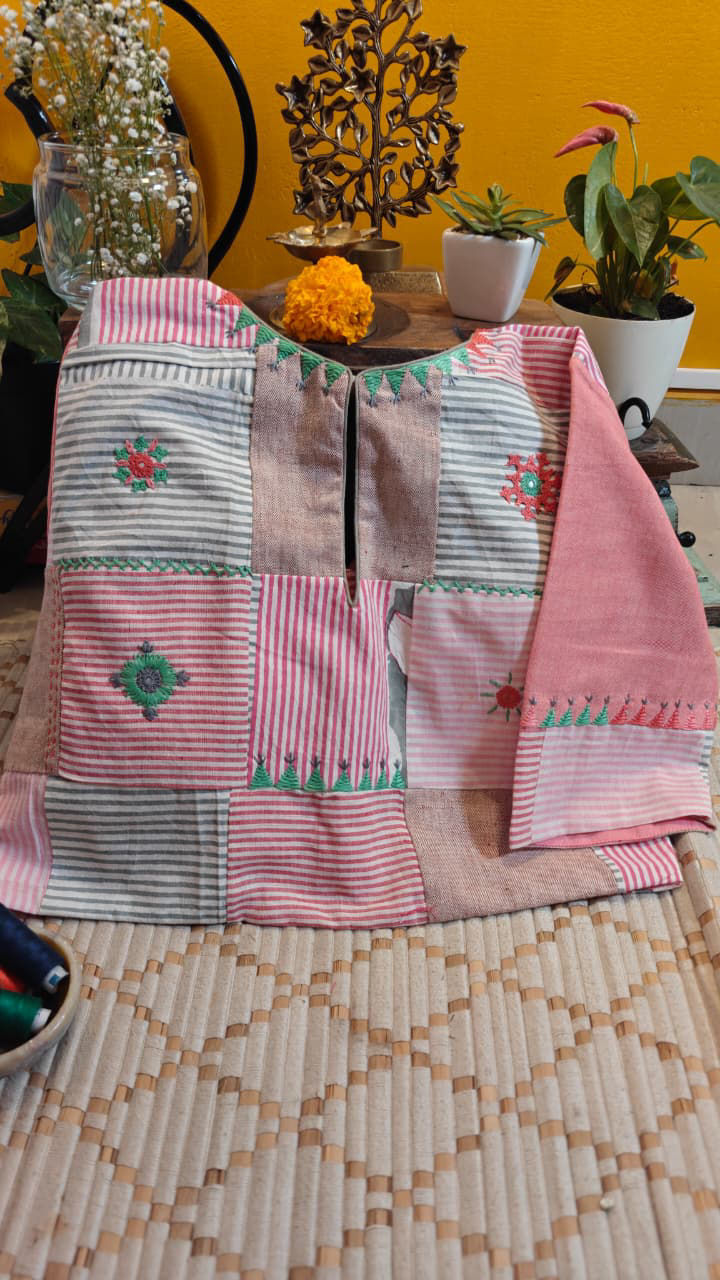 Pink weaves, thoughtfully fused together — layered, textured, and alive with quiet character. This piece brings together reclaimed fabrics, giving them new rhythm and purpose.