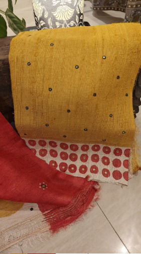 A classic tussar silk, hand block printed and layered with bold floral appliqué and delicate embroidery. A statement piece that’s both traditional and striking. We’ve paired it with a stitched blouse for styling inspiration and included an unstitched blouse for your imagination. Please note: stitched blouse is priced separately.